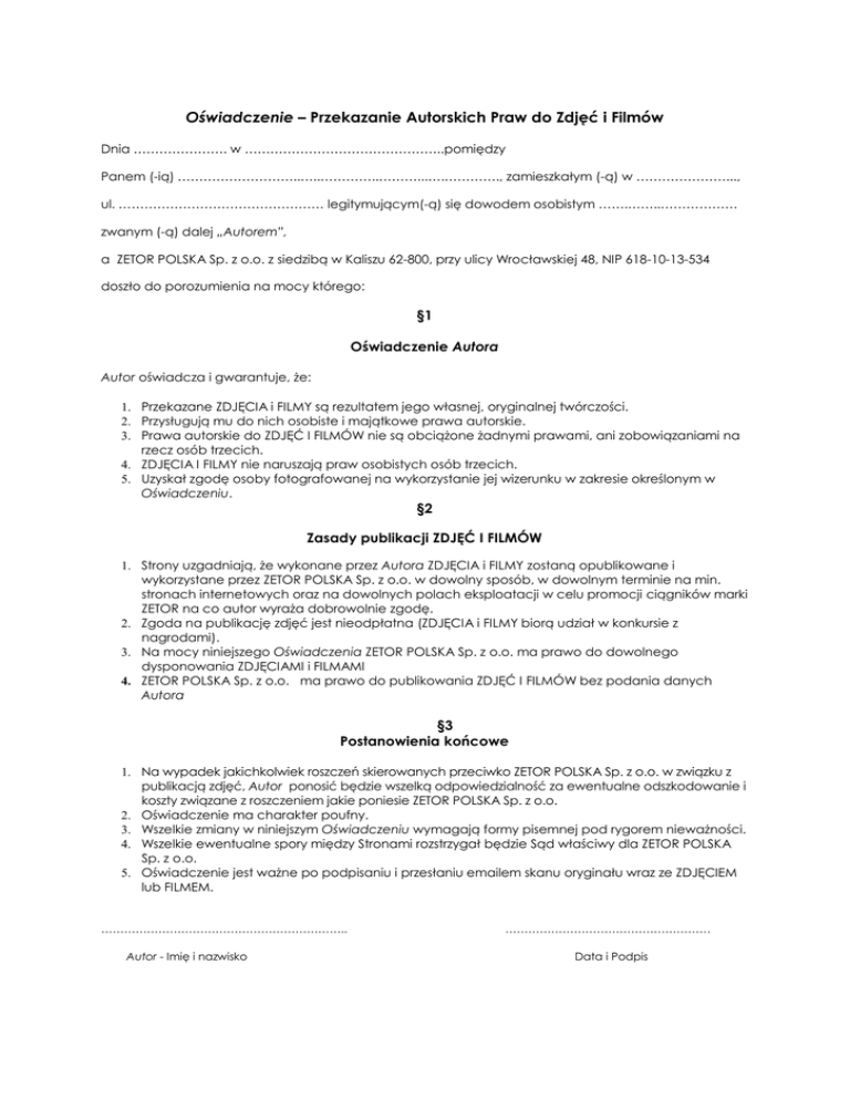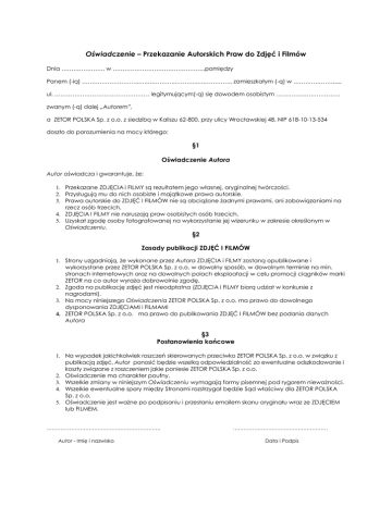 Oświadczenie – Przekazanie Autorskich Praw do Zdjęć i Filmów Dnia …………………. w ………………………………………..pomiędzy Panem (-ią) ………………………..…..…………..………...….…………., zamieszkałym (-ą) w …………………..., ul. ………………………………………… legitymującym(-ą) się dowodem osobistym …….……..……………… zwanym (-ą) dalej „Autorem”, a ZETOR POLSKA Sp. z o.o. z siedzibą w Kaliszu 62-800, przy ulicy Wrocławskiej 48, NIP 618-10-13-534 doszło do porozumienia na mocy którego: §1 Oświadczenie Autora Autor oświadcza i gwarantuje, że: 1. Przekazane ZDJĘCIA i FILMY są rezultatem jego własnej, oryginalnej twórczości. 2. Przysługują mu do nich osobiste i majątkowe prawa autorskie. 3. Prawa autorskie do ZDJĘĆ I FILMÓW nie są obciążone żadnymi prawami, ani zobowiązaniami na rzecz osób trzecich. 4. ZDJĘCIA I FILMY nie naruszają praw osobistych osób trzecich. 5. Uzyskał zgodę osoby fotografowanej na wykorzystanie jej wizerunku w zakresie określonym w Oświadczeniu. §2 Zasady publikacji ZDJĘĆ I FILMÓW 1. Strony uzgadniają, że wykonane przez Autora ZDJĘCIA i FILMY zostaną opublikowane i wykorzystane przez ZETOR POLSKA Sp. z o.o. w dowolny sposób, w dowolnym terminie na min. stronach internetowych oraz na dowolnych polach eksploatacji w celu promocji ciągników marki ZETOR na co autor wyraża dobrowolnie zgodę. 2. Zgoda na publikację zdjęć jest nieodpłatna (ZDJĘCIA i FILMY biorą udział w konkursie z nagrodami). 3. Na mocy niniejszego Oświadczenia ZETOR POLSKA Sp. z o.o. ma prawo do dowolnego dysponowania ZDJĘCIAMI i FILMAMI 4. ZETOR POLSKA Sp. z o.o. ma prawo do publikowania ZDJĘĆ I FILMÓW bez podania danych Autora §3 Postanowienia końcowe 1. Na wypadek jakichkolwiek roszczeń skierowanych przeciwko ZETOR POLSKA Sp. z o.o. w związku z publikacją zdjęć, Autor ponosić będzie wszelką odpowiedzialność za ewentualne odszkodowanie i koszty związane z roszczeniem jakie poniesie ZETOR POLSKA Sp. z o.o. 2. Oświadczenie ma charakter poufny. 3. Wszelkie zmiany w niniejszym Oświadczeniu wymagają formy pisemnej pod rygorem nieważności. 4. Wszelkie ewentualne spory między Stronami rozstrzygał będzie Sąd właściwy dla ZETOR POLSKA Sp. z o.o. 5. Oświadczenie jest ważne po podpisaniu i przesłaniu emailem skanu oryginału wraz ze ZDJĘCIEM lub FILMEM. ……………………………………………………….. Autor - Imię i nazwisko ……………………………………………… Data i Podpis
