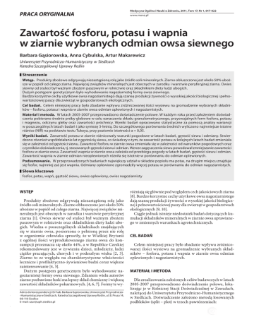 PRACA ORYGINALNA Medycyna Ogólna i Nauki o Zdrowiu, 2011, Tom 17, Nr 1, 017-022 www.monz.pl Zawartość fosforu, potasu i wapnia w ziarnie wybranych odmian owsa siewnego Barbara Gąsiorowska, Anna Cybulska, Artur Makarewicz Uniwersytet Przyrodniczo-Humanistyczny w Siedlcach Katedra Szczegółowej Uprawy Roślin Streszczenie Wstęp. Produkty zbożowe odgrywają niezastąpioną rolę jako źródło soli mineralnych. Ziarno obłuszczone jest około 50% uboższe w popiół od całego ziarna. Najwięcej związków mineralnych jest obecnych w zarodku i warstwie peryferyjnej ziarna. Owies siewny od stuleci był ważnym zbożem paszowym w rolnictwie oraz składnikiem diety ludzi ubogich. Dużym postępem genetycznym było wyhodowanie nagoziarnistej formy owsa siewnego. Bardzo korzystne cechy użytkowe owsa nagoziarnistego dają szansę produkcji żywności o wysokiej jakości biologicznej i pełnowartościowej paszy dla zwierząt w gospodarstwach ekologicznych. Cel badań. Celem niniejszej pracy było zbadanie wpływu zróżnicowanej ilości wysiewu na gromadzenie wybranych składników – fosforu, potasu i wapnia w ziarnie owsa odmian oplewionych i nagoziarnistych. Materiał i metoda. W latach 2005-2007 przeprowadzono doświadczenie polowe. W każdym roku przed założeniem doświadczenia pobierano średnie próby glebowe w celu oznaczenia składu granulometrycznego, przyswajalnych form fosforu, potasu i magnezu, odczynu gleby oraz zawartości próchnicy. Wyniki badań opracowano statystyczne za pomocą analizy wariancji w poszczególnych latach badań i jako syntezę 3-letnią. Do szczegółowego porównania średnich wyliczono najmniejsze istotne różnice (NIR) na podstawie testu Tukeya, przy poziomie istotności α = 0,05. Wyniki badań. Zawartość potasu w ziarnie różnicowały warunki pogodowe w latach badań, gęstość siewu i odmiany. Stwierdzono również współdziałanie lat z gęstością siewu, co świadczy o tym, że zawartość potasu w kolejnych latach badań zmieniała się w zależności od gęstości siewu. Zawartość fosforu w ziarnie owsa zmieniała się w zależności od warunków pogodowych oraz czynników doświadczenia, tj. stosowanych gęstości siewu i odmian. Wzrost zagęszczenia siewu powodował zmniejszanie zawartości fosforu w ziarnie owsa. Zawartość wapnia w ziarnie owsa zależała od przebiegu pogody w latach badań, gęstości siewu i odmian. Zawartość wapnia w ziarnie odmian nieoplewionych różniła się istotnie w porównaniu do odmian oplewionych. Podsumowanie. W przeprowadzonych badaniach największy udział w składzie popiołu ma potas, na drugim miejscu znajduje się fosfor, najmniej zaś jest wapnia. Odmiany oplewione zgromadziły więcej potasu w porównaniu do odmian nagoziarnistych. Słowa kluczowe fosfor, potas, wapń, gęstość siewu, owies oplewiony, owies nagoziarnisty - - - - - WSTĘP Produkty zbożowe odgrywają niezastąpioną rolę jako źródło soli mineralnych. Ziarno obłuszczone jest około 50% uboższe w popiół od całego ziarna. Najwięcej związków mineralnych jest obecnych w zarodku i warstwie peryferyjnej ziarna [1]. Owies siewny od stuleci był ważnym zbożem paszowym w rolnictwie oraz składnikiem diety ludzi ubogich. Wiedza o poszczególnych składnikach znajdujących się w ziarnie owsa, poszerzona o pełnioną przez nie rolę w organizmie człowieka sprawiły, że w Wielkiej Brytanii z ogólnej ilości wyprodukowanego ziarna owsa do konsumpcji przeznacza się około 44%, a w Republice Czeskiej rekomendowany jest w żywieniu dzieci, młodzieży, ludzi ciężko pracujących, chorych i w podeszłym wieku [2, 3]. Ziarno to ze względu na charakterystyczne właściwości lecznicze i profi laktyczno-żywieniowe budzi coraz większe zainteresowanie [4, 5]. Dużym postępem genetycznym było wyhodowanie nagoziarnistej formy owsa siewnego. Zdaniem wielu autorów ziarno pozbawione łuski ma lepszy skład chemiczny i większą zawartość składników pokarmowych. [4, 6, 7]. Formy te wyAdres do korespondencji: Dr hab. Barbara Gąsiorowska, Uniwersytet Przyrodniczo-Humanistyczny w Siedlcach, Katedra Szczegółowej Uprawy Roślin, ul. B. Prusa 14, 08-110 Siedlce E-mail: [email protected] różniają się głównie pod względem cech jakościowych ziarna [8]. Bardzo korzystne cechy użytkowe owsa nagoziarnistego dają szansę produkcji żywności o wysokiej jakości biologicznej i pełnowartościowej paszy dla zwierząt w gospodarstwach ekologicznych [9, 10]. Ciągle jednak istnieje niedostatek badań dotyczących kumulacji składników mineralnych w ziarnie owsa uprawianego w zmiennych warunkach agrotechnicznych. CEL BADAŃ Celem niniejszej pracy było zbadanie wpływu zróżnicowanej ilości wysiewu na gromadzenie wybranych składników – fosforu, potasu i wapnia w ziarnie owsa odmian oplewionych i nagoziarnistych. MATERIAŁ I METODA Dla zrealizowania założonych celów badawczych w latach 2005-2007 przeprowadzono doświadczenie polowe, lokalizując je w Rolniczej Stacji Doświadczalnej w Zawadach, należącej do Uniwersytetu Przyrodniczo-Humanistycznego w Siedlcach. Doświadczenie założono metodą losowanych podbloków (split – plot) w trzech powtórzeniach: 18 Medycyna Ogólna i Nauki o Zdrowiu, 2011, Tom 17, Nr 1, 017-022 Barbara Gąsiorowska, Anna Cybulska, Artur Makarewicz. Zawartość fosforu, potasu i wapnia w ziarnie wybranych odmian owsa siewnego W doświadczeniu uwzględniono następujące czynniki: I czynnik (podbloki I rzędu) – gęstość siewu: • 300 ziaren na 1m2, • 500 ziaren na 1m2, • 700 ziaren na 1m2. II czynnik (podbloki II rzędu) – odmiany owsa: • odmiany nagoziarniste – Akt, Polar, • odmiany oplewione – Cwał, Rajtar, Bachmat. W każdym roku przed założeniem doświadczenia pobierano średnie próby glebowe w celu oznaczenia składu granulometrycznego, przyswajalnych form fosforu, potasu i magnezu, odczynu gleby oraz zawartości próchnicy. Agrotechnikę owsa prowadzono zgod