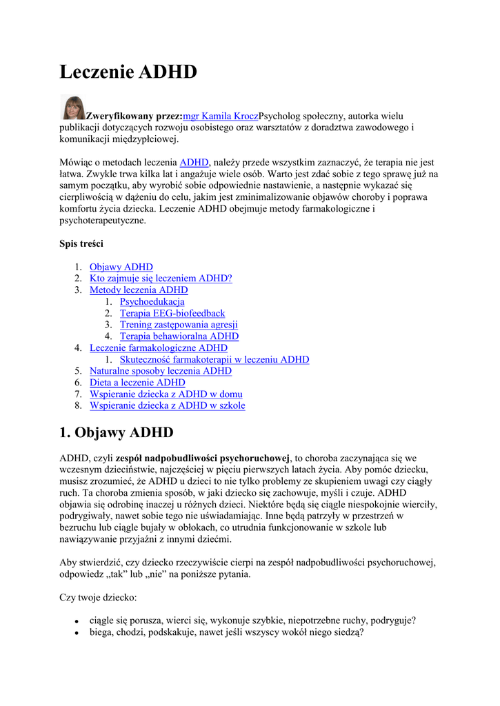 Leczenie ADHD Zweryfikowany przez:mgr Kamila KroczPsycholog społeczny, autorka wielu publikacji dotyczących rozwoju osobistego oraz warsztatów z doradztwa zawodowego i komunikacji międzypłciowej. Mówiąc o metodach leczenia ADHD, należy przede wszystkim zaznaczyć, że terapia nie jest łatwa. Zwykle trwa kilka lat i angażuje wiele osób. Warto jest zdać sobie z tego sprawę już na samym początku, aby wyrobić sobie odpowiednie nastawienie, a następnie wykazać się cierpliwością w dążeniu do celu, jakim jest zminimalizowanie objawów choroby i poprawa komfortu życia dziecka. Leczenie ADHD obejmuje metody farmakologiczne i psychoterapeutyczne. Spis treści 1. Objawy ADHD 2. Kto zajmuje się leczeniem ADHD? 3. Metody leczenia ADHD 1. Psychoedukacja 2. Terapia EEG-biofeedback 3. Trening zastępowania agresji 4. Terapia behawioralna ADHD 4. Leczenie farmakologiczne ADHD 1. Skuteczność farmakoterapii w leczeniu ADHD 5. Naturalne sposoby leczenia ADHD 6. Dieta a leczenie ADHD 7. Wspieranie dziecka z ADHD w domu 8. Wspieranie dziecka z ADHD w szkole 1. Objawy ADHD ADHD, czyli zespół nadpobudliwości psychoruchowej, to choroba zaczynająca się we wczesnym dzieciństwie, najczęściej w pięciu pierwszych latach życia. Aby pomóc dziecku, musisz zrozumieć, że ADHD u dzieci to nie tylko problemy ze skupieniem uwagi czy ciągły ruch. Ta choroba zmienia sposób, w jaki dziecko się zachowuje, myśli i czuje. ADHD objawia się odrobinę inaczej u różnych dzieci. Niektóre będą się ciągle niespokojnie wierciły, podrygiwały, nawet sobie tego nie uświadamiając. Inne będą patrzyły w przestrzeń w bezruchu lub ciągle bujały w obłokach, co utrudnia funkcjonowanie w szkole lub nawiązywanie przyjaźni z innymi dziećmi. Aby stwierdzić, czy dziecko rzeczywiście cierpi na zespół nadpobudliwości psychoruchowej, odpowiedz „tak” lub „nie” na poniższe pytania. Czy twoje dziecko: ciągle się porusza, wierci się, wykonuje szybkie, niepotrzebne ruchy, podryguje? biega, chodzi, podskakuje, nawet jeśli wszyscy wokół niego siedzą? ma problemy z czekaniem na swoją kolej, zarówno podczas zabawy, jak i rozmowy? nie kończy tego, co zaczęło? potrafi bardzo szybko znudzić się już bo kilku chwilach zabawy czy czynności? ciągle jest zamyślone na tyle, że masz wrażenie, iż żyje w innym świecie? mówi, kiedy inni starają się coś powiedzieć? działa, zanim zdąży pomyśleć? ciągle rozprasza się tym, co dzieje się wokół? ma ciągłe problemy z pracą na lekcjach i pracą domową? Jeśli na większość z tych pytań odpowiedź brzmi „tak”, lepiej zgłoś się z dzieckiem do lekarza. Tylko specjalista będzie potrafił trafnie zdiagnozować ADHD. Listę niepokojących zachowań dziecka weź ze sobą na wizytę. Pamiętaj, że objawy ADHD nie pojawiają się tylko w jednym miejscu (np. w szkole). To zaburzenie powoduje problemy niezależnie od miejsca, w którym dziecko się znajduje. Dziecko z ADHD może mieć problemy nie tylko z nauką, ale i nawiązywaniem przyjaźni oraz kontaktem z rodzicami. 2. Kto zajmuje się leczeniem ADHD? Dziecko z zespołem ADHD powinno przede wszystkim być pod opieką lekarza psychiatry. Nie jest to jednak jedyna osoba, która zajmuje się leczeniem tych zaburzeń. W zespole terapeutycznym powinni się również znaleźć psycholog oraz pedagog. Jak widać, dzieci z ADHD wymagają kompleksowego leczenia. Natomiast nie jest to jeszcze pełna lista osób, których pomoc jest potrzebna dla uzyskania efektów terapii. Ważne jest, aby pamiętać, jak ogromną rolę odgrywają nauczyciele oraz rodzina dziecka. Z tego względu prowadzone są dla nich specjalne programy edukacyjne. Odpowiednie przeszkolenie osób z otoczenia dziecka może w bardzo dużym stopniu pomóc w stworzeniu dla niego warunków, w których łatwiej mu będzie funkcjonować, a w efekcie zmniejszyć ilość oraz nasilenie objawów. Ważne jest również, aby zachowany był stały kontakt między zespołem terapeutycznym a rodzicami dziecka i jego nauczycielami. 3. Metody leczenia ADHD Terapia ADHD jest wielokierunkowa. Oznacza to, że w jej skład wchodzi leczenie dziecka, jak również działania edukacyjne skierowane do rodziców oraz nauczycieli. Warto jest przede wszystkim uzmysłowić sobie, jakie są cele leczenia. Ogólnie mówiąc, ma ono doprowadzić do zmniejszenia objawów ADHD, zmniejszenia objawów współistniejących (np. dysleksji, dysgrafii) oraz zmniejszenia ryzyka późniejszych powikłań. W skład terapii ADHD wchodzą: terapia behawioralna – celem tej terapii jest modyfikowanie zachowań dziecka, co ma w efekcie doprowadzić do wyciszenia złych zachowań, a wzmocnienia dobrych; jedna z najbardziej skutecznych terapii; psychoedukacja na temat przyczyn, objawów, leczenia ADHD, co ma pomóc dziecku w zdjęciu z siebie poczucia winy; praca na pozytywnych wzmocnieniach ma pomóc dziecku w podwyższeniu własnej samooceny oraz zwiększeniu motywacji do pracy; ustalenie systemu zasad oraz konsekwencji ich nieprzestrzegania w różnych środowiskach (np. dom, szkoła); nauczanie wyrównawcze – są to dodatkowe zajęcia, które mają pomóc dziecku wyrobić w sobie pewne nawyki, które będą mu pomagały w uczestniczeniu w zajęciach; stworzenie strategii ułatwiających radzenie sobie z objawami chorobowymi; zajęcia z logopedą – często wśród dzieci z nadpobudliwością występują zaburzenia mowy, takie jak jąkanie – w takich przypadkach terapia mowy jest niezbędna; terapia zajęciowa – ukierunkowana z reguły na rozwój motoryczny dziecka; trening umiejętności społecznych; terapia zaburzeń uwagi; terapia indywidualna – może okazać się potrzebna w przypadku dzieci, u których dołączają się objawy depresyjne lub nerwicowe; niekiedy pomocna okazuje się terapia rodzinna, trening umiejętności rodzicielskich i poradnictwo rodzinne, jeżeli wyraźne są nieprawidłowości dotyczące relacji poszczegó