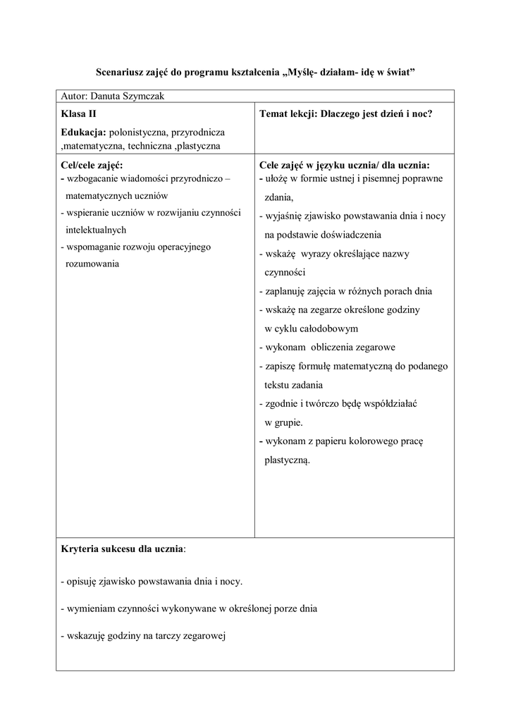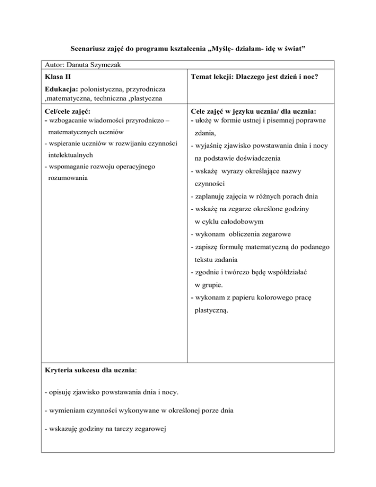 Scenariusz zajęć do programu kształcenia „Myślę- działam- idę w świat” Autor: Danuta Szymczak Klasa II Temat lekcji: Dlaczego jest dzień i noc? Edukacja: polonistyczna, przyrodnicza ,matematyczna, techniczna ,plastyczna Cel/cele zajęć: - wzbogacanie wiadomości przyrodniczo – matematycznych uczniów - wspieranie uczniów w rozwijaniu czynności intelektualnych - wspomaganie rozwoju operacyjnego rozumowania Cele zajęć w języku ucznia/ dla ucznia: - ułożę w formie ustnej i pisemnej poprawne zdania, - wyjaśnię zjawisko powstawania dnia i nocy na podstawie doświadczenia - wskażę wyrazy określające nazwy czynności - zaplanuję zajęcia w różnych porach dnia - wskażę na zegarze określone godziny w cyklu całodobowym - wykonam obliczenia zegarowe - zapiszę formułę matematyczną do podanego tekstu zadania - zgodnie i twórczo będę współdziałać w grupie. - wykonam z papieru kolorowego pracę plastyczną. Kryteria sukcesu dla ucznia: - opisuję zjawisko powstawania dnia i nocy. - wymieniam czynności wykonywane w określonej porze dnia - wskazuję godziny na tarczy zegarowej Podstawa programowa: 1.1)a), 1.1)b), 1.2)a), 1.3)a),1.3c) 1.3)f), 4.2b),5.4), 6.1), 7.8) 7.15),9.2c) Metody pracy: pokaz, metoda ćwiczeń i praktycznego działania, ewaluacyjna, zabawa ruchowa , zabawa dydaktyczna, Formy pracy: zbiorowa, indywidualna, grupowa zróżnicowana. Środki dydaktyczne: chusta Klanzy, karteczki samoprzylepne, karty pracy, globus, latarka, plastelina, sznurki, zegar papierowy, wycinki z gazet, kartka papieru A3, klej, nożyczki, kredki, ścinki materiałów Przebieg zajęć „Drogowskazy” -wskazówki i uwagi o realizacji Centra Aktywnej Edukacji 1. Wprowadzenie do zajęć – zabawa :”Wiązanie koła po ciemku”. artystycznoUczniowie z zasłoniętymi oczami, podzieleni na dwa rzędy stoją pod ruchowe przeciwległymi ścianami sali. Na sygnał nauczyciela cała grupa stara się dojść w miarę równomiernie do środka sali i utworzyć koło z wzajemnie złączonych rąk. Po wykonaniu zadania nauczyciel pyta, jakie są odczucia uczniów? 2. Ćwiczenia w tworzeniu wyrazów przeciwstawnych Wszystkie dzieci stoją w kręgu, trzymając chustę Klanzy. Nauczyciel artystycznokładzie na chuście piłkę i mówi wyraz .Jednocześnie wskazuje do ruchowe kogo ma ona dotrzeć. Uczniowie poruszają materiałem ,tak by piłka dotarła do wyznaczonej osoby ,która podaje wyraz o znaczeniu przeciwnym np.: wesoło-smutno, ciepło-zimno, chory-zdrowy, ciemno-jasno. 3.Nauczyciel skupia uwagę uczniów na dwóch wyrazach: ciemno, jasno. Przypina je do tablicy i prosi ,aby uczniowie zapisali na kartkach skojarzenia z tymi wyrazami. Wokół wyrazów tworzymy słoneczka ,odczytujemy wszystkie wyrazy. polonistycznokomunikacyjne 4. Próba sformułowania celów lekcji przez uczniów, określenie kryterium sukcesu. Wykonanie zadania na karcie pracy (załącznik nr1) 5. Odwołanie się do dotychczasowych wiadomości uczniów na temat występowania dnia i nocy. Nauczyciel poleca także wybrać ze zgromadzonych na stoliku przedmiotów te, które będą potrzebne do realizacji tematu ( np.: globus, latarka) matematycznoprzyrodnicze 6. Wyjaśnienie zjawiska powstawania dnia i nocy. Odszukanie przez uczniów na globusie- Polski, zaznaczenie tego miejsca za pomocą kolorowej naklejki lub plasteliny. Demonstracja ruchu wirowego Ziemi. Uczniowie zauważają, matematycznoprzyrodnicze że podczas obrotów globusa znika im z oczu zaznaczone miejsce. Jeśli jest możliwość zasłaniamy okna w klasie Nauczyciel oświetla globus lampką. Dzieci zauważają, że zaznaczone miejsce jest oświetlone lub zacieniona. Na podstawie obserwacji uczniowie formułują wniosek: Na półkuli, która jest oświetlona występuje dzień, na nieoświetlonej występuje noc. Uzupełnienie karty pracy (załącznik nr 2) 7. Nauczyciel czyta uczniom zagadkę ,prosi o podanie rozwiązania polonistycznokomunikacyjne Mówią, że leci, płynie, ucieka, choć to nie ptaszki ani nie rzeka. Nikt go w ucieczce tej nie dogoni, Chociaż by pędził i na sto koni. Kto go nie cenił, później sie smuci, Bo gdy ucieknie, to już nie wróci. Jeśli nie zając, rzeka, nie ptaki, Może zgadniecie, kto to taki? Nauczyciel zwraca się do uczniów by podkreślili w tekście wyrazy, które oznaczają czynności wykonywane przez czas. Wyjaśnia, że wyrazy te nazywamy czasownikami. 8. Próby sformułowania przez uczniów odpowiedzi na pytania: Ile czasu trwa obrót Ziemi wokół własnej osi? – Co to jest doba? matematycznoprzyrodnicze – Co się dzieje na Ziemi w ciągu doby? Nauczyciel dzieli uczniów na grupy. Przypomina godziny określające daną porę dnia Dzieci mają za zadanie wymienić jak najwięcej czynności, wykonywanych w określonej porze: rano, przed południem, w południe, po południu, wieczorem oraz w nocy Każda grupa wymienia czynności, które wykonują. 9. Wykonanie zegara (jest w każdej wyprawce dla ucznia). Wprowadzenie tarczy 24-godzinnej.Nauczyciel poleca ustawić wskazówki zegara na godz.12.00,zadaje uczniom pytanie: - Czy patrząc tylko na zegar, można się zorientować, czy jest 12.00 w dzień, czy w nocy? Wyjaśnienie zasad odczytywania godzin na zegarze. Odczytywanie godzin na zegarze z tarczą 24-godzinną. Obliczenia zegarowe na tarczy 24 godzinnej. • Odczytajcie godziny, które ustawię na swoim zegarze. – Ustawcie swoje zegary na podane godziny i powiedzcie, która to część doby: np.: 9.00, 12.00, 15.00, 19.00, 23.00, 3.00.17.00 10.Praktyczne i teoretyczne rozwiązywanie zadań związanych z obliczeniami czasu Zadania matematyczne Nauczyciel ustawia zegar na godzinę 9.00 i mówi:. W południe jest polonistycznokomunikacyjne matematycznoprzyrodnicze matematycznoprzyrodnicze obiad. Za ile to godzin? Uczniowie wykonują działania praktyczne na swoich zegarach Nauczyciel zapisuje pierwsze działanie: 9 + c =12 Na zegarze dzieci odliczają godziny od 9 do 12 i uzupełniają działan