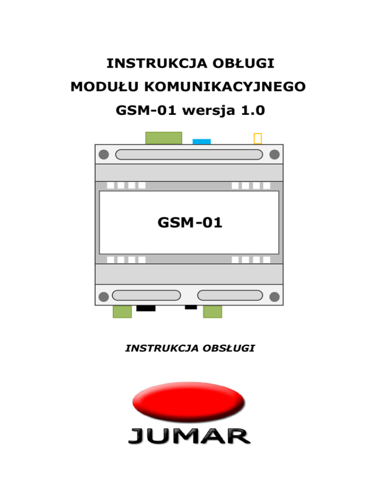 MODEM GSM-01 INSTRUKCJA OBŁUGI MODUŁU KOMUNIKACYJNEGO GSM-01 wersja 1.0 GSM-01 INSTRUKCJA OBSŁUGI -1- MODEM GSM-01 -2- MODEM GSM-01 Spis treści 1. Wymagania....................................................................................................5 2. Komendy SMS.................................................................................................5 3. Konfiguracja przez SMS..................................................................................6 4. Łączenie modułu GSM aplikacją (serwerem)..................................................8 5. Kody USSD.....................................................................................................9 -3- MODEM GSM-01 Dziękujemy za wybór naszego produktu. Niniejsza instrukcja ma na celu ułatwić Państwu instalację oprogramowania oraz zapoznać się z obsługą. Przed instalacją prosimy o dokładne przeczytanie instrukcji i zapoznanie się z działaniem oprogramowania. W przypadku pytań prosimy o kontakt z firmą JUMAR. P.P.U.H JUMAR Jerzy Podhajski ul. Opawska 112 47-400 Racibórz tel./fax 32-415-80-39 tel. 32-415-54-24 e-mail: [email protected] www.ju-mar.eu -4- MODEM GSM-01 1. Wymagania • Aktywna karta SIM operatora bez kodu PIN, • Aktywowana usługa GPRS • nazwy APN operatora, • Skonfigurowany serwer, sieć internetowa oraz zainstalowane oprogramowanie, • Numer IP serwera • Numer portu serwera • Telefon z możliwością odbierania i wysyłania wiadomości SMS. 2. Komendy SMS Słowo kluczowe Opis Wartość domyślna status? Odsyła SMS zwrotny po wysłaniu kodu USSD. ---- config? Odsyła SMS zwrotny z aktualną konfiguracją. ---- pin Numer PIN urządzenia . 1111 NEWPIN Zmiana numeru PIN urządzenia. ---- ip Zmiana numeru IP serwera z zainstalowaną aplikacją. port Zmiana numeru portu IP serwera z zainstalowaną aplikacją. 8888 apnname Zmiana nazwy APN operatora GSM internet apnuser Zmiana nazwy użytkownika APN operatora GSM internet apnpass Zmian nazwy hasła APN operatora GSM phone Zmiana numeru telefonu właściciela urządzenia. ussd Kod USSD operatora m.in. do sprawdzenia ważności konta. autoconnect Tryb łączenia z GPRS (internet): 0-nie połączony, 1-stale połączony, 2-połączony raz -5- 0 MODEM GSM-01 3. Konfiguracja przez SMS Użytkownik może skonfigurować urządzenie na kilka sposobów. Do skonfigurowania urządzenia potrzebny jest telefon z możliwością wysyłania i odbierania SMSów. W urządzeniu (module GSM) musi znajdować się karta SIM bez numeru PIN karty oraz z odblokowaną funkcją połączenia GPRS. Sposób I: Z telefonu wysyłamy wiadomość SMS o treści: pin=1111,config? pod numer telefonu karty znajdującej się w module GSM. Po chwili powinniśmy otrzymać wiadomość SMS z aktualną konfiguracją: ip=, port=8888, apnname=internet, apnuser=internet, apnpass=, autoconnect=0, Następnie kopiujemy SMS i uzupełniamy/zmieniamy pola. Należy pamiętać, aby zawsze przed wysłaniem dodać numer PIN urządzenia na początku wiadomości !!! Przykład SMSa konfiguracyjnego: pin=1111, ip=98.107.20.43, port=8888, apnname=internet, apnuser=internet, apnpass=, autoconnect=0, -6- MODEM GSM-01 UWAGA! Zamiast numeru IP możemy wpisać również nazwę domeny pod której znajduje się serwer z zainstalowanym adresem oprogramowaniem np.:www.jumar.noip.com. Nazwy APN są podane na stronach operatorów GSM lub w salonach operatorów. Zestawienie serwerów APN dostępne jest również na stronie: www.vysoo.com/apn.php Sposób II: Z telefonu wysyłamy SMS o treści stworzonej przez użytkownika bazując na zestawie komend z tabeli „Komendy SMS”. Jeśli chcemy zmienić tylko jedno pole (np. numer IP) nie trzeba wysyłać wszystkich komend. Przykładowy SMS zmieniający tylko numer IP serwera wygląda następująco: pin=1111,ip=98.107.20.43, Każda następna komenda musi być oddzielona znakiem „,”. Możliwe jest wysłanie jednorazowo wszystkich komend z tabeli „Komendy SMS”. Producent zaleca konfiguracji. Kod również PIN zmianę należy kodu PIN zapamiętać, urządzenia gdyż przy pierwszej przywracanie nastaw fabrycznych możliwe jest tylko przez serwis. Zmiana kodu PIN można wykonać wysyłając wiadomość SMS o treści: pin=1111,NEWPIN=1234 Po wysłaniu komendy moduł GSM będzie przyjmował komendy tylko z nowym numerem PIN. -7- MODEM GSM-01 4. Łączenie modułu GSM z aplikacją (serwerem) Domyślnie urządzenie po skonfigurowaniu nie inicjuje połączenia z internetem poprzez GPRS. Użytkownik sam decyduje kiedy i jak ma się łączyć z serwerem. Istnieją dwa sposoby zainicjalizowania połączenia: Sposób I: Z telefonu wysyłamy wiadomość SMS o treści: pin=1111,autoconnect=2, Urządzenie automatycznie zacznie nawiązywać połączenie z serwerem. Warunkiem połączenia jest prawidłowe skonfigurowanie modułu GSM (APNy), prawidłowa konfiguracja sieci serwera oraz uruchomiona i skonfigurowana aplikacja na serwerze. Ustawienie autoconnect=2 powoduje jednokrotnie nawiązanie połączenia. Zerwanie połączenia lub rozłączenie klienta przez aplikacje powoduje stałe rozłączenie. Nawiązanie kolejnej próby wiąże się z ponownym wysłaniem wiadomości SMS podanej powyżej. Ustawienie autoconnect=1 powoduje stałe nawiązywanie połączenia. Zerwanie połączenia lub rozłączenie klienta przez aplikacje powoduje uruchomienie ponownej próby nawiązania połączenia. Ustawienie autoconnect=0 powoduje natychmiastowe rozłączenie. Sposób II: Połączenie można również zainicjalizować dzwoniąc pod numer telefonu modułu GSM. Należy zestawić połączenie głosowe, a następnie czekać na odrzucenie połączenia przez moduł GSM. Ten sposób inicjuje tylko jednokrotne nawiązanie połączenia z serwerem – patrz tryb „autoconnect=2”. Domyślnie urządzenie skonfigurowane jest tak, aby inicjalizować połączenie z dowolnego numeru telefonu. Można jednak skonfigurować modem tak, aby ignorował inne połączenia, a zestawi