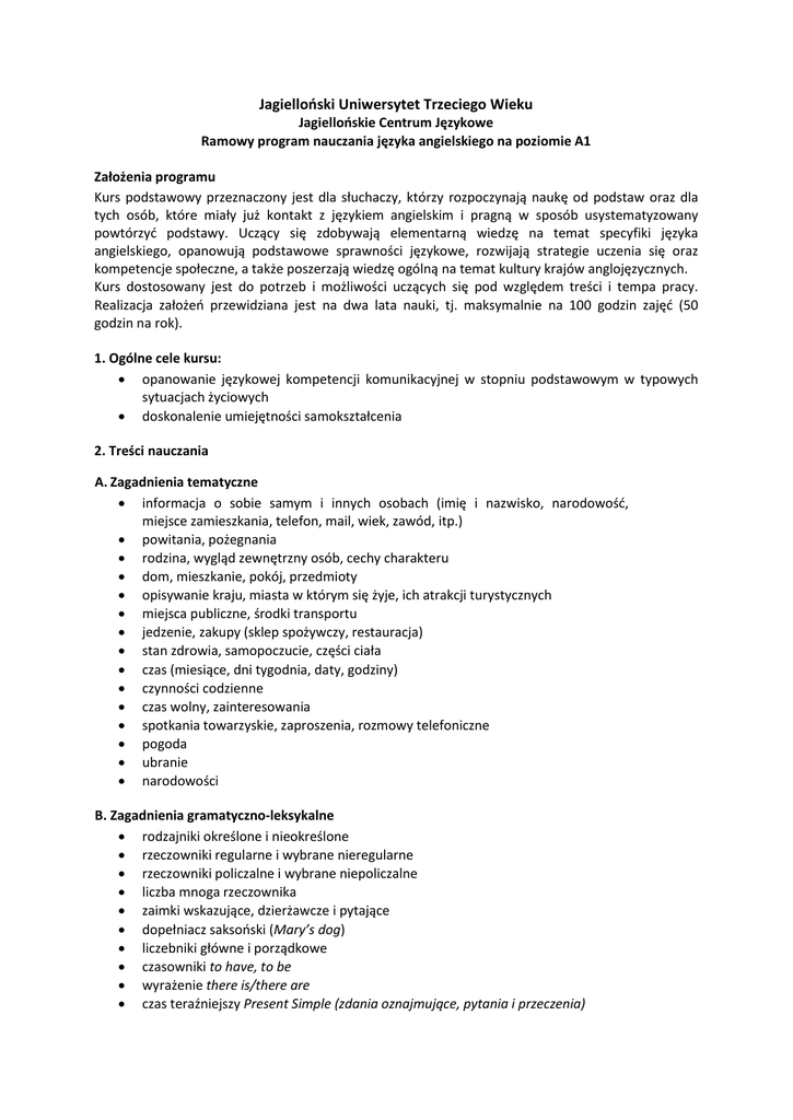 Jagielloński Uniwersytet Trzeciego Wieku Jagiellońskie Centrum Językowe Ramowy program nauczania języka angielskiego na poziomie A1 Założenia programu Kurs podstawowy przeznaczony jest dla słuchaczy, którzy rozpoczynają naukę od podstaw oraz dla tych osób, które miały już kontakt z językiem angielskim i pragną w sposób usystematyzowany powtórzyć podstawy. Uczący się zdobywają elementarną wiedzę na temat specyfiki języka angielskiego, opanowują podstawowe sprawności językowe, rozwijają strategie uczenia się oraz kompetencje społeczne, a także poszerzają wiedzę ogólną na temat kultury krajów anglojęzycznych. Kurs dostosowany jest do potrzeb i możliwości uczących się pod względem treści i tempa pracy. Realizacja założeń przewidziana jest na dwa lata nauki, tj. maksymalnie na 100 godzin zajęć (50 godzin na rok). 1. Ogólne cele kursu: opanowanie językowej kompetencji komunikacyjnej w stopniu podstawowym w typowych sytuacjach życiowych doskonalenie umiejętności samokształcenia 2. Treści nauczania A. Zagadnienia tematyczne informacja o sobie samym i innych osobach (imię i nazwisko, narodowość, miejsce zamieszkania, telefon, mail, wiek, zawód, itp.) powitania, pożegnania rodzina, wygląd zewnętrzny osób, cechy charakteru dom, mieszkanie, pokój, przedmioty opisywanie kraju, miasta w którym się żyje, ich atrakcji turystycznych miejsca publiczne, środki transportu jedzenie, zakupy (sklep spożywczy, restauracja) stan zdrowia, samopoczucie, części ciała czas (miesiące, dni tygodnia, daty, godziny) czynności codzienne czas wolny, zainteresowania spotkania towarzyskie, zaproszenia, rozmowy telefoniczne pogoda ubranie narodowości B. Zagadnienia gramatyczno-leksykalne rodzajniki określone i nieokreślone rzeczowniki regularne i wybrane nieregularne rzeczowniki policzalne i wybrane niepoliczalne liczba mnoga rzeczownika zaimki wskazujące, dzierżawcze i pytające dopełniacz saksoński (Mary’s dog) liczebniki główne i porządkowe czasowniki to have, to be wyrażenie there is/there are czas teraźniejszy Present Simple (zdania oznajmujące, pytania i przeczenia) zaimki dopełnienia bliższego i dalszego przymiotniki dzierżawcze przysłówki częstotliwości, np. never, always, usually, sometimes wyrażenie how much/how many wyrażenie I’d like to czasowniki modalne can, can’t, should, shouldn’t określniki any, some, a lot, much, many tryb rozkazujący (nakazy i zakazy) przyimki on, in, at, with, over, under, by czas przeszły Simple Past czas przeszły Simple Past czasowników to have i to be przymiotniki dzierżawcze (my, his, itp.) czas Present Continuous spójniki and, but, because C. Funkcje językowe witanie i żegnanie się Hello, Hi, Good morning …. przedstawianie siebie i reagowanie na przedstawianie nas przez inne osoby What’s your name? How are you? My name is Peter. I live in Poland. This is Mary. Pleased to meet you. użycie liczebników We have 30 cats. My sister is 60. pytanie i udzielanie informacji na temat podstawowych danych osobowych takich jak imię i nazwisko, narodowość, zawód, stan cywilny, adres, mail, telefon What’s your address/job/nationality? opis zwyczajów i życia codziennego I do shopping every day. He goes to work at 8. określanie stopnia pokrewieństwa w rodzinie, opisywanie osób My sister/brother is ... . opisywanie pokoju, domu, miejscowości My house is in the city. My room is cosy/big/small. There is a table in my room. pytanie o drogę i wyjaśnianie jak gdzieś dojść lub dojechać, kupowanie biletu Can you tell me the way to ...? Where is ...? pytanie o cenę produktów w sklepie, na targu, zamawianie jedzenia w restauracji How much is ... ? Could I have ... określanie daty, godziny What time is it? mówienie o czynnościach dnia codziennego, czasu wolnego i ich częstotliwości What do you do in your free time? mówienie o swoich zainteresowaniach, ulubionych zajęciach, preferencjach I like swimming/skiing. mówienie o swoim samopoczuciu I feel/ I am tired/depressed/busy... mówienie o pogodzie What’s the weather like today? wyrażanie opinii think/hope/believe udzielanie rad i instrukcji I think you should relax. The hotel is on the left. 3. Przewidywane efekty kształcenia Po zakończeniu kursu student potrafi zrozumieć: Słuchanie proste polecenia nauczyciela na zajęciach krótkie nagrania niewykraczające poza opanowane słownictwo i tematykę proste pytania i informacje na temat danych osobowych i innych elementów opisu osób takich jak: zawód, rodzina, wygląd zewnętrzny, zainteresowania, samopoczucie etc. prostą rozmowę na temat jedzenia, pytania sprzedawcy, kelnera nieskomplikowaną wypowiedź na temat dnia codziennego i wolnego czasu informację jak dojść do pożądanego miejsca, pod warunkiem, że jest przekazana w prosty sposób propozycje spędzenia wolnego czasu pytania i informacje na temat danych osobowych i innych elementów opisywania osób takich jak: zawód, rodzina, wygląd zewnętrzny, zainteresowania, samopoczucie etc. Czytanie prosty tekst o tematyce dnia codziennego – rutynowych czynnościach, zainteresowaniach prosty opis miejsca – pokoju, budynku, miasta rozkłady jazdy środków transportu, podstawowe komunikaty w miejscach publicznych proste menu w restauracji krótki i prosty mail, list nieformalny, pocztówkę, prostą wiadomość tekstową informację o danych osobowych w formularzu i dokumencie potwierdzającym tożsamość Po zakończeniu kursu student potrafi Pisanie wypełnić prosty formularz rejestracyjny lub zgłoszeniowy pisać proste pojedyncze zdania napisać krótką notatkę na temat upodobań, zajęć codziennych, rodziny, otoczenia, form spędzania wolnego czasu Mówienie przedstawić siebie i znajomych przywitać się, pożegnać, podziękować, przeprosić adekwatnie do sytuacji opowiedzieć o sobie, o rodzinie, zainteresowaniach, o czasie wolnym, czynnościach dnia codziennego zapytać o drogę, kupić