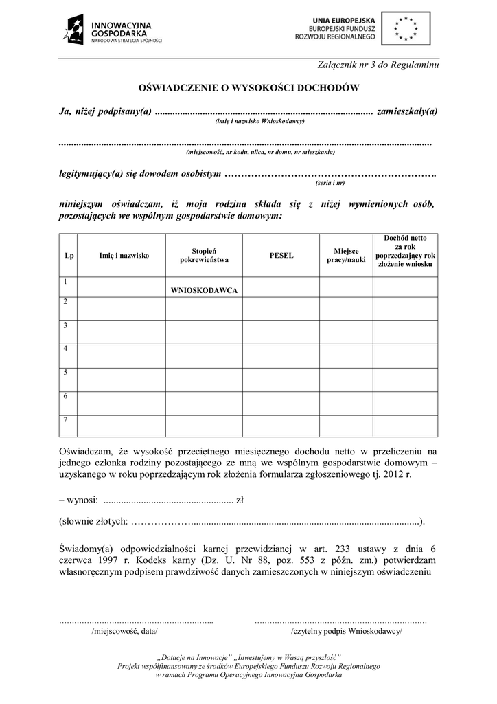 Załącznik nr 3 do Regulaminu OŚWIADCZENIE O WYSOKOŚCI DOCHODÓW Ja, niżej podpisany(a) ....................................................................................... zamieszkały(a) (imię i nazwisko Wnioskodawcy) ..................................................................................................................................................... (miejscowość, nr kodu, ulica, nr domu, nr mieszkania) legitymujący(a) się dowodem osobistym ………………………………………………………. (seria i nr) niniejszym oświadczam, iż moja rodzina składa się z niżej wymienionych osób, pozostających we wspólnym gospodarstwie domowym: Lp Imię i nazwisko Stopień pokrewieństwa PESEL Miejsce pracy/nauki Dochód netto za rok poprzedzający rok złożenie wniosku 1 WNIOSKODAWCA 2 3 4 5 6 7 Oświadczam, że wysokość przeciętnego miesięcznego dochodu netto w przeliczeniu na jednego członka rodziny pozostającego ze mną we wspólnym gospodarstwie domowym – uzyskanego w roku poprzedzającym rok złożenia formularza zgłoszeniowego tj. 2012 r. – wynosi: .................................................... zł (słownie złotych: ………………...........................................................................................). Świadomy(a) odpowiedzialności karnej przewidzianej w art. 233 ustawy z dnia 6 czerwca 1997 r. Kodeks karny (Dz. U. Nr 88, poz. 553 z późn. zm.) potwierdzam własnoręcznym podpisem prawdziwość danych zamieszczonych w niniejszym oświadczeniu …………………………………………………….. /miejscowość, data/ …………………………………………………………… /czytelny podpis Wnioskodawcy/ „Dotacje na Innowacje” „Inwestujemy w Waszą przyszłość” Projekt współfinansowany ze środków Europejskiego Funduszu Rozwoju Regionalnego w ramach Programu Operacyjnego Innowacyjna Gospodarka INFORMACJA Sposób wyliczenia przeciętnego miesięcznego dochodu netto: łączny dochód netto za rok poprzedzający przeciętny miesięczny dochód netto na osobę w rodzinie = ------------------------------ / 12 liczba osób w gospodarstwie domowym 1. 2. 3. 4. Przeciętny miesięczny dochód netto na osobę w rodzinie ustala się dzieląc łączną kwotę dochodów netto uzyskanych przez członków rodziny w roku poprzedzającym rok złożenia wniosku przez liczbę członków rodziny, a tak uzyskaną kwotę dzieląc przez 12 miesięcy. Do obliczenia dochodu netto przypadającego na jedną osobę w rodzinie wnioskodawcy, przyjmuje się następujące dochody osiągnięte - w roku podatkowym poprzedzającym rok złożenia formularza zgłoszeniowego - przez osoby zaliczone do gospodarstwa domowego: 1) dochody podlegające opodatkowaniu na podstawie przepisów o opodatkowaniu podatkiem dochodowym od osób fizycznych na zasadach ogólnych, pomniejszone o należny podatek oraz składki na ubezpieczenie społeczne i zdrowotne, 2) dochody z działalności podlegającej opodatkowaniu na podstawie przepisów o zryczałtowanym podatku dochodowym pomniejszone o należny zryczałtowany podatek dochodowy oraz składki na ubezpieczenia społeczne i zdrowotne, 3) dochody z gospodarstw rolnych, 4) stypendia określone w przepisach o systemie oświaty, o szkolnictwie wyższym oraz w przepisach o stopniach naukowych i tytule naukowym oraz o stopniach i tytule w zakresie sztuki, a także inne stypendia przyznawane uczniom lub studentom, 5) inne dochody nie podlegające opodatkowaniu na podstawie przepisów o podatku dochodowym od osób fizycznych. Do dochodu nie wlicza się jednorazowego pieniężnego świadczenia socjalnego oraz wartości świadczeń w naturze oraz kwoty alimentów orzeczonych wyrokami lub umowami sądowymi na rzecz innych osób, nie wchodzących w skład rodziny. Wnioskodawca zobowiązany jest dostarczyć dowody potwierdzające wysokość uzyskiwanych dochodów np.: zaświadczenie o zarobkach netto za rok poprzedzający rok złożenie formularza zgłoszeniowego, zaświadczenie o wysokości renty lub emerytury, zaświadczenie o wielkości gospodarstwa rolnego lub nakaz płatniczy podatku rolnego, zaświadczenie z Urzędu Pracy o wysokości zasiłku netto, „Dotacje na Innowacje” „Inwestujemy w Waszą przyszłość” Projekt współfinansowany ze środków Europejskiego Funduszu Rozwoju Regionalnego w ramach Programu Operacyjnego Innowacyjna Gospodarka 5. 6. 7. oświadczenie z pracy dorywczej, decyzja lub zaświadczenie z GOPS o pobieraniu świadczeń rodzinnych i pielęgnacyjnych, decyzję o pobieraniu stypendium szkolnego. Informacje ogólne oraz sposób obliczenia dochodu z gospodarstwa rolnego: Za gospodarstwo rolne uważa się obszar gruntów, o których mowa w art. 1 ustawy o podatku rolnym, o łącznej powierzchni przekraczającej 1 ha lub 1 ha przeliczeniowy, stanowiących własność lub znajdujących się w posiadaniu osoby fizycznej, osoby prawnej albo jednostki organizacyjnej, w tym spółki, nieposiadającej osobowości prawnej. Sposób obliczenia dochodu: Dochód roczny z gospodarstwa rolnego oblicza się mnożąc liczbę hektarów przeliczeniowych (zaświadczenie z Urzędu Gminy) znajdujących się w posiadaniu rodziny w roku kalendarzowym, z którego dokumentuje się dochody przez stawkę miesięcznego dochodu z 1 ha przeliczeniowego ogłoszoną corocznie przez Prezesa GUS (przyjmuje się, że miesięczny dochód z 1 ha przeliczeniowego wynosi 1/12 dochodu ogłaszanego na podstawie art. 18 ustawy z dnia 15 listopada 1984 r. o podatku rolnym (Dz. U. z 2006 r. Nr 136, poz. 969, z późn. zm.)) oraz przez liczbę miesięcy posiadania gospodarstwa rolnego w danym roku. W przypadku zmiany powierzchni gospodarstwa rolnego w trakcie roku dochód należy liczyć proporcjonalnie do liczby miesięcy posiadania gospodarstwa rolnego. Przy mniejszej niż 1ha przeliczeniowy powierzchni gospodarstwa rolnego nie ustala się dochodu (przyjmuje się zero). Uczestnik zobowiąza