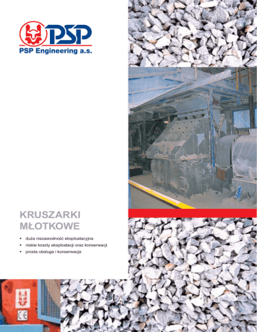 KRUSZARKI MŁOTKOWE duża niezawodność eksploatacyjna niskie koszty eksploatacji oraz konserwacji prosta obsługa i konserwacja Kruszarki młotkowe do drobnego i średniego kruszenia KRUSZENIE PSP Engineering dostarcza kruszarki młotkowe do dokładnego i średniego kruszenia miękkich i średnio twardych nie lepkich materiałów, np. wapienia, kamienia gipsowego, łupku, wapna palonego, węgla kamiennego i innych materiałów o podobnych właściwościach. Kruszarki młotkowe różnej wydajności można stosować w cementowniach, gdzie we młynie są zainstalowane młyny kulowe, na liniach odsiarczania i liniach do produkcji mieszanek tynkowych Do największych zalet młotkowych kruszarek należy: wysoka niezawodność niskie koszty eksploatacji i utrzymania wysoka wydajność długa żywotność kruszących głównych elementów Kruszarki do drobnego i średniego kruszenia są skonstruowane do rewersyjnej pracy wirnika i młotków. Rozwiązanie konstrukcyjne komory wejściowej, wirnika z pokrywającymi się młotkami i gładka powierzchnia wirnika korzystnie wpływa na wydajność kruszarki. Konstrukcja skrzyni kruszarki (jej odchylanej części) umożliwia łatwy i szybki dostęp do ważnych części kruszarki podczas utrzymania. Płyty udarowe można ustawić do zamkniętej lub otwartej trasy kruszenia. Maszyna może być dostarczona z ramą nośną wspólną dla kruszarki i napędu, dzięki czemu skraca się czas instalacji kruszarki. W razie potrzeby minimalizacja wpływów dynamicznych kruszarki na fundamenty ramę można dostarczyć z ułożeniem elastycznym. Model 3D kruszarki KMR 2142 Model 3D kruszarki KMR 2142 z napędem na wspólnej ramie kotwiącej Kruszarka młotkowa KMR 2145 – kruszenie wapienia do odsiarczania Kruszarka młotkowa KMR 2145 Skład granulometryczny produktu Rysunek kruszarki młotkowej KMR 2145 z napędem Główne parametry techniczne pozostałość na sicie [%] typ KMR 1112** otwór kwadratowego sita [mm] Obszar między krzywymi charakteryzuje zdolność kruszenia maszyn w zależności od wielkości i rodzaju kruszonego materiału. wejście* szczelina ruszta**** wydajność długość szerokość wysokość całkowita całkowita silnik el. mm mm t/h mm mm mm kW 200 4 - 14 15 - 25 1140 1225 900 11 - 30 KMR 2142 75 6 - 25 30/65*** 1420 1350 1400 75 - 110 KMR 2143 100 6 - 30 50/110*** 1700 1640 1750 110 - 160 KMR 2144 120 6 - 40 80/175*** 2160 1940 2150 160 - 250 KMR 2145 120 6 - 40 100/200*** 2620 2300 2500 250 - 400 KMR 2146 150 10 - 40 120/250*** 2780 2650 2750 315 - 400 KMR 2147 200 10 - 40 200/400*** 3360 3340 3450 500 - 630 KMR 2148 200 12 - 40 320/600*** 4000 4000 4000 630 - 800 * przesiew sitem kwadratowym ** nie ma w wykonaniu rewersyjnym *** Wydajność maks. wapień/węgiel **** uziarnienie wyjściowe produktu – ponad 95% mniejsze, niż szczelina rusztu Podane wydajności są informacyjne i zależą od właściwości i składu kruszonego materiału oraz sposobu podawania. www.pspengineering.cz PSP Engineering, spółka o ponad pięćdziesięcioletniej tradycji, jest przodującym dostawcą kompletnych systemów procesowych, produktowych i produktów do produkcji materiałów budowlanych i przerobu surowców mineralnych, dostarczanych zwłaszcza do cementowni, wapiennic, kruszarni w kamieniołomach, żwirowni i piaskowni. PSP Engineering a.s. Kojetínská 3186/79 750 53 Přerov, Republika Czeska Tel. +420 581 232 251, +420 581 233 156 Fax +420 581 203 164 e-mail: [email protected] www.pspengineering.cz Technika do kruszenia i przesiewania/Systemy do kruszenia i przesiewania surowców mineralnych i do recyklingu PL 04/09 Dane w niniejszym prospekcie służą wyłącznie do projektowania wstępnego. Producent zastrzega sobie prawo do zmian produktów i/lub ich parametrów bez uprzedniego informowania. © 2009 PSP Engineering a.s.