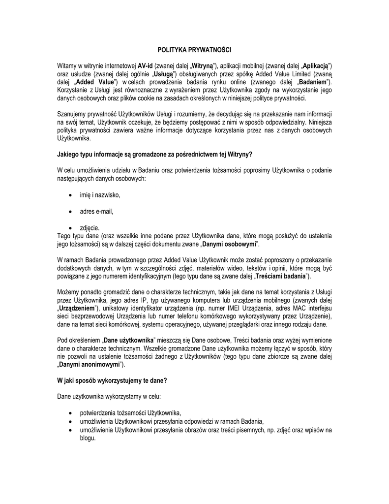 POLITYKA PRYWATNOŚCI Witamy w witrynie internetowej AV-id (zwanej dalej „Witryną”), aplikacji mobilnej (zwanej dalej „Aplikacją”) oraz usłudze (zwanej dalej ogólnie „Usługą”) obsługiwanych przez spółkę Added Value Limited (zwaną dalej „Added Value”) w celach prowadzenia badania rynku online (zwanego dalej „Badaniem”). Korzystanie z Usługi jest równoznaczne z wyrażeniem przez Użytkownika zgody na wykorzystanie jego danych osobowych oraz plików cookie na zasadach określonych w niniejszej polityce prywatności. Szanujemy prywatność Użytkowników Usługi i rozumiemy, że decydując się na przekazanie nam informacji na swój temat, Użytkownik oczekuje, że będziemy postępować z nimi w sposób odpowiedzialny. Niniejsza polityka prywatności zawiera ważne informacje dotyczące korzystania przez nas z danych osobowych Użytkownika. Jakiego typu informacje są gromadzone za pośrednictwem tej Witryny? W celu umożliwienia udziału w Badaniu oraz potwierdzenia tożsamości poprosimy Użytkownika o podanie następujących danych osobowych: imię i nazwisko, adres e-mail, zdjęcie. Tego typu dane (oraz wszelkie inne podane przez Użytkownika dane, które mogą posłużyć do ustalenia jego tożsamości) są w dalszej części dokumentu zwane „Danymi osobowymi”. W ramach Badania prowadzonego przez Added Value Użytkownik może zostać poproszony o przekazanie dodatkowych danych, w tym w szczególności zdjęć, materiałów wideo, tekstów i opinii, które mogą być powiązane z jego numerem identyfikacyjnym (tego typu dane są zwane dalej „Treściami badania”). Możemy ponadto gromadzić dane o charakterze technicznym, takie jak dane na temat korzystania z Usługi przez Użytkownika, jego adres IP, typ używanego komputera lub urządzenia mobilnego (zwanych dalej „Urządzeniem”), unikatowy identyfikator urządzenia (np. numer IMEI Urządzenia, adres MAC interfejsu sieci bezprzewodowej Urządzenia lub numer telefonu komórkowego wykorzystywany przez Urządzenie), dane na temat sieci komórkowej, systemu operacyjnego, używanej przeglądarki oraz innego rodzaju dane. Pod określeniem „Dane użytkownika” mieszczą się Dane osobowe, Treści badania oraz wyżej wymienione dane o charakterze technicznym. Wszelkie gromadzone Dane użytkownika możemy łączyć w sposób, który nie pozwoli na ustalenie tożsamości żadnego z Użytkowników (tego typu dane zbiorcze są zwane dalej „Danymi anonimowymi”). W jaki sposób wykorzystujemy te dane? Dane użytkownika wykorzystamy w celu: potwierdzenia tożsamości Użytkownika, umożliwienia Użytkownikowi przesyłania odpowiedzi w ramach Badania, umożliwienia Użytkownikowi przesyłania obrazów oraz treści pisemnych, np. zdjęć oraz wpisów na blogu. Pliki cookie wykorzystujemy w celu odróżnienia jednego Użytkownika Usługi od drugiego, a także w celu podniesienia jakości Usługi oraz zapewnienia Użytkownikowi możliwości sprawnego z niej korzystania. Więcej informacji na temat wykorzystania zgromadzonych przez nas Danych użytkownika przy użyciu plików cookie i podobnych technologii można znaleźć w znajdującej się poniżej części zatytułowanej „Pliki cookie”. Treści badania będziemy wykorzystywać w następujący sposób: umożliwiając naszym klientom przeglądanie konkretnych stron w witrynach Badania (jest to środowisko chronione hasłem, które nigdy nie jest udostępniane publicznie); zamieszczając Treści badania w sprawozdaniach sporządzanych dla naszych klientów w związku z badaniem (naszym klientom pozwalamy na wykorzystanie takich sprawozdań wyłącznie dla celów wewnętrznych). W jaki sposób przekazujemy dane Użytkownika podmiotom zewnętrznym? Dane użytkownika możemy przekazywać innym spółkom wchodzącym w skład grupy Added Value, jej jednostkom stowarzyszonym oraz podmiotom zewnętrznym w celu uzyskania pomocy w przetworzeniu owych danych na potrzeby określone w niniejszej polityce. Dane, które Użytkownik przesyła lub uzyskuje w związku z Badaniem, będą na mocy umowy zawartej z Added Value przechowywane na znajdujących się na terenie UE serwerach obsługiwanych przez podmiot zewnętrzny, który nie będzie miał prawa do wykorzystania ich w celu innym niż gromadzenie i przechowywanie na serwerach w imieniu Added Value; dane te mogą zostać jednak przekazane poza Europejski Obszar Gospodarczy (zwany dalej „EOG”) i tam przetwarzane zgodnie z treścią części zatytułowanej „Dokąd przesyłamy dane Użytkownika?”. Danych osobowych Użytkownika nie będziemy przekazywać klientom, chyba że Użytkownik udzieli na to wyraźnej zgody lub w sytuacjach, gdy będą wymagać tego przepisy prawa. Możemy ujawnić Dane osobowe Użytkownika, w sytuacji gdy my lub któraś z części wchodzących w skład naszego majątku będzie przedmiotem sprzedaży lub transakcji korporacyjnej podobnego typu. Zagwarantujemy, aby podmioty zewnętrzne, które otrzymują Dane osobowe Użytkowników, zachowały poufność owych Danych. Dane osobowe możemy przekazywać podmiotom zewnętrznym, jeśli będziemy mieli powody uznać, że wymagają tego przepisy prawa, a także w celu zbadania działań, co do których zachodzi podejrzenie, że są one niezgodne z prawem lub takich, które są faktycznie niezgodne z prawem lub zakazane, w tym w szczególności oszustwa, jak również w celu zapobieżenia tego typu działaniom lub podjęciu w związku z nimi odpowiednich czynności. Niestety nigdy nie można zapewnić całkowitego bezpieczeństwa transmisji danych za pośrednictwem Internetu lub sieci komórkowych. Chociaż dokładamy wszelkich starań, aby chronić Dane użytkownika, nie możemy zagwarantować bezpieczeństwa danych, które Użytkownik przesyła do Usługi lub za jej pośrednictwem. Transmisję danych Użytkownik podejmuje na własne ryzyko. Po otrzymaniu Danych użytkownika będziemy przestrzegać rygorystycznych procedur i korzystać z