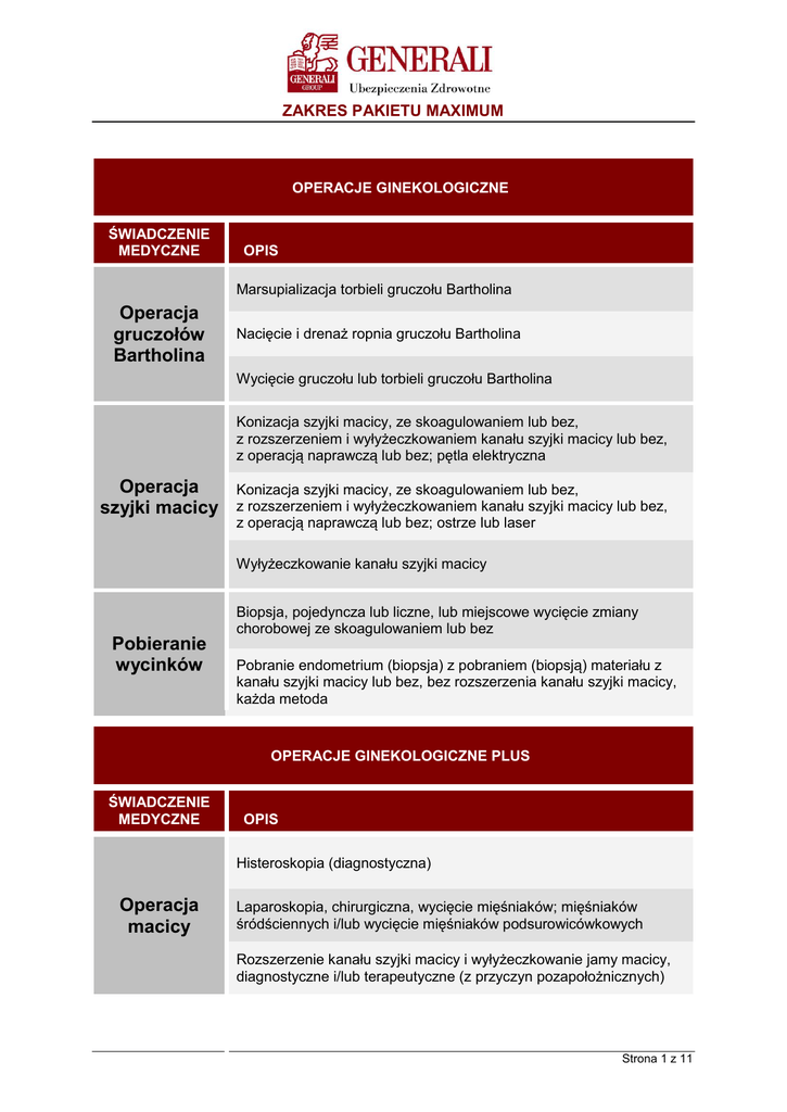 ZAKRES PAKIETU MAXIMUM OPERACJE GINEKOLOGICZNE ŚWIADCZENIE MEDYCZNE OPIS Marsupializacja torbieli gruczołu Bartholina Operacja gruczołów Bartholina Nacięcie i drenaż ropnia gruczołu Bartholina Wycięcie gruczołu lub torbieli gruczołu Bartholina Konizacja szyjki macicy, ze skoagulowaniem lub bez, z rozszerzeniem i wyłyżeczkowaniem kanału szyjki macicy lub bez, z operacją naprawczą lub bez; pętla elektryczna Operacja szyjki macicy Konizacja szyjki macicy, ze skoagulowaniem lub bez, z rozszerzeniem i wyłyżeczkowaniem kanału szyjki macicy lub bez, z operacją naprawczą lub bez; ostrze lub laser Wyłyżeczkowanie kanału szyjki macicy Pobieranie wycinków Biopsja, pojedyncza lub liczne, lub miejscowe wycięcie zmiany chorobowej ze skoagulowaniem lub bez Pobranie endometrium (biopsja) z pobraniem (biopsją) materiału z kanału szyjki macicy lub bez, bez rozszerzenia kanału szyjki macicy, każda metoda OPERACJE GINEKOLOGICZNE PLUS ŚWIADCZENIE MEDYCZNE OPIS Histeroskopia (diagnostyczna) Operacja macicy Laparoskopia, chirurgiczna, wycięcie mięśniaków; mięśniaków śródściennych i/lub wycięcie mięśniaków podsurowicówkowych Rozszerzenie kanału szyjki macicy i wyłyżeczkowanie jamy macicy, diagnostyczne i/lub terapeutyczne (z przyczyn pozapołożnicznych) Strona 1 z 11 ZAKRES PAKIETU MAXIMUM ŚWIADCZENIE MEDYCZNE OPIS Laparoskopia, chirurgiczna; z usunięciem struktur przydatków (częściowe lub całkowite usunięcie jajnika i/lub jajowodu Operacja przydatków Wycięcie torbieli jajnika, jednostronne lub obustronne Wycięcie torbieli pochwy lub guza pochwy OPERACJE CHIRURGICZNE ŚWIADCZENIE MEDYCZNE OPIS Pobranie wycinków, biopsja gruboigłowa+badanie histopatologiczne. Chirurgia ogólna Nacięcie zwieracza Odiego z dostępu przezdwunastniczego Nacięcie i drenaż, głęboko położony ropień lub krwiak Operacja żylaków odbytu, poprzez proste podwiązanie (np. gumowe podwiązki) Operacje hemoroidów Wstrzyknięcie substancji obliterującej (skleroterapia), żylaki odbytu Operacje okolic odbytu Wycięcie żylaków odbytu, wewnętrznych i zewnętrznych, Leczenie chirurgiczne przetoki odbytu (wycięcie/nacięcie przetoki); Nacięcie i drenaż ropnia kulszowo-odbytniczego i/lub okołoodbytniczego Nacięcie i drenaż, ropnia okołoodbytowego, powierzchownie Nacięcie zwieracza odbytu, sfinkterotomia Plastyka odbytu, operacja plastyczna z powodu zwężenia; dorosły Strona 2 z 11 ZAKRES PAKIETU MAXIMUM Operacje okolic odbytu ŚWIADCZENIE MEDYCZNE OPIS Rozszerzanie zwieracza odbytu w warunkach znieczulenia innego niż miejscowe Wycięcie szczeliny odbytu, z nacięciem zwieracza odbytu (sfinkterotomią) lub bez Wycięcie torbieli skórzastej lub zatoki włosowej; Wycięcie zatoki (krypty) odbytu; Wyłyżeczkowanie lub koagulacja szczeliny odbytu, włączając w to rozszerzenie zwieracza odbytu (oddzielna procedura); Klinowe wycięcie skóry wału paznokciowego (np. we wrastającym paznokciu palucha) Operacja paznokcia / Wycięcie niedystroficznych paznokci łożyska / wału paznokciowego Wycięcie paznokcia i macierzy, częściowe lub całkowite, (np. wrastający lub zniekształcony paznokieć) trwałe usunięcie Operacje przepuklin Implantacja siatki syntetycznej lub innego materiału sztucznego w celu operacji naprawczej przepukliny pooperacyjnej lub brzusznej Inne przepukliny przedniej ściany jamy brzusznej Operacja laparoskopowa; naprawa pierwotnej przepukliny pachwinowej Operacja naprawcza pierwotnej przepukliny pachwinowej Operacja naprawcza pierwotnej przepukliny udowej Operacja naprawcza przepukliny pępkowej, Strona 3 z 11 ZAKRES PAKIETU MAXIMUM ŚWIADCZENIE MEDYCZNE Operacje żylaków podudzi Usunięcie tłuszczaka OPIS Podwiązanie i podział żyły odstrzałkowej w miejscu ujścia do żyły podkolanowej Wycięcie zmienionych żylakowato żył w obrębie kończyn; Usunięcie tłuszczaka / włókniaka / kaszaka Usunięcie przerośniętych blizn, korekcja blizn (opracowanie chirurgiczne; skóra, tkanka podskórna i mięsień) Usunięcie zmiany skórnej Usuwanie brodawek skóry, mnogich brodawek skórnowłóknistych z jakiejkolwiek powierzchni; Usunięcie znamion skórnych (wycięcie, zmiana łagodna, włączając w to marginesy) OPERACJE CHIRURGICZNE PLUS ŚWIADCZENIE MEDYCZNE Operacja sutka OPIS Mastektomia Podkłucie / zeszycie żylaków odbytu za pomocą staplera Operacje hemoroidów Chirurgia ogólna Zniszczenie żylaków odbytu, jakąkolwiek metodą; wewnętrznych i/lub zewnętrznych Plastyczna operacja naprawcza zniekształcenia rozszczepu wargi/nosa; pierwotna, rozszczep częściowy lub całkowity, jednostronnie Usunięcie pęcherzyka zołciowego Strona 4 z 11 ZAKRES PAKIETU MAXIMUM OPERACJE OKULSTYCZNE Operacja powiek i spojówek ŚWIADCZENIE MEDYCZNE OPIS Korekcja podwinięcia rzęs; epilacja inną metodą niż przy użyciu pęsety (np. techniki elektrochirurgiczne, krioterapia, chirurgia laserowa) Wycięcie gradówki; Wycięcie lub przemieszczenie skrzydlika; z przeszczepem lub bez Wycięcie zmiany chorobowej powieki (nie obejmuje gradówki) bez konieczności zamknięcia lub z zamknięciem prostym Operacje zaćmy Korekcja podwinięcia rzęs; epilacja inną metodą niż przy użyciu pęsety (np. techniki elektrochirurgiczne, krioterapia, chirurgia laserowa) Usunięcie ciała obcego z rogówki Usunięcie ciała obcego, przednia część oka; rogówkowe, z użyciem lampy szczelinowej lub bez OPERACJE OKULSTYCZNE PLUS ŚWIADCZENIE MEDYCZNE OPIS Operacje jaskry Goniotomia (otworzenie chirurgiczne kąta przesączania) Irydotomia/irydektomia z zastosowanie lasera (np. w leczeniu jaskry) (jedna lub więcej sesji) Trabekuloplastyka laserowa, jedna lub więcej sesji (zdefiniowany cykl leczenia) Trabekulotomia ab externo Wytworzenie przetoki twardówkowej w jaskrze; termokoagulacja z irydektomią Wytworzenie przetoki twardówkowej w jaskrze; trepanacja z irydektomią Strona 5 z 11 ZAKRES PAKIETU MAXIMUM Operacje zeza ŚWIADCZENIE MEDYCZNE OPIS Chirurgiczne 