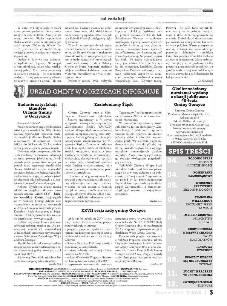 wstęp od redakcji W dniu, w którym piszę te słowa - aura prawie grudniowa. Śnieg zmieszany z deszczem. Błoto. Zimny wiatr smaga policzki. Słońce zapomniało chyba o Ziemi, albo ta nie krąży już wokół niego. Zbliża się Wielki Tydzień. Jest nadzieja. Że słonko zdąży, i w jego promykach usłyszymy niezwykłą nowinę. Oddaję w Państwa ręce świąteczne wydanie naszej gazety. Nie mogło w nim zabraknąć, jak co roku, wielkanocnej palmy. Tym razem prezentują ją dziadek i wnuczka – bo to rodzinna tradycja. Palmę przygotowują właśnie dziadkowie, ojcowie i dzieci. Tak jest od wieków. I wierzę mocno, że pozostanie. Pozostanie, także dzięki staraniom naszych gospodyń, które, tak jak te z Kolonii Fryderyk, pielęgnują piękny zwyczaj. W tych szczególnych dniach wyraził chęć spotkania z nami po raz kolejny ks. dr Henryk Olszar – znakomity historyk kościoła, który pisze tym razem o średniowiecznych proboszczach i związkach naszej parafii z Orłową. Z kolei dr Maria Kopsztejn analizuje miejsce najbliższe każdemu z nas, to w którym przyszliśmy na świat, z którego jesteśmy. Pozostały jeszcze dwie rodzynki na naszym świątecznym cieście. Wielkopostne rekolekcje będziemy mogli przeżyć ponownie z ks. dr. hab. Arkadiuszem Wuwrem – kapłanem, socjologiem i poetą. Jeszcze tylko kilka godzin i zdarzy się cud. Jezus powstanie z martwych. Jeszcze tylko kilka, kilkadziesiąt lat. I zdarzy się cud. Z martwych wstanę. Na pewno. – pisze ks. Arek. Bo istotą nadchodzących świąt jest właśnie Nadzieja. Nie tylko dla chrześcijan, katolików. Życząc Wszystkim Państwu radosnych i pełnych rodzinnego ciepła świąt, zapraszam do odbycia wędrówki w stronę Pszowskiego Lasu. Wybitny teolog, URZĄD GMINY W GORZYCACH INFORMUJE Badanie satysfakcji klientów Urzędu Gminy w Gorzycach Szanowni Państwo! Mając na uwadze ciągłe podnoszenia jakości pracy urzędników, Wójt Gminy Gorzyce wprowadził regulamin badania satysfakcji klientów Urzędu Gminy w Gorzycach. Tym samym, od 1 marca 2013 r. do 30 kwietnia 2013 r. można ocenić pracę urzędu za pomocą ankiet. Głównym celem przeprowadzania badania jest bieżące uzyskiwanie informacji na temat poziomu jakości usług świadczonych przez pracowników urzędu, co pozwoli m.in. precyzyjnie określić słabe obszary działalności urzędu, wprowadzić procedury doskonalące, lepiej zarządzać komórkami organizacyjnymi, podnieść jakość świadczonych usług publicznych, a w konsekwencji poprawić wizerunek urzędu. Ankieta: Wypełnione ankiety można składać do specjalnych skrzynek oznaczonych napisem „ANKIETY” - badanie satysfakcji klienta, znajdujących się w Punktach Obsługi Klienta oraz wyznaczonych miejscach na korytarzach w Urzędzie Gminy w Gorzycach, przy ul. Kościelnej 15, jak również przy ul. Bogumińskiej 13 lub wypełnić on-line na stronie internetowej – www.gorzyce.pl. Badanie satysfakcji klienta jest konsekwencją realizacji projektu pn. „Ku nowoczesnej administracji samorządowej w jednostkach samorządu terytorialnego z terenu Subregionu Zachodniego Województwa Śląskiego”. Wyniki badania ankietowego podane zostaną do publicznej wiadomości na stronie internetowej gminy www.gorzyce.pl do 31 maja 2013 r. Zachęcamy Państwa do udziału w badaniu i rzetelnego wypełniania ankiet. źródło UG Zazieleniamy Śląsk Gmina Gorzyce wraz z Chorzowem, Katowicami, Rybnikiem i Żorami uczestniczy w V edycji kampanii ekologiczno-artystycznej „Zazieleniamy Śląsk”. TAURON Zielona Wyspa Śląsk to szeroko zakrojona kampania ekologiczno-artystyczna, której głównym celem jest pokazywanie zmieniającego się wizerunku Śląska. Poprzez współpracę wielu lokalnych środowisk (ekolodzy, artyści, urzędnicy, media…) prowadzone są działania informacyjne, edukacyjne, ekologiczne i artystyczne, które mają uświadomić społeczności śląskiej wielkie zmiany, jakie zachodzą w naszym regionie na przestrzeni ostatnich lat. 18 marca br. w gimnazjum w Czyżowicach zorganizowane zostały warsztaty edukacyjne oraz gry i zabawy, w czasie których uczestnicy nauczyli się, jak w prosty sposób wprowadzić ekologię do swych domów i dbać o środowisko. Działania zakończone zostaną posadzeniem nowego lasu. Tegoroczny finał kampanii, odbył się 21 marca 2013 r. w Katowicach na ul. Mariackiej. W tym dniu zaplanowany został całodniowy festyn ekologiczny „Zielona Energia”, gdzie m.in. zaprezentowano system rowerów, na których jeździły dzieci i młodzież, wytwarzając prąd. Wytworzona i zgromadzona energia została później wykorzystana do nagłośnienia występu muzyków uprawiających „zieloną muzykę”. Akcji towarzyszyły różnego rodzaju ekologiczne pogadanki, gry i zabawy. TAURON Zielona Wyspa Śląsk to także hasło, pod którym pierwszego dnia wiosny dokonuje się połączenie „zielonej muzyki”, uprawianej od ponad 25 lat przez nagrodzony Fryderykiem, a pochodzący ze Śląska zespół Carrantuohill, z elementami „śląskiego” artyzmu na najwyższym poziomie. źródło UG XXVII sesja rady gminy Gorzyce 28 lutego br. odbyła się XXVII sesja Rady Gminy Gorzyce, na której podjęte zostały uchwały w sprawie: – przyjęcia programu opieki nad zwierzętami bezdomnymi oraz zapobiegania bezdomności zwierząt na terenie Gminy Gorzyce; – Statutu Świetlicy Profilaktyczno-Wychowawczej w Gorzyczkach; – zmiany uchwały budżetowej Gminy Gorzyce na 2013 rok; – zmiany Wieloletniej Prognozy Finansowej Gminy Gorzyce na lata 2013-2023; – rozpatrzenia wezwania do usunięcia naruszenia prawa w związku z podjęciem uchwały Nr XXIV/203/12 Rady Gminy Gorzyce z dnia 29 października 2012 r. w sprawie rozpatrzenia skargi na działalność Wójta Gminy Gorzyce. Ponadto rada przyjęła sprawozdanie z realizacji Programu usuwania azbestu i wyrobów zawierających azbest na terenie Gminy Gorzyce w 2012 r. oraz sprawozdania z pracy Komisji Rady