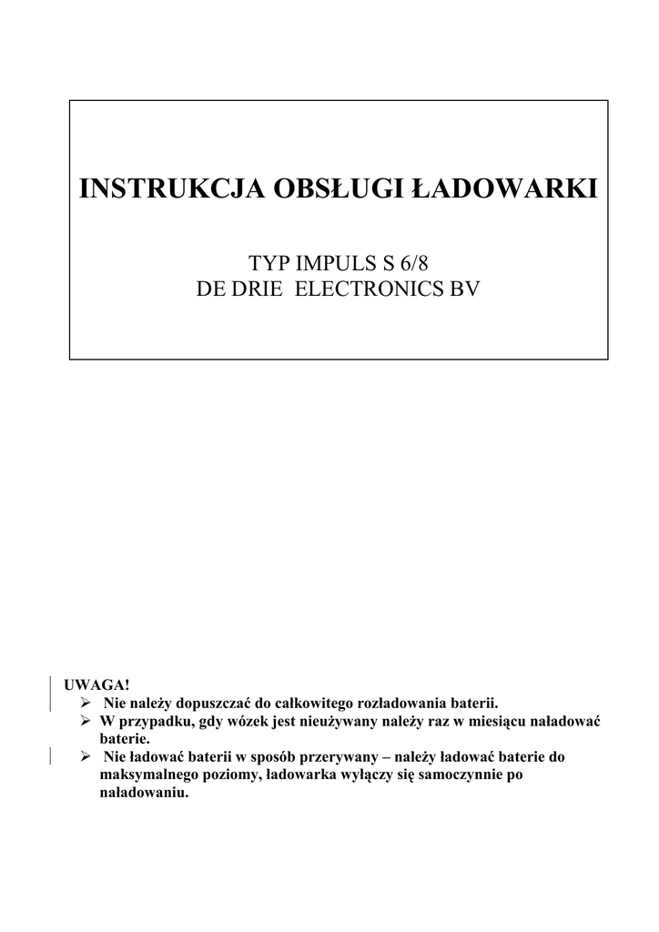 INSTRUKCJA OBSŁUGI ŁADOWARKI TYP IMPULS S 6/8 DE DRIE ELECTRONICS BV UWAGA! Nie naleŜy dopuszczać do całkowitego rozładowania baterii. W przypadku, gdy wózek jest nieuŜywany naleŜy raz w miesiącu naładować baterie. Nie ładować baterii w sposób przerywany – naleŜy ładować baterie do maksymalnego poziomy, ładowarka wyłączy się samoczynnie po naładowaniu. Spis treści 1. Objasnienie stosowanych symboli.......................................................................2 2. Opis i specyfikacja urządzenia............................................................................2 3. Zasilanie i warunki ekspolatacji.........................................................................3 4. Obsługa baterii...................................................................................................3 5. Bezpieczaństwo uŜytkowania..............................................................................3 6. Proces ładowania...............................................................................................4 7. Tabela wskazań diód LED..................................................................................4 8. Meldunki o błędach i opis postępowania…………………………………………..5 9. Czyszczenie i konserwacja……………………………………………………………5 10. WaŜne informacje serwisowe………………………………………………………...5 1. Objaśnienie stosowanych symboli: Uwaga! NaleŜy przeczytać instrukcję przed stosowaniem. Zabrania się usuwania zuŜytych elementów wraz z odpadami domowymi. Uszkodzone elementy przekazać do specjalnych punktów utylizacji. CE Urządzenie spełnia wymogi bezpieczeństwa określone Dyrektywą UE 89/336/EWG. 2.Opis i specyfikacja urządzenia: Ładowarka jest bezobsługowym, w pełni zautomatyzowanym urządzeniem słuŜącym do uzupełniania energii w bateriach Ŝelowych 24V. Maksymalny prąd ładowania wynosi 8A. Urządzenie zasilane powinno być z sieci energetycznej napięciem zmiennym 230V o częstotliwości 50-60Hz, 1fazowym. Wydajność urządzenia pozwala na ładowanie baterii o minimalnej pojemności 40Ah, a maksymalnej 85Ah. Układ ładowarki posiada następujące zabezpieczenia: przeciwko odwrotnej polaryzacji, przepięciom oraz zabezpieczenie termiczne. Wydanie 2007-03-29, Aktualizacja 2007-05-28 2/6 Szczegółowa specyfikacja: Prąd zasilający Nominalne napięcie ładowania Maksymalne napięcie ładowania Prąd ładowania 230V - 50/60Hz – 1fazowy 24V 35V Wartość ustalana przez dostawcę: max.6A dla Impuls S6 max.8A dla Impuls S8 Typ baterii Ołowiane z kwasem siarkowym - Ŝelowe Pojemność baterii Impuls S6: min. 40Ah – max. 60Ah Impuls S8: min. 60Ah – max. 85 Ah Uwaga: Pojemność maksymalna 80% po 8 godz.ładowania. Stosowane zabezpieczenia - przed odwrotną polaryzacją - przed zbyt duŜym napięciem - termiczne Moc ładowarki Impuls S6 – 195W Impuls S8 – 270W Sprawność ładowania Min. 80% (przy pełnym obciąŜeniu) Temperatura uŜytkowania 0ºC do +40ºC Wymiary obudowy urządzenia (wys. x szer. (70 x 150 x 200) mm x głęb.) Klasa ochrony II Ochrona obudowy IP 21 / IP 55 (w zaleŜności od modelu, patrz tabliczka znamionowa na spodniej ściance urządzenia) Masa całkowita 1.3 kg Transport i składowanie Temp. -15ºC do +50ºC Max. wilgotność powietrza 95% 3.Zasilanie i warunki eksploatacji Układ prostowniczy ładowarki mieści się w zamkniętej obudowie, z systemem chłodzącym – wentylator wymuszający wewnętrzny obieg powietrza. Z przodu urządzenia znajdują się dwie świecące diody koloru Ŝółtego i zielonego (opis znaczenia znajduje się w dalszej części instrukcji). Zasilanie do ładowarki doprowadzamy kablem o długości 1.9 m, zakończonym typową wtyczką słuŜącą do umieszczenia w gnieździe sieci elektrycznej (~230V). Połączenie ze sterownikiem wózka, dokonywane jest przy pomocy drugiego kabla o długości 2.4 m, zakończonego specjalną końcówką – wtykiem z trzema szpilkami. Miejsce dokoła ładowarki powinno być dobrze wentylowane. Intensywność oddawanego ciepła w trakcie ładowania moŜe być znaczna i w celu utrzymania optymalnej temperatury wewnątrz układu, ładowarka została wyposaŜona w wentylator, dzięki któremu ten warunek jest spełniony. Jeśli układy ładowarki nie będą dostatecznie chłodzone lub temperatura osiągnęła duŜą wartość, wtedy ładowarka rozpocznie proces ładowania bardzo małym prądem (w rezultacie proces ładowania znacznie się wydłuŜy). W przypadku, jeśli temperatura znacznie przekracza maksymalną dopuszczalną wartość, ładowarka samoczynnie przerwie proces ładowania. Wydanie 2007-03-29, Aktualizacja 2007-05-28 3/6 4.Obsługa baterii • Świecenie jedynie zielonej diody, świadczy o pełnym naładowaniu baterii – moŜna wyłączyć ładowarkę (Uwaga: pierwszy odłączamy kabel zasilający ładowarkę, następnie przewód ładujący). Wcześniejsze przerwanie procesu ładowania baterii jest moŜliwe, naleŜy jednak pamiętać, Ŝe baterie są niedoładowane i moŜliwe będzie pokonanie mniejszego dystansu, • Jeśli zielona dioda świeci (baterie są juŜ naładowane) i do sterownika nadal podłączony jest przewód ładujący, ładowarka przechodzi do stanu podtrzymania naładowania baterii, • Jeśli baterie nie są często eksploatowane, wskazane jest doładowanie baterii, jednak nie częściej, niŜ raz w miesiącu, • ChociaŜ ładowarka ma moŜliwość ładowania głęboko rozładowanych baterii, jest niewskazane doprowadzać baterii do bardzo głębokiego rozładowania. Powoduje to drastyczne ograniczenie pojemności baterii, czyli w konsekwencji ich Ŝywotności. Jednak, jeśli coś takiego się wydarzy, naleŜy proces ładowania rozpocząć moŜliwie jak najszybciej, w celu zmniejszenia stopnia uszkodzenia baterii. • Ładowarka jest dostosowana tylko do jednego typu baterii określonych na poc