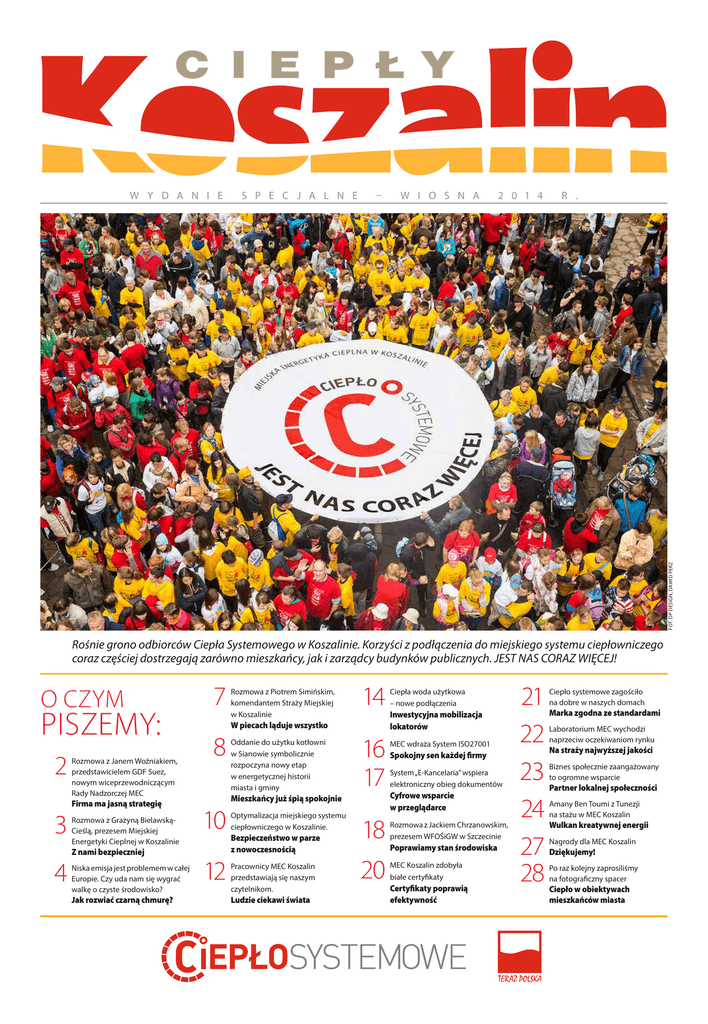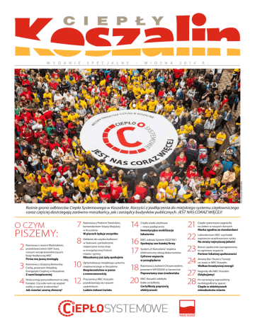 S P E C J A L N E – W I O S N A 2 0 1 4 R . FOT. DP DESIGN, DAWID PERZ W Y D A N I E Rośnie grono odbiorców Ciepła Systemowego w Koszalinie. Korzyści z podłączenia do miejskiego systemu ciepłowniczego coraz częściej dostrzegają zarówno mieszkańcy, jak i zarządcy budynków publicznych. JEST NAS CORAZ WIĘCEJ! O CZYM PISZEMY: 2 Rozmowa z Janem Woźniakiem, przedstawicielem GDF Suez, nowym wiceprzewodniczącym Rady Nadzorczej MEC Firma ma jasną strategię 3 Rozmowa z Grażyną BielawskąCieślą, prezesem Miejskiej Energetyki Cieplnej w Koszalinie Z nami bezpieczniej 4 Niska emisja jest problemem w całej Europie. Czy uda nam się wygrać walkę o czyste środowisko? Jak rozwiać czarną chmurę? 7 Rozmowa z Piotrem Simińskim, komendantem Straży Miejskiej w Koszalinie 14 Ciepła woda użytkowa – nowe podłączenia W piecach ląduje wszystko 8 Oddanie do użytku kotłowni w Sianowie symbolicznie rozpoczyna nowy etap w energetycznej historii miasta i gminy 16 17 MEC wdraża System ISO27001 10 Bezpieczeństwo w parze z nowoczesnością 12 Pracownicy MEC Koszalin przedstawiają się naszym czytelnikom. Ludzie ciekawi świata Spokojny sen każdej firmy System „E-Kancelaria” wspiera elektroniczny obieg dokumentów Mieszkańcy już śpią spokojnie Optymalizacja miejskiego systemu ciepłowniczego w Koszalinie. Inwestycyjna mobilizacja lokatorów 18 Cyfrowe wsparcie w przeglądarce Rozmowa z Jackiem Chrzanowskim, prezesem WFOŚiGW w Szczecinie 20 Poprawiamy stan środowiska MEC Koszalin zdobyła białe certyfikaty Certyfikaty poprawią efektywność 21 22 23 24 27 28 Ciepło systemowe zagościło na dobre w naszych domach Marka zgodna ze standardami Laboratorium MEC wychodzi naprzeciw oczekiwaniom rynku Na straży najwyższej jakości Biznes społecznie zaangażowany to ogromne wsparcie Partner lokalnej społeczności Amany Ben Toumi z Tunezji na stażu w MEC Koszalin Wulkan kreatywnej energii Nagrody dla MEC Koszalin Dziękujemy! Po raz kolejny zaprosiliśmy na fotograficzny spacer Ciepło w obiektywach mieszkańców miasta 2| WIOSNA 2014 R. E A N I W Y D L N E C J A S P E – 4 2 0 1 S N A W I O Firma ma jasną strategię R . ŅŅROZMOWA z Janem Woźniakiem, przedstawicielem GDF Suez, nowym 7 O CZYM PISZEMY: 2 jasną Firma ma 3 ieczniej Z nami bezp 10 j emem w całe a jest probl Niska emisj się wygrać Czy uda nam ? Europie. e środowisko walkę o czyst Jak rozwiać rę? czarną chmu u kotłowni do użytk oddanie ie e symboliczn w Sianowi nowy etap rozpoczyna ii cznej histor w energety iny miasta i gm spokojnie cy już śpią Mieszkań strat Bielawskąz Grażyną Rozmowa kiej sem Miejs e Cieślą, preze w Koszalini Cieplnej Energetyki 4 ląduje wszy W piecach 8 iakiem, z Janem Woźn Suez, Rozmowa cielem GDF ącym przedstawi rzewodnicz nowym wicep j MEC orcze Rady Nadz egię 14 Rozmowa y Miejskiej tem Straż komendan e stko w Koszalini mu kiego syste acja miejs linie. Optymaliz ego w Kosza ciepłownicz ństwo w parze Bezpiecze snością z nowocze 12 lin MEC Kosza Pracownicy m ają się naszy przedstawi . czytelnikom świata Inwestycy lokatorów 16 17 MEC sen Spokojny ISO27001 każdej firmy wspiera ncelaria” ów System „E-Ka dokument ny obieg elektronicz rcie Cyfrowe wspa ce w przeglądar 18 21 22 23 24 27 28 oczek ci naprzeciw yższej jakoś m wdraża Syste kim, Chrzanows z Jackiem Rozmowa w Szczecinie WFOŚiGW a prezesem środowisk 20 my stan Poprawia lin zdobyła MEC Kosza fikaty białe certy awią y popr Certyfikat ść efektywno Na straży najw ażowany cznie zaang Biznes społe e wsparcie czności to ogromn nej społe Partner lokal i z Tunezji Toum Amany Ben lin w MEC Kosza na stażu j energii ywne Wulkan kreat Nagrody y y zaprosiliśm Po raz kolejn r ficzny space na fotogra tywach obiek Ciepło w ta ców mias mieszkań wi Ludzie cieka Szanowny Czytelniku Niestety, badania i liczby nie kłamią. Według WHO zanieczyszczenie powietrza każdego roku powoduje w około 90 krajach świata zgon 2 mln ludzi, głównie w miastach, gdzie z tego powodu przedwcześnie umiera ponad milion osób. O smogu w Pekinie czy w Londynie słyszymy często. U nas, w Polsce, wcale nie jest lepiej. Najgorzej jest zimą, kiedy przy niskiej temperaturze wzrasta spalanie koksu, węgla i drewna w celach grzewczych. Wtedy, w warunkach wyżowych przy słabym wietrze powstaje smog, a najwyższe stężenie pyłu zawieszonego występuje wówczas w Krakowie, w aglomeracjach śląskich, we Wrocławiu, Łodzi, Poznaniu i Radomiu. Najlepiej pod tym względem jest w Zielonej Górze, Elblągu, Koszalinie i w Trójmieście. Tak, Koszalin pod względem czystości powietrza lokuje się w krajowej czołówce. Ten wynik nie bierze się znikąd. To efekt podjętych przez MEC w 1993 roku działań polegających na likwidacji zadymiających miasto kotłowni osiedlowych. Do pełni szczęścia rozumianego jako powietrze jeszcze czystsze, brakuje nam likwidacji domowych pieców, które są źródłami tak zwanej niskiej emisji, czyli snujących się między domami trujących dymów i pyłów. Co w zamian? To proste. Podłączenie do miejskiej sieci grzewczej. Dla dobra wszystkich mieszkańców Koszalina. HENRYK SOBOLEWSKI Biuletyn informacyjny Miejskiej Energetyki Cieplnej w Koszalinie Miejska Energetyka Cieplna sp. z o.o. w Koszalinie 75-111 Koszalin, ul. Łużycka 25A, tel. 094 / 347 44 10, fax 094 / 347 44 11 Pogotowie Ciepłownicze: 993 Infolinia: 0 800 270 880 Zespół redakcyjny: Tadeusz Lewandowski, Henryk Sobolewski, Robert Mania i Waldemar Smoła Projekt i opracowanie graficzne: Dawid Perz www.dpdesign.pl e-mail: [email protected] tel. 602 152 762 lin dla MEC Kosza y! Dziękujem FOT. ARCHIWUM MEC łowniczego emu ciep jskiego syst CEJ! enia do mie NAS CORAZ WIĘ i z podłącz JEST licznych. nie. Korzyśc w Koszali ądcy budynków pub o e zagościło weg mow syste Systemo Ciepło domach ńcy, jak i zarz w naszych ów Ciepła ardami na dobre wno mieszka no odbiorc na ze stand użytkowa Marka zgod Rośnie gro