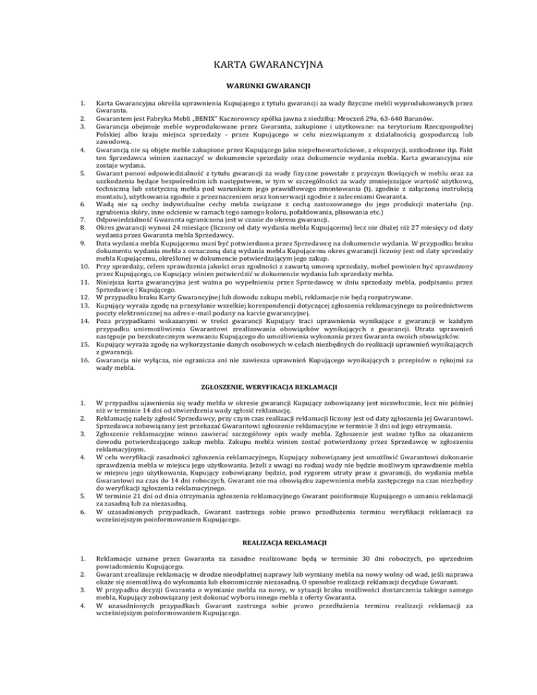 KARTA GWARANCYJNA WARUNKI GWARANCJI 1. 2. 3. 4. 5. 6. 7. 8. 9. 10. 11. 12. 13. 14. 15. 16. Karta Gwarancyjna określa uprawnienia Kupującego z tytułu gwarancji za wady fizyczne mebli wyprodukowanych przez Gwaranta. Gwarantem jest Fabryka Mebli „BENIX” Kaczorowscy spółka jawna z siedzibą: Mroczeń 29a, 63-‐640 Baranów. Gwarancja obejmuje meble wyprodukowane przez Gwaranta, zakupione i użytkowane: na terytorium Rzeczpospolitej Polskiej albo kraju miejsca sprzedaży -‐ przez Kupującego w celu niezwiązanym z działalnością gospodarczą lub zawodową. Gwarancją nie są objęte meble zakupione przez Kupującego jako niepełnowartościowe, z ekspozycji, uszkodzone itp. Fakt ten Sprzedawca winien zaznaczyć w dokumencie sprzedaży oraz dokumencie wydania mebla. Karta gwarancyjna nie zostaje wydana. Gwarant ponosi odpowiedzialność z tytułu gwarancji za wady fizyczne powstałe z przyczyn tkwiących w meblu oraz za uszkodzenia będące bezpośrednim ich następstwem, w tym w szczególności za wady zmniejszające wartość użytkową, techniczną lub estetyczną mebla pod warunkiem jego prawidłowego zmontowania (tj. zgodnie z załączoną instrukcją montażu), użytkowania zgodnie z przeznaczeniem oraz konserwacji zgodnie z zaleceniami Gwaranta. Wadą nie są cechy indywidualne cechy mebla związane z cechą zastosowanego do jego produkcji materiału (np. zgrubienia skóry, inne odcienie w ramach tego samego koloru, pofałdowania, plisowania etc.) Odpowiedzialność Gwaranta ograniczona jest w czasie do okresu gwarancji. Okres gwarancji wynosi 24 miesiące (liczony od daty wydania mebla Kupującemu) lecz nie dłużej niż 27 miesięcy od daty wydania przez Gwaranta mebla Sprzedawcy. Data wydania mebla Kupującemu musi być potwierdzona przez Sprzedawcę na dokumencie wydania. W przypadku braku dokumentu wydania mebla z oznaczoną datą wydania mebla Kupującemu okres gwarancji liczony jest od daty sprzedaży mebla Kupującemu, określonej w dokumencie potwierdzającym jego zakup. Przy sprzedaży, celem sprawdzenia jakości oraz zgodności z zawartą umową sprzedaży, mebel powinien być sprawdzony przez Kupującego, co Kupujący winien potwierdzić w dokumencie wydania lub sprzedaży mebla. Niniejsza karta gwarancyjna jest ważna po wypełnieniu przez Sprzedawcę w dniu sprzedaży mebla, podpisaniu przez Sprzedawcę i Kupującego. W przypadku braku Karty Gwarancyjnej lub dowodu zakupu mebli, reklamacje nie będą rozpatrywane. Kupujący wyraża zgodę na przesyłanie wszelkiej korespondencji dotyczącej zgłoszenia reklamacyjnego za pośrednictwem poczty elektronicznej na adres e-‐mail podany na karcie gwarancyjnej. Poza przypadkami wskazanymi w treści gwarancji Kupujący traci uprawnienia wynikające z gwarancji w każdym przypadku uniemożliwienia Gwarantowi zrealizowania obowiązków wynikających z gwarancji. Utrata uprawnień następuje po bezskutecznym wezwaniu Kupującego do umożliwienia wykonania przez Gwaranta swoich obowiązków. Kupujący wyraża zgodę na wykorzystanie danych osobowych w celach niezbędnych do realizacji uprawnień wynikających z gwarancji. Gwarancja nie wyłącza, nie ogranicza ani nie zawiesza uprawnień Kupującego wynikających z przepisów o rękojmi za wady mebla. 1. 2. 3. 4. 5. 6. 1. 2. 3. 4. ZGŁOSZENIE, WERYFIKACJA REKLAMACJI W przypadku ujawnienia się wady mebla w okresie gwarancji Kupujący zobowiązany jest niezwłocznie, lecz nie później niż w terminie 14 dni od stwierdzenia wady zgłosić reklamację. Reklamację należy zgłosić Sprzedawcy, przy czym czas realizacji reklamacji liczony jest od daty zgłoszenia jej Gwarantowi. Sprzedawca zobowiązany jest przekazać Gwarantowi zgłoszenie reklamacyjne w terminie 3 dni od jego otrzymania. Zgłoszenie reklamacyjne winno zawierać szczegółowy opis wady mebla. Zgłoszenie jest ważne tylko za okazaniem dowodu potwierdzającego zakup mebla. Zakupu mebla winien zostać potwierdzony przez Sprzedawcę w zgłoszeniu reklamacyjnym. W celu weryfikacji zasadności zgłoszenia reklamacyjnego, Kupujący zobowiązany jest umożliwić Gwarantowi dokonanie sprawdzenia mebla w miejscu jego użytkowania. Jeżeli z uwagi na rodzaj wady nie będzie możliwym sprawdzenie mebla w miejscu jego użytkowania, Kupujący zobowiązany będzie, pod rygorem utraty praw z gwarancji, do wydania mebla Gwarantowi na czas do 14 dni roboczych. Gwarant nie ma obowiązku zapewnienia mebla zastępczego na czas niezbędny do weryfikacji zgłoszenia reklamacyjnego. W terminie 21 dni od dnia otrzymania zgłoszenia reklamacyjnego Gwarant poinformuje Kupującego o uznaniu reklamacji za zasadną lub za niezasadną. W uzasadnionych przypadkach, Gwarant zastrzega sobie prawo przedłużenia terminu weryfikacji reklamacji za wcześniejszym poinformowaniem Kupującego. REALIZACJA REKLAMACJI Reklamacje uznane przez Gwaranta za zasadne realizowane będą w terminie 30 dni roboczych, po uprzednim powiadomieniu Kupującego. Gwarant zrealizuje reklamację w drodze nieodpłatnej naprawy lub wymiany mebla na nowy wolny od wad, jeśli naprawa okaże się niemożliwą do wykonania lub ekonomicznie niezasadną. O sposobie realizacji reklamacji decyduje Gwarant. W przypadku decyzji Gwaranta o wymianie mebla na nowy, w sytuacji braku możliwości dostarczenia takiego samego mebla, Kupujący zobowiązany jest dokonać wyboru innego mebla z oferty Gwaranta. W uzasadnionych przypadkach Gwarant zastrzega sobie prawo przedłużenia terminu realizacji reklamacji za wcześniejszym poinformowaniem Kupującego. 5. 6. 7. 8. Naprawa zostanie dokonana w sposób najmniej uciążliwy zarówno dla Kupującego jak i Gwaranta w miejscu użytkowania mebla lub w uzasadnionych przypadkach w serwisie Gwaranta. O sposobie realizacji reklamacji decyduje Gwarant po wcześniejszym poinformowaniu Kupującego. Kupujący zobowiązany jest umożliwić Gwarantowi dokonanie naprawy mebla w miejscu jego użytkowania. Jeżeli z uwagi na rodzaj wady nie będzie mo