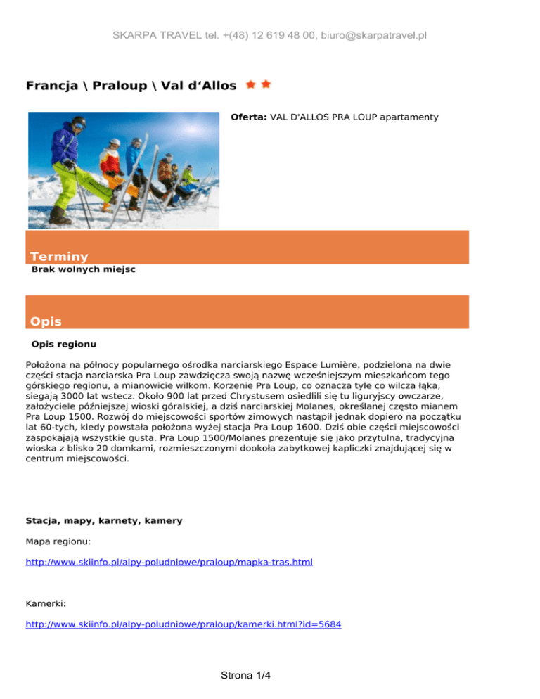 SKARPA TRAVEL tel. +(48) 12 619 48 00, [email protected] Francja \ Praloup \ Val d‘Allos Oferta: VAL D'ALLOS PRA LOUP apartamenty Terminy Brak wolnych miejsc Opis Opis regionu Położona na północy popularnego ośrodka narciarskiego Espace Lumière, podzielona na dwie części stacja narciarska Pra Loup zawdzięcza swoją nazwę wcześniejszym mieszkańcom tego górskiego regionu, a mianowicie wilkom. Korzenie Pra Loup, co oznacza tyle co wilcza łąka, siegają 3000 lat wstecz. Około 900 lat przed Chrystusem osiedlili się tu liguryjscy owczarze, założyciele późniejszej wioski góralskiej, a dziś narciarskiej Molanes, określanej często mianem Pra Loup 1500. Rozwój do miejscowości sportów zimowych nastąpił jednak dopiero na początku lat 60-tych, kiedy powstała położona wyżej stacja Pra Loup 1600. Dziś obie części miejscowości zaspokajają wszystkie gusta. Pra Loup 1500/Molanes prezentuje się jako przytulna, tradycyjna wioska z blisko 20 domkami, rozmieszczonymi dookoła zabytkowej kapliczki znajdującej się w centrum miejscowości. Stacja, mapy, karnety, kamery Mapa regionu: http://www.skiinfo.pl/alpy-poludniowe/praloup/mapka-tras.html Kamerki: http://www.skiinfo.pl/alpy-poludniowe/praloup/kamerki.html?id=5684 Strona 1/4 SKARPA TRAVEL tel. +(48) 12 619 48 00, [email protected] Pogoda: http://www.skiinfo.pl/alpy-poludniowe/praloup/pogoda.html Opis apartamentów Rezydencje**/*** (Pra Loup 1600 lub 1500) – przykłady. Rezydencje położone 50-800 m od centrum miejscowości i 50-500 m wyciągów. Wszystkie standardowo urządzone, niektóre z balkonem. Apartament 4 osobowy - pokój dzienny z sofą 2 osobową i łóżkiem podwójnym lub piętrowym, aneksem kuchennym, łazienka. Apartament 6 osobowy - 1 lub 2 sypialnie 2 osobowe (możliwe łóżka podwójne, piętrowe lub pojedyncze), aneks kuchenny, łazienka.Wyżywienie: we własnym zakresie. Opis miejscowości Położona na północy popularnego ośrodka narciarskiego Espace Lumière, podzielona na dwie części stacja narciarska Pra Loup zawdzięcza swoją nazwę wcześniejszym mieszkańcom tego górskiego regionu, a mianowicie wilkom. Korzenie Pra Loup, co oznacza tyle co wilcza łąka, siegają 3000 lat wstecz. Około 900 lat przed Chrystusem osiedlili się tu liguryjscy owczarze, założyciele późniejszej wioski góralskiej, a dziś narciarskiej Molanes, określanej często mianem Pra Loup 1500. Rozwój do miejscowości sportów zimowych nastąpił jednak dopiero na początku lat 60-tych, kiedy powstała położona wyżej stacja Pra Loup 1600. Dziś obie części miejscowości zaspokajają wszystkie gusta. Pra Loup 1500/Molanes prezentuje się jako przytulna, tradycyjna wioska z blisko 20 domkami, rozmieszczonymi dookoła zabytkowej kapliczki znajdującej się w centrum miejscowości. Pra Loup 1600, oddalona o 2 kilometry, cechuje się nowoczesnym wyglądem i bogatą ofertą après-ski. Przede wszystkim młodzi narciarze – z między innymi niewiele oddalonego Lazurowego Wybrzeża lub blisko położonych Włoch – lubią tu zaglądać. W ciągu dnia w kawiarniach i pasażach handlowych, a wieczorami w restuaracjach i barach panuje bardzo żywa, luźno-południowa atmosfera. Cena zawiera Cena 1220 zł od osoby w apartamencie 6 osobowym 1260 zł od osoby w apartamencie 4 osobowym Możliwość dokwaterowania pojedynczych osób. Przejazd autokarem ,7 noclegów, korzystanie z gazu, prądu, wody, 6 dniowy SKIPASS PRA LOUP i VAL D'ALLOS, ubezpieczenie podstawowe KL + NNW + choroby przewlwkłe + bagaż + sporty zimowe. Strona 2/4 SKARPA TRAVEL tel. +(48) 12 619 48 00, [email protected] Dopłaty 1. Opłaty klimatycznej 4 EUR / 7 dni osoba powyżej 18 lat, 2. Kaucji zwrotnej za apartament 350 EUR płatne kartą kredytową. 3. Pościeli, ręczniki ewentualna dopłata 16 EUR lub można zabrać własną, 4. Końcowe sprzątanie opłata 50-80 EUR (lub należy perfekcyjnie posprzątać apartament), 5.Wydatków własnych, dodatkowych ubezpieczeń i świadczeń niewymienionych w ofercie. 6. Możliwość wykupienia dodatkowego ubezpieczenie: - KL (koszty leczenia ) 30000 EUR, KR (koszty ratownictwa ) 6000 EUR, NNW( nastepstwa nieszczęśliwych wypadków) 15000 zł, bagaż 1000 zł : dopłata 60 zł / osoba - KL (koszty leczenia ) 30000 EUR, KR (koszty ratownictwa ) 6000 EUR, NNW( nastepstwa nieszczęśliwych wypadków) 15000 zł, bagaż 1000 zł, SS (sprzęt sportowy) 3000 zł, OC (odpowiedzialność cywilna) 30000 EUR : dopłata 100 zł / osoba Uwagi organizatora 1. Dzieci podlegają obowiązkowej jeździe w kaskach.2. Warunki uczestnictwa w imprezach organizowanych przez SKARPA TRAVEL Sp. z o.o. stanowią integralną część oferty, dostępne są w biurach sprzedających ofertę oraz na stronie. www.skarpatravel.pl. Uwagi przewoźnika Transport na trasach antenowych w Polsce możliwy jest mikrobusem, autokarem klasy turystycznej. Przy małej ilości osób organizator zastrzega sobie zmianę środka lokomocji np. na PKP, PKS lub zmianę godzin odjazdów najpóźniej na 24 godziny przed odjazdem. Trasa połączeń na terenie kraju zależy od zgłoszeń z poszczególnych miast, co może spowodować, że przejazd nie będzie realizowany najkrótszą z możliwych tras. Na trasach poza granicami Polski transport odbywa się autokarami wyposażonymi w siedzenia uchylne, klimatyzacją, toalety, video i nagłośnienie. Przy mniejszej ilości osób, możliwość przewozu uczestników małym autobusem bez WC. W autokarze obowiązuje całkowity zakaz palenia papierosów oraz spożywania alkoholu. Prosimy o przybycie na miejsce zbiórki najpóźniej 15 minut przed planowaną godziną odjazdu. Podane godziny wyjazdów i przyjazdów mogą ulec nieznacznemu przeniesieniu z przyczyn niezależnych od przewoźnika np.: złe warunki drogowe i atmosferyczne oraz zwiększenie ruchu na drogach itp. W trakcie przejazdu są organizowane postoje, zwykle w miejscach z barem i toaletą (ze względu na małą pojemność zbiorników, niskie temper