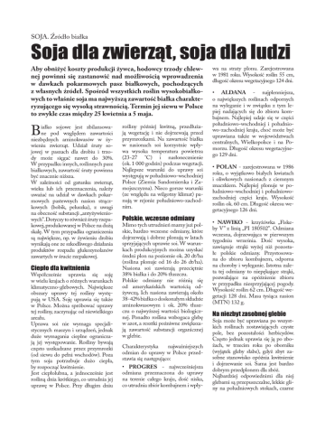 SOJA. Źródło białka Soja dla zwierząt, soja dla ludzi Aby obniżyć koszty produkcji żywca, hodowcy trzody chlewnej powinni się zastanowić nad możliwością wprowadzenia w dawkach pokarmowych pasz białkowych, pochodzących z własnych źródeł. Spośród wszystkich roślin wysokobiałkowych to właśnie soja ma najwyższą zawartość białka charakteryzującego się wysoką strawnością. Termin jej siewu w Polsce to zwykle czas między 25 kwietnia a 5 maja. B iałko sojowe jest zbilansowane pod względem zawartości niezbędnych aminokwasów w żywieniu zwierząt. Udział śruty sojowej w paszach dla drobiu i trzody może sięgać nawet do 30%. W przypadku innych, roślinnych pasz białkowych, zawartość śruty powinna być znacznie niższa. W zależności od gatunku zwierząt, wieku lub ich przeznaczenia, należy uważać na udział w dawkach pokarmowych pastewnych nasion strączkowych (bobik, peluszka), z uwagi na obecność substancji „antyżywieniowych”. Dotyczy to również śruty rzepakowej, produkowanej w Polsce na dużą skalę. W tym przypadku ograniczenia są największe, np. w żywieniu drobiu wynikają one ze szkodliwego działania produktów rozpadu glukozynolanów zawartych w śrucie rzepakowej. Ciepło dla kwitnienia Współcześnie uprawia się soję w wielu krajach o różnych warunkach klimatyczno-glebowych. Największe obszary uprawy tej rośliny występują w USA. Soję uprawia się także w Polsce. Można spróbować uprawy tej rośliny, zaczynając od niewielkiego areału. Uprawa soi nie wymaga specjalistycznych maszyn i urządzeń, jednak duże wymagania cieplne ograniczają jej występowanie. Rośliny bywają często uszkadzane przez przymrozki (od siewu do pełni wschodów). Poza tym soja potrzebuje dużo ciepła, by rozpocząć kwitnienie. Jest ciepłolubna, a jednocześnie jest rośliną dnia krótkiego, co utrudnia jej uprawę w Polsce. Przy długim dniu rośliny później kwitną, przedłużają wegetację i nie dojrzewają przed przymrozkami. Na zawartość białka w nasionach soi korzystnie wpływa wysoka temperatura powietrza (23-27 °C) i nasłonecznienie (ok. 1 000 godzin) podczas wegetacji. Najlepsze warunki do uprawy soi występują w południowo-wschodniej Polsce (Ziemia Sandomierska i Zamojszczyzna). Nieco gorsze warunki (ze względu na wilgotny klimat) panują w rejonie południowo-zachodnim. Polskie, wczesne odmiany Mimo tych utrudnień mamy już polskie, bardzo wczesne odmiany, które dojrzewają i dobrze plonują w latach sprzyjających uprawie soi. W warunkach produkcyjnych można uzyskać średni plon na poziomie ok. 20 dt/ha (roślina plonuje od 16 do 26 dt/ha). Nasiona soi zawierają przeciętnie 38% białka i do 20% tłuszczu. Polskie odmiany nie różnią się od amerykańskich wartością odżywczą. Ich nasiona zawierają około 38-42% białka o doskonałym składzie aminokwasowym i ok. 20% tłuszczu o najwyższej wartości biologicznej. Ponadto roślina wzbogaca glebę w azot, a resztki pożniwne zwiększają zawartość substancji organicznej w glebie. Charakterystyka najważniejszych odmian do uprawy w Polsce przedstawia się następująco: • PROGRES - najwcześniejsza odmiana przeznaczona do uprawy na terenie całego kraju, dość niska, co utrudnia zbiór kombajnem i wpły- wa na straty plonu. Zarejestrowana w 1981 roku. Wysokość roślin 55 cm, długość okresu wegetacyjnego 124 dni. • ALDANA - najplenniejsza, o największych roślinach odpornych na wyleganie i w związku z tym lepiej nadających się do zbioru kombajnem. Najlepiej udaje się w części południowo-wschodniej i południowo-zachodniej kraju, choć może być uprawiana także w województwach centralnych, Wielkopolsce i na Pomorzu. Długość okresu wegetacyjnego 129 dni. • POLAN - zarejestrowana w 1986 roku, o wyjątkowo białych kwiatach i oliwkowych nasionach z ciemnym znaczkiem. Najlepiej plonuje w południowo-wschodniej i południowozachodniej części kraju. Wysokość roślin ok. 60 cm. Długość okresu wegetacyjnego 126 dni. • NAWIKO - krzyżówka „Fiskeby V” z linią „PI 180502”. Odmiana wczesna, dojrzewająca w pierwszym tygodniu września. Dość wysoka, zawiązuje strąki wyżej niż pozostałe polskie odmiany. Przystosowana do zbioru kombajnem, odporna na choroby i wyleganie. Istotna zaleta tej odmiany to niepękające strąki, pozwalające na opóźnienie zbioru w przypadku niesprzyjającej pogody. Wysokość roślin 62 cm. Długość wegetacji 128 dni. Masa tysiąca nasion (MTN) 132 g. Na niezbyt zasobnej glebie Soja może być uprawiana po wszystkich roślinach zostawiających czyste pole, bez pozostałości herbicydów. Często jednak uprawia się ją po zbożach, w trzecim roku po oborniku (wyjątek gleby słabe), gdyż zbyt zasobne stanowisko opóźnia kwitnienie i dojrzewanie soi. Sama jest bardzo dobrym przedplonem dla zbóż. Najbardziej odpowiednimi dla niej glebami są przepuszczalne, lekkie gliny na południowych stokach, czarne ziemie od klasy bonitacyjnej I do IV a lub IV b w dobrej kulturze. Nie lubi gleb podmokłych, zimnych, kwaśnych, o zbitej strukturze i niskiej zawartości próchnicy. Nawożenie i uprawa Gleby zakwaszone należy jesienią zwapnować. Uprawa gleby, jak pod inne rośliny jare. Ważne, aby powierzchnia pola była dobrze wyrównana i bez bruzd, co ułatwia niskie cięcie roślin przy zbiorze kombajnem. Orientacyjne dawki nawozów na 1 ha w czystym składniku: N - 20-60 kg (w 2 dawkach po wschodach i w początkach kwitnienia), P2O5 - 80 kg (stosowany jesienią), K2O - 120 kg (stosowany najlepiej jesienią). Na stanowiskach dobrych i zasobnych w azot zmniejszamy nawożenie azotem, by nie przedłużać dojrzewania roślin. W wypadku niedoboru mikroelementów (bor, molibden, mangan), należy je dostarczyć, stosując nawozy dolistne podczas wegetacji, w fazie tworzenia pąków kwiatowych. Siew i ochrona roślin Nasiona należy zaprawiać przeciw chorobom grzybowym (np. Vitawax 200 FS 400 m