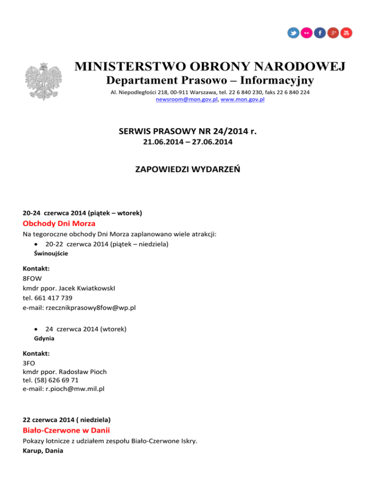 MINISTERSTWO OBRONY NARODOWEJ Departament Prasowo – Informacyjny Al. Niepodległości 218, 00-911 Warszawa, tel. 22 6 840 230, faks 22 6 840 224 [email protected], www.mon.gov.pl SERWIS PRASOWY NR 24/2014 r. 21.06.2014 – 27.06.2014 ZAPOWIEDZI WYDARZEŃ 20-24 czerwca 2014 (piątek – wtorek) Obchody Dni Morza Na tegoroczne obchody Dni Morza zaplanowano wiele atrakcji: 20-22 czerwca 2014 (piątek – niedziela) Świnoujście Kontakt: 8FOW kmdr ppor. Jacek KwiatkowskI tel. 661 417 739 e-mail: [email protected] 24 czerwca 2014 (wtorek) Gdynia Kontakt: 3FO kmdr ppor. Radosław Pioch tel. (58) 626 69 71 e-mail: [email protected] 22 czerwca 2014 ( niedziela) Biało-Czerwone w Danii Pokazy lotnicze z udziałem zespołu Biało-Czerwone Iskry. Karup, Dania Kontakt: Rzecznik prasowy DG RSZ p.o. ppłk Artur Goławski tel. +48 519 038 593 e-mail: [email protected] 22 czerwca 2014 ( niedziela) Wojskowe zawody sportowe Mistrzostwa Wojska Polskiego w biegach przełajowych. Słupsk Kontakt: 7BOW kpt. Karolina Krzewina Hyc tel. 721 890 408 e-mail: [email protected] 23 czerwca 2014 ( poniedziałek) Polsko-hiszpańskie konsultacje międzyrządowe Pod przewodnictwem premierów Polski i Hiszpanii – Donalda Tuska i Mariano Rajoya odbędą się polskohiszpańskie konsultacje międzyrządowe. W ramach spotkania odbędą się rozmowy ministrów obrony Tomasza Siemoniaka i Pedro Morenésa Eulate. Gdańsk Kontakt: Centrum Informacyjne Rządu tel.: +48 22 694 74 74 e-mail: [email protected] 23 czerwca 2014 ( poniedziałek) Pierwsze w Polsce europejskie zawody robotów Roboty wojskowe z Niemiec, Szwajcarii, Finlandii, Rosji, Kanady i Polski wystartują na poligonie WAT w pierwszych w Polsce europejskich zawodach robotów wojskowych. Impreza potrwa do 27 czerwca. Więcej… Warszawa, Poligon Wojskowej Akademii Technicznej Kontakt: Jerzy Markowski rzecznik prasowy M-ELROB 2014 tel. 22 683 97 33 tel. 601 201 289 email: [email protected] 23 - 24 czerwca 2014 (poniedziałek - wtorek) Wizyta wiceminister Oczkowicz w 11LDKPanc Podsekretarz stanu w MON Beata Oczkowicz złoży wizytę w 11 Lubuskiej Dywizji Kawalerii Pancernej i jednostkach podległych. Żagań Kontakt: mjr Artur Pinkowski tel. 68 475 81 22 / 68 475 80 07, kom. tel. 695 858 042 email: [email protected] 23 czerwca 2014 ( poniedziałek), godz. 11.00 i 27 czerwca 2014 (piątek), godz. 14.00 Dzień z mundurem 23 czerwca 2014 ( poniedziałek), godz. 11.00 Na terenie 42 Bazy Lotnictwa Szkolnego odbędzie się konferencja prasowa na temat wielkiego festynu pt. "Dzień z mundurem". Na konferencji prasowej obecni będą wszyscy dowódcy i komendanci jednostek służb mundurowych oraz przedstawiciele władz miasta. 27 czerwca 2014 ( piątek) Festyn „Dzień z mundurem” połączony będzie z obchodami święta 42 Bazy Lotnictwa Szkolnego od godz. 14.00 na Placu Konstytucji 3 Maja i Placu Corazziego . Podczas festynu, który rozpocznie się o godz. 14.00 zaprezentują się wszystkie służby mundurowe ( 7 formacji) regionu radomskiego. Radom Kontakt: mjr Łukasz Baranowski tel. 605 692 911 24 czerwca 2014 ( wtorek) Uroczystości rocznicowe 55. rocznica utworzenia Dywizjonu Zabezpieczenia Hydrograficznego MW. Port Wojenny Gdynia Kontakt: 3FO kmdr ppor. Radosław Pioch tel. (58) 626 69 71 e-mail: [email protected] 24 - 26 czerwca 2014 (wtorek – czwartek) Balt Military Expo Przedstawiciele kierownictwa MON wezmą udział w XIII Bałtyckich Targach Militarnych BALT-MILITARYEXPO. Centrum Wystawienniczo-Kongresowe AMBEREXPO w Gdańsku Więcej… Kontakt: Departament Prasowo – Informacyjny MON tel. (22) 6 840230 e-mail: [email protected] 26 czerwca 2014 (czwartek) IX edycja konkursu LEX ET PATRIA Komenda Główna Żandarmerii Wojskowej, Departament Wychowania i Promocji Obronności MON i Stowarzyszenie Żandarmerii Wojskowej „Żandarm” zapraszają na finałową galę konkursu LEX ET PATRIA. Warszawa, Centralna Biblioteka Wojskowa (ul. Ostrobramska 109) Kontakt: Rzecznik prasowy KG ŻW mjr Paweł Durka tel. (22) 6 857 376, 724 940 151 e-mail: [email protected] 26 - 29 czerwca 2014 (czwartek - niedziela) Festiwal Orkiestr Wojskowych – Warszawa 2014 Niezwykła rewia, barwne galowe mundury, pokazy musztry paradnej, występy ponad 400 artystów – wszystko to czeka nas w najbliższy weekend, podczas Festiwalu Orkiestr Wojskowych – Warszawa 2014. Więcej… Warszawa Kontakt: Rzecznik Prasowy DGW ppłk Joanna Klejszmit – Bodziuch tel. (22) 6 879 603, tel. kom.: 721 810 749 e-mail:[email protected] 27 czerwca 2014 (piątek) Zakończenie kursu Kurs doskonalący obsługi kutrów holowniczych KH-200 oraz pływających transporterów samobieżnych PTSM. Wrocław Kontakt: CSWInż. i Chem. kpt. Ewa Nowicka-Szlufik tel. 723 694 403 e-mail: [email protected] 27 czerwca 2014 (piątek) Święto 1BLog Z okazji 10. rocznicy utworzenia 1 Pomorskiej Brygady Logistycznej odbędzie się uroczysty apel oraz żołnierski piknik. Bydgoszcz Kontakt: 1BLog por. Anna Żuchowska tel. 690 009 121 e-mail: [email protected] 27 - 28 czerwca 2014 (piątek - sobota) Święto 12 DZ Żołnierze i pracownicy wezmą udział w uroczystościach związanych z obchodami święta 12 Dywizji Zmechanizowanej. Szczecin Kontakt: 12DZ mjr Marek Nabzdyjak tel. 605 064 257 e-mail: [email protected] e-mail: [email protected] 27 - 28 czerwca 2014 (piątek - sobota) Wystrzałowy piknik brygady 17 Wielkopolska Brygada Zmechanizowana obchodzi swoje święto. Z tej okazji przygotowano wiele atrakcji. Więcej… Wędrzyn Kontakt: 17BZ por. Martyna Fedro-Samojedny tel. 695 885 032 e-mail: [email protected] KRONIKA 15 czerwca 2014 ( niedziela) Pracownicy cywilni na misji jak żołnierze Ratownicy medyczni, psychologowie czy lekarze, którzy pracują na misjach, nie będą już mogli odbierać dodatkowego wynagrodzenia za nadgodziny. We wtorek Sejm zdecydował, że będzie ich obowiązywał – jak żołnierzy – zadaniowy czas pracy. Jeżeli zmiany zaakceptuje także Senat i prezydent, zaczną obowiązywać od je
