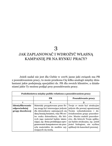 3 JAK ZAPLANOWAĆ I WDROŻYĆ WŁASNĄ KAMPANIĘ PR NA RYNKU PRACY? Jeżeli nadal nie jest dla Ciebie w 100% jasne jaki związek ma PR z poszukiwaniem pracy, to może przekona Cię kilka analogii między działaniami jakie podejmują specjaliści ds. PR dla swoich klientów, a działaniami jakie Ty możesz podjąć przy poszukiwaniu pracy. Podobieństwa między public relations a poszukiwaniem pracy PR 1 Identyfikowanie odpowiedniej grupy docelowej Poszukiwanie pracy 2 3 Materiały przygotowane przez firmę mogą być interesujące jedynie dla dziennikarzy zajmujących się daną branżą/tematem, więc PR-owiec szuka dziennikarzy, dla których jego materiał będzie interesujący, np.: firma produkująca oprogramowanie komputerowe nie przesyła materiałów do mediów zajmujących się modą. Twoje cv może być atrakcyjne jedynie dla pewnej ograniczonej Twoim wykształceniem i doświadczeniem grupy pracodawców. Musisz znaleźć pracodawców, dla których Twoja aplikacja będzie atrakcyjna, np.: jeżeli jesteś biologiem, nie wyślesz aplikacji do kancelarii prawnej. 46 Rozdział 4 1 2 3 Komunikowanie się z konkretnymi osobami Kierowanie komunikatu do odpowiednich – zainteresowanych nim – osób jest kluczowe. Specjalista ds. PR unika przesyłania materiałów o firmie na adres ogólny redakcji. To tak jak wołanie do tłumu. Każdy dziennikarz zajmuje się w redakcji określonym zakresem tematycznym i interesują go jedynie informacje dotyczące jego obszaru pracy. Ty powinieneś unikać przesyłania swojego cv na adres ogólny firmy. Zawsze staraj się dotrzeć do konkretnej osoby. Dlatego bardzo ważne w poszukiwaniu pracy, jest pozyskiwanie wszelkich możliwych informacji o odbiorcach i tworzenie baz kontaktów. Więcej na ten temat w podrozdziale 3.2 „Jak ważne jest zrozumienie Twojego odbiorcy i jak odpowiedzieć na jego potrzeby?”. Dokumenty to wizytówka, cv i list motywacyjny są analogiczne do materiałów prasowych na temat firmy Materiały prasowe o firmie przesyłane do mediów są podstawowym źródłem informacji o nadawcy. Jeżeli są niedbałe, nierzetelne i niepunktualne, dziennikarz nie będzie z nich korzystał, a ze specjalistą ds. PR, który go potraktował nieprofesjonalnie, nie będzie się kontaktował. Podobnie Twoja aplikacja o pracę jest podstawowym źródłem informacji o Tobie, i musi być przygotowana z najwyższą starannością. cv i list motywacyjny można porównać do materiałów prasowych i zasady obowiązujące przy ich przygotowywaniu można z powodzeniem wykorzystać w procesie przygotowywania swojej aplikacji. Więcej na ten temat w podrozdziale 3.6.1 „Jak napisać cv i list motywacyjny?”. Rozmowa o pracę to wywiad radiowy lub telewizyjny Specjalista ds. PR solidnie przygotowuje siebie i innych mówców do wywiadów prasowych i telewizyjnych, stosując rozmaite techniki mające na celu m.in. zmaksymalizowanie szansy przekazania kluczowych komunikatów firmy i kreowanie jej wizerunku. Do rozmowy o pracę powinieneś przygotowywać się tak jak PRowiec przygotowuje siebie i swojego klienta do wywiadu radiowego lub telewizyjnego. Więcej na ten temat w podrozdziale 3.6.2 „Jak dobrze przygotować się do rozmowy o pracę?”. Jeżeli nie ma Cię w Internecie, to nie istniejesz Sprawna – pod względem komunikacyjnym i nie tylko – firma nie jest obecnie w stanie funkcjonować bez strony internetowej, biura prasowego, pozycjonowania w wyszukiwarkach. Twój przyszły pracodawca oczekuje, że znajdzie informacje na Twój temat w Internecie: profil na portalu społecznościowym, życiorys w bazie cv takiego portalu, wypowiedzi na forach, mikrologa. Więcej na ten temat w podrozdziale 6.3.6 „Co i jak robić w Internecie”. Czy wiesz, że cały czas stosujesz autoprezentację i kreujesz swój wizerunek? 1 47 2 3 Dobre relacje to podstawa Jeżeli firma nie prowadzi ciągłej współpracy i nie utrzymuje relacji z dziennikarzami, nie będzie informowana o ich potrzebach. W pierwszej kolejności będą oni wykorzystywać znane sobie kanały komunikacji, np.: ze specjalistami konkurencji. Częścią ogłoszeń o pracę z różnych powodów, np.: braku czasu – nie jest nigdzie publikowanych, pracodawcy wykorzystują swoje relacje, proszą znajomych o rekomendacje lub samodzielnie przeszukują bazy cv w serwisach poświęconych pracy lub profile na biznesowych portalach społecznościowych. Najważniejsze to wykorzystać dobry czas Przesłanie dziennikarzowi materiałów w czasie, w którym ich potrzebuje i – co ważne – przed „zamknięciem numeru” jest kwestią kluczową. Jeżeli się spóźniasz, przestajesz być wiarygodny i dziennikarz skorzysta z innego źródła informacji – np.: konkurencji. Przesłanie aplikacji o pracę w terminie jest warunkiem koniecznym uczestniczenia w dalszej rekrutacji. Jeżeli się spóźnisz, pracodawca najpewniej nie weźmie Twojej osoby pod uwagę w dalszym procesie rekrutacji, może się też okazać, że firma właśnie kogoś na to miejsce zatrudniła. Klasyczne metody to „za mało” Słychać głosy, że „klasyczny PR” – oparty na przesyłaniu materiałów prasowych mediom – jest martwy, gdyż dziennikarze, głównie dzięki Internetowi, mają obecnie niemalże nieograniczony dostęp do różnego typu informacji o firmach i nie są już uzależnieni od materiałów przesłanych przez PR-owca. Obecnie PRowiec ma za zadanie być tam, gdzie dziennikarze będą szukać informacji. Podobnie zdaje się być z tradycyjnymi sposobami poszukiwania pracy. W chwili obecnej nie wystarczy, że będziemy odpowiadać na ogłoszenia o pracę. Jeżeli nie będziemy obecni w Internecie, nie poinformujemy „świata”, że szukamy pracy, nie będziemy na bieżąco z tym, co dzieje się w naszej branży, nawet nie dowiemy się o większości dostępnych na rynku wakatów, nie mówiąc o uczestniczeniu w procesie rekrutacji. Z uwagi na fakt, że zarówno poszukiwanie pracy, jak i PR opierają si