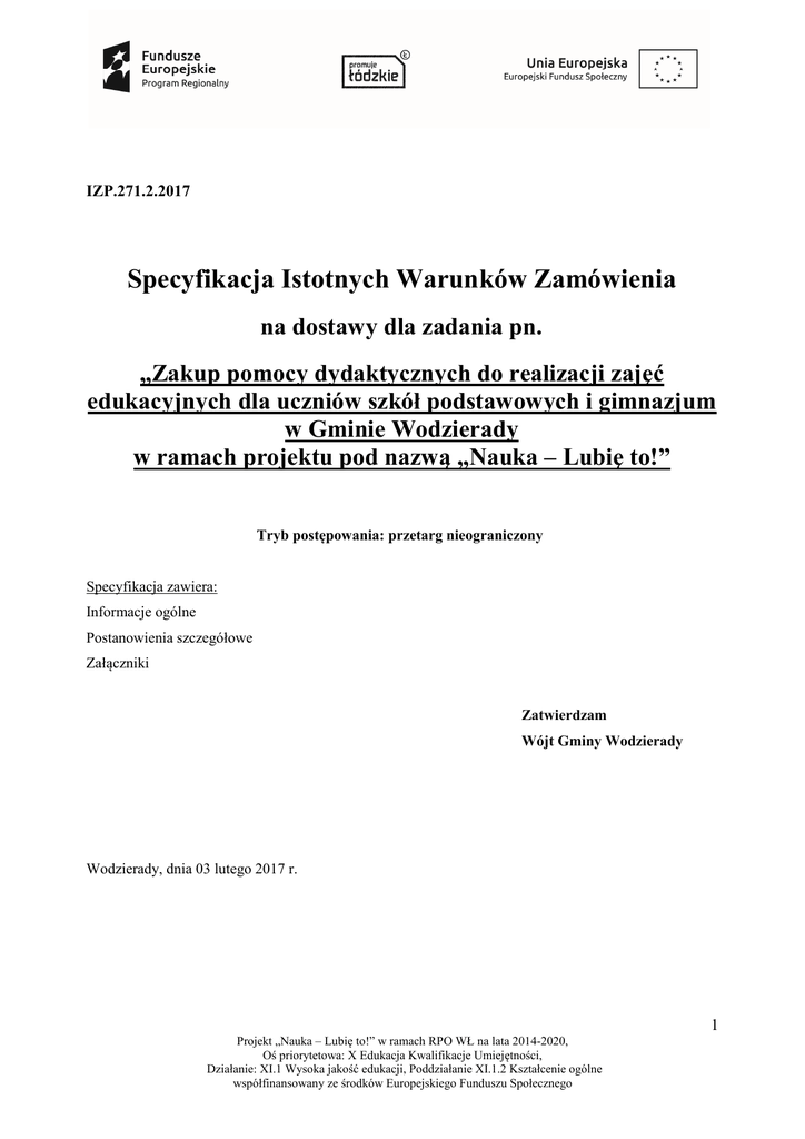 IZP.271.2.2017 Specyfikacja Istotnych Warunków Zamówienia na dostawy dla zadania pn. „Zakup pomocy dydaktycznych do realizacji zajęć edukacyjnych dla uczniów szkół podstawowych i gimnazjum w Gminie Wodzierady w ramach projektu pod nazwą „Nauka – Lubię to!” Tryb postępowania: przetarg nieograniczony Specyfikacja zawiera: Informacje ogólne Postanowienia szczegółowe Załączniki Zatwierdzam Wójt Gminy Wodzierady Wodzierady, dnia 03 lutego 2017 r. 1 Projekt „Nauka – Lubię to!” w ramach RPO WŁ na lata 2014-2020, Oś priorytetowa: X Edukacja Kwalifikacje Umiejętności, Działanie: XI.1 Wysoka jakość edukacji, Poddziałanie XI.1.2 Kształcenie ogólne współfinansowany ze środków Europejskiego Funduszu Społecznego I. INFORMACJE OGÓLNE 1. Zamawiający 1.1. Gmina Wodzierady Wodzierady 24, 98-105 Wodzierady woj. Łódzkie Tel. 43 677-33-22 Fax: 43 677-33-15 e-mail: [email protected] adres strony internetowej: www.wodzierady.pl Godziny urzędowania: Poniedziałek 900 – 1700, wtorek – piątek 700 - 1500 1.2. Znak postępowania: IZP.271.2.2017 W korespondencji kierowanej do Zamawiającego należy posługiwać się tym znakiem. 2. Tryb udzielania zamówienia 2.1. Postępowanie prowadzone jest w oparciu o: 1) Ustawę z dnia 29 stycznia 2004r. Prawo zamówień publicznych - (tj. Dz. U. z 2015r., poz. 2164 ze zm.) oraz wydanymi na podstawie niniejszej ustawy rozporządzeniami wykonawczymi dotyczącymi przedmiotowego zamówienia, a w szczególności: a) Rozporządzenie Ministra Rozwoju z dnia 26 lipca 2016r. w sprawie rodzajów dokumentów, jakich może żądać zamawiający od wykonawcy w postępowaniu o udzielenie zamówienia (Dz. U. z 2016r., poz. 1126), b) Rozporządzenie Prezesa Rady Ministrów z dnia 28 grudnia 2015r. w sprawie średniego kursu złotego w stosunku do euro stanowiącego podstawę przeliczenia wartości zamówień publicznych (Dz. U. z 2015r., poz. 2254), c) Rozporządzenie Prezesa Rady Ministrów z dnia 28 grudnia 2015r. w sprawie kwot wartości zamówień oraz konkursów, od których jest uzależniony obowiązek przekazywania ogłoszeń Urzędowi Oficjalnych Publikacji Wspólnot Europejskich (Dz. U. z 2015r., poz. 2263, d) Ustawę z dnia 23 kwietnia 1964r. Kodeks cywilny (t.j. Dz. U. z 2016r., poz. 380 ze zm.), e) Ustawę z dnia 16 kwietnia 1993r. o zwalczaniu nieuczciwej konkurencji (t.j. Dz. U z 2003r., Nr 153, poz. 1503 ze zm.). 2 Projekt „Nauka – Lubię to!” w ramach RPO WŁ na lata 2014-2020, Oś priorytetowa: X Edukacja Kwalifikacje Umiejętności, Działanie: XI.1 Wysoka jakość edukacji, Poddziałanie XI.1.2 Kształcenie ogólne współfinansowany ze środków Europejskiego Funduszu Społecznego 2.2. Postępowanie prowadzone jest w trybie przetargu nieograniczonego o wartości szacunkowej poniżej progów ustalonych na podstawie art. 11 ust. 8 Pzp. 2.3. Podstawa prawna wyboru trybu udzielenia zamówienia publicznego - art. 10 ust. 1 ustawy art. 39 - 46 Ustawy z dnia 29 stycznia 2004r. Prawo zamówień publicznych. 2.4. Ilekroć w niniejszej SIWZ mowa jest o: 1) ustawie Pzp - rozumie się przez to Ustawę z dnia 29 stycznia 2004r. Prawo zamówień publicznych (tj. Dz. U. z 2015r., poz. 2164 ze zm.), 2) Zamawiającym - rozumie się przez to Gminę Wodzierady, Wodzierady 24, 98-105 Wodzierady, 3) Wykonawcy - rozumie się przez to podmiot, który ubiega się o wykonanie zamówienia, złożył ofertę na wykonanie zamówienia albo zawrze z Zamawiającym umowę w sprawie wykonania zamówienia, 4) SIWZ - rozumie się przez to niniejszą specyfikację istotnych warunków zamówienia. 2.5. Wszelkie informacje przedstawione w SIWZ przeznaczone są wyłącznie w celu przygotowania oferty i w żadnym wypadku nie powinny być wykorzystywane w inny sposób. 2.6. W zakresie nieuregulowanym w SIWZ zastosowanie mają przepisy ustawy Pzp. 2.7. Miejsce publikacji ogłoszenia o przetargu: 1) Biuletyn Zamówień Publicznych, 2) strona internetowa www.wodzierady.pl 3) tablica ogłoszeń w budynku Urzędu Gminy Wodzierady 4) baza konkurencyjności www.bazakonkurencyjnosci.funduszeeuropejskie.gov.pl II. POSTANOWIENIA SZCZEGÓŁOWE 3. Opis przedmiotu zamówienia 3.1. Wspólny Słownik Zamówień (CPV): 39162100-6 Pomoce dydaktyczne. 3.2. Przedmiotem zamówienia jest zakup pomocy dydaktycznych do realizacji zajęć edukacyjnych w ramach projektu pod nazwą „Nauka – Lubię to!” realizowanego przez Gminę Wodzierady w ramach Osi Priorytetowej XI Edukacja, Kwalifikacje Umiejętności, Działania XI.1 Wysoka jakość edukacji, Poddziałania XI.1.2 Kształcenie ogólne Regionalnego Programu Operacyjnego Województwa Łódzkiego na lata 2014-2020. 3.3. Przedmiot zamówienia został podzielony na 4 części - zadania. 3.4. Zamówienie obejmuje następujące części: 1) Zakup pomocy dydaktycznych do zajęć dydaktyczno-wyrównawczych z matematyki 2) Zakup pomocy dydaktycznych do pracowni przyrodniczej 3) Zakup pomocy dydaktycznych do pracowni chemicznej 4) Zakup pomocy dydaktycznych do zajęć specjalistycznych (zajęcia logopedyczne, psychoedukacyjne, korekcyjno-kompensacyjne, dysleksja) 5) Zakup sprzętu TIK. 3.5. Wyroby zgrupowane w ramach zadania stanowią łącznie odrębną część zamówienia. 3 Projekt „Nauka – Lubię to!” w ramach RPO WŁ na lata 2014-2020, Oś priorytetowa: X Edukacja Kwalifikacje Umiejętności, Działanie: XI.1 Wysoka jakość edukacji, Poddziałanie XI.1.2 Kształcenie ogólne współfinansowany ze środków Europejskiego Funduszu Społecznego 3.6. Szczegółowy zakres przedmiotu zamówienia oraz wykaz rzeczowy i ilościowy pomocy dydaktycznych i materiałów stanowi załącznik nr 2 do SIWZ - Formularz ofertowy. Zamawiający informuje, iż wskazanie nazw zwyczajowych w zamieszczonych elementach opisu przedmiotu zamówienia służy wyłącznie określeniu cech technicznych i jakościowych. Zamawiający dopuszcza możliwość przedstawienia w ofercie asortymentu równoważnego pod warunkiem, iż oferowany asortyment b