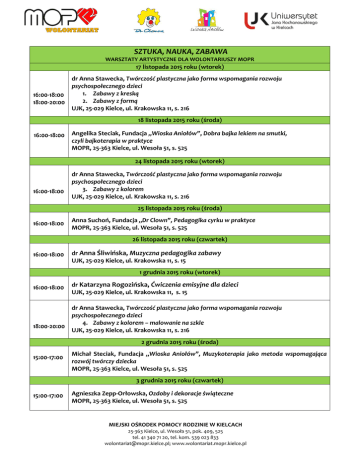 SZTUKA, NAUKA, ZABAWA WARSZTATY ARTYSTYCZNE DLA WOLONTARIUSZY MOPR 17 listopada 2015 roku (wtorek) 16:00-18:00 18:00-20:00 dr Anna Stawecka, Twórczość plastyczna jako forma wspomagania rozwoju psychospołecznego dzieci 1. Zabawy z kreską 2. Zabawy z formą UJK, 25-029 Kielce, ul. Krakowska 11, s. 216 18 listopada 2015 roku (środa) 16:00-18:00 Angelika Steciak, Fundacja „Wioska Aniołów”, Dobra bajka lekiem na smutki, czyli bajkoterapia w praktyce MOPR, 25-363 Kielce, ul. Wesoła 51, s. 525 24 listopada 2015 roku (wtorek) 16:00-18:00 dr Anna Stawecka, Twórczość plastyczna jako forma wspomagania rozwoju psychospołecznego dzieci 3. Zabawy z kolorem UJK, 25-029 Kielce, ul. Krakowska 11, s. 216 25 listopada 2015 roku (środa) 16:00-18:00 Anna Suchoń, Fundacja „Dr Clown”, Pedagogika cyrku w praktyce MOPR, 25-363 Kielce, ul. Wesoła 51, s. 525 26 listopada 2015 roku (czwartek) 16:00-18:00 dr Anna Śliwińska, Muzyczna pedagogika zabawy UJK, 25-029 Kielce, ul. Krakowska 11, s. 15 1 grudnia 2015 roku (wtorek) 16:00-18:00 18:00-20:00 dr Katarzyna Rogozińska, Ćwiczenia emisyjne dla dzieci UJK, 25-029 Kielce, ul. Krakowska 11, s. 15 dr Anna Stawecka, Twórczość plastyczna jako forma wspomagania rozwoju psychospołecznego dzieci 4. Zabawy z kolorem – malowanie na szkle UJK, 25-029 Kielce, ul. Krakowska 11, s. 216 2 grudnia 2015 roku (środa) 15:00-17:00 Michał Steciak, Fundacja „Wioska Aniołów”, Muzykoterapia jako metoda wspomagająca rozwój twórczy dziecka MOPR, 25-363 Kielce, ul. Wesoła 51, s. 525 3 grudnia 2015 roku (czwartek) 15:00-17:00 Agnieszka Zepp-Orłowska, Ozdoby i dekoracje świąteczne MOPR, 25-363 Kielce, ul. Wesoła 51, s. 525 MIEJSKI OŚRODEK POMOCY RODZINIE W KIELCACH 25-363 Kielce, ul. Wesoła 51, pok. 409, 525 tel. 41 340 71 20, tel. kom. 539 023 833 [email protected]; www.wolontariat.mopr.kielce.pl