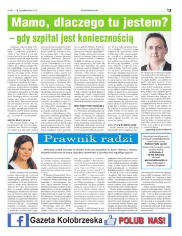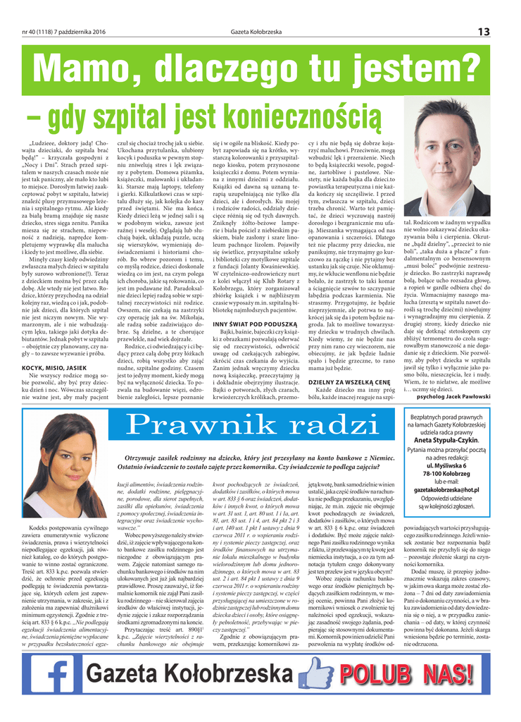 nr 40 (1118) 7 października 2016 13 Gazeta Kołobrzeska Mamo, dlaczego tu jestem? – gdy szpital jest koniecznością „Ludzieee, doktory jadą! Chowajta dzieciaki, do szpitala brać będą!” – krzyczała gospodyni z „Nocy i Dni”. Strach przed szpitalem w naszych czasach może nie jest tak paniczny, ale mało kto lubi to miejsce. Dorosłym łatwiej zaakceptować pobyt w szpitalu, łatwiej znaleźć plusy przymusowego leżenia i szpitalnego rytmu. Ale kiedy za białą bramą znajduje się nasze dziecko, stres sięga zenitu. Panika miesza się ze strachem, niepewność z nadzieją, naprędce kompletujemy wyprawkę dla malucha i kiedy to jest możliwe, dla siebie. Minęły czasy kiedy odwiedziny zwłaszcza małych dzieci w szpitalu były surowo wzbronione(!). Teraz z dzieckiem można być przez całą dobę. Ale wtedy nie jest łatwo. Rodzice, którzy przychodzą na odział kolejny raz, wiedzą co i jak, podobnie jak dzieci, dla których szpital nie jest niczym nowym. Nie wymarzonym, ale i nie wzbudzającym lęku, takiego jaki dotyka debiutantów. Jednak pobyt w szpitalu – obojętnie czy planowany, czy nagły – to zawsze wyzwanie i próba. KOCYK, MISIO, JASIEK Nie wszyscy rodzice mogą sobie pozwolić, aby być przy dziecku dzień i noc. Wówczas szczególnie ważne jest, aby mały pacjent czuł się chociaż trochę jak u siebie. Ukochana przytulanka, ulubiony kocyk i poduszka w pewnym stopniu zniwelują stres i lęk związany z pobytem. Domowa piżamka, książeczki, malowanki i układanki. Starsze mają laptopy, telefony i gierki. Kilkulatkowi czas w szpitalu dłuży się, jak kolejka do kasy przed świętami. Nie ma końca. Kiedy dzieci leżą w jednej sali i są w podobnym wieku, zawsze jest raźnej i weselej. Oglądają lub słuchają bajek, układają puzzle, uczą się wierszyków, wymieniają doświadczeniami i historiami chorób. Bo wbrew pozorom i temu, co myślą rodzice, dzieci doskonale wiedzą co im jest, na czym polega ich choroba, jakie są rokowania, co jest im podawane itd. Paradoksalnie dzieci lepiej radzą sobie w szpitalnej rzeczywistości niż rodzice. Owszem, nie czekają na zastrzyki czy operację jak na św. Mikołaja, ale radzą sobie zadziwiająco dobrze. Są dzielne, a te chorujące przewlekle, nad wiek dojrzałe. Rodzice, ci odwiedzający i ci będący przez całą dobę przy łóżkach dzieci, robią wszystko aby zająć nudne, szpitalne godziny. Czasem jest to jedyny moment, kiedy mogą być na wyłączność dziecka. To pozwala na budowanie więzi, odrobienie zaległości, lepsze poznanie się i w ogóle na bliskość. Kiedy pobyt zapowiada się na krótko, wystarczą kolorowanki z przyszpitalnego kiosku, potem przynoszone książeczki z domu. Potem wymiana z innymi dziećmi z oddziału. Książki od dawna są uznaną terapią uzupełniającą nie tylko dla dzieci, ale i dorosłych. Ku mojej i rodziców radości, oddziały dziecięce różnią się od tych dawnych. Zniknęły żółto-beżowe lamperie i biała pościel z niebieskim paskiem, białe zasłony i szare linoleum pachnące lizolem. Pojawiły się świetlice, przyszpitalne szkoły i biblioteki czy motylkowe szpitale z fundacji Jolanty Kwaśniewskiej. W czytelniczo-ozdrowieńczy nurt z kolei włączył się Klub Rotary z Kołobrzegu, który zorganizował zbiórkę książek i w najbliższym czasie wyposaży m.in. szpitalną bibliotekę najmłodszych pacjentów. INNY ŚWIAT POD PODUSZKĄ Bajki, baśnie, bajeczki czy książki z obrazkami pozwalają oderwać się od rzeczywistości, odwrócić uwagę od czekających zabiegów, skrócić czas czekania do wyjścia. Zanim jednak wręczymy dziecku nową książeczkę, przeczytajmy ją i dokładnie obejrzyjmy ilustracje. Bajki o potworach, złych czarach, krwiożerczych królikach, przemo- cy i złu nie będą się dobrze kojarzyć maluchowi. Przeciwnie, mogą wzbudzić lęk i przerażenie. Niech to będą książeczki wesołe, pogodne, żartobliwe i pastelowe. Niestety, nie każda bajka dla dzieci.to powiastka terapeutyczna i nie każda kończy się szczęśliwie. I przed tym, zwłaszcza w szpitalu, dzieci trzeba chronić. Warto też pamiętać, że dzieci wyczuwają nastrój dorosłego i bezgranicznie mu ufają. Mieszanka wymagająca od nas opanowania i szczerości. Dlatego też nie płaczmy przy dziecku, nie panikujmy, nie trzymajmy go kurczowo za rączkę i nie pytajmy bez ustanku jak się czuje. Nie okłamujmy, że wkłucie wenflonu nie będzie bolało, że zastrzyk to taki komar a ściągnięcie szwów to szczypanie łabędzia podczas karmienia. Nie straszmy. Przygotujmy, że będzie nieprzyjemnie, ale potrwa to najkrócej jak się da i potem będzie nagroda. Jak to możliwe towarzyszmy dziecku w trudnych chwilach. Kiedy wiemy, że nie będzie nas przy nim rano czy wieczorem, nie obiecujmy, że jak będzie ładnie spało i będzie grzeczne, to rano mama już będzie. DZIELNY ZA WSZELKĄ CENĘ Każde dziecko ma inny próg bólu, każde inaczej reaguje na szpi- Prawnik radzi Otrzymuje zasiłek rodzinny na dziecko, który jest przesyłany na konto bankowe z Niemiec. Ostatnio świadczenie to zostało zajęte przez komornika. Czy świadczenie to podlega zajęciu? Kodeks postępowania cywilnego zawiera enumeratywnie wyliczone świadczenia, prawa i wierzytelności niepodlegające egzekucji, jak również katalog, co do których postępowanie to winno zostać ograniczone. Treść art. 833 k.p.c. pozwala stwierdzić, że ochronie przed egzekucją podlegają te świadczenia powtarzające się, których celem jest zapewnienie utrzymania, w zakresie, jak i z założenia ma zapewniać dłużnikowi minimum egzystencji. Zgodnie z treścią art. 833 § 6 k.p.c. „Nie podlegają egzekucji świadczenia alimentacyjne, świadczenia pieniężne wypłacane w przypadku bezskuteczności egze- kucji alimentów, świadczenia rodzinne, dodatki rodzinne, pielęgnacyjne, porodowe, dla sierot zupełnych, zasiłki dla opiekunów, świadczenia z pomocy społecznej, 