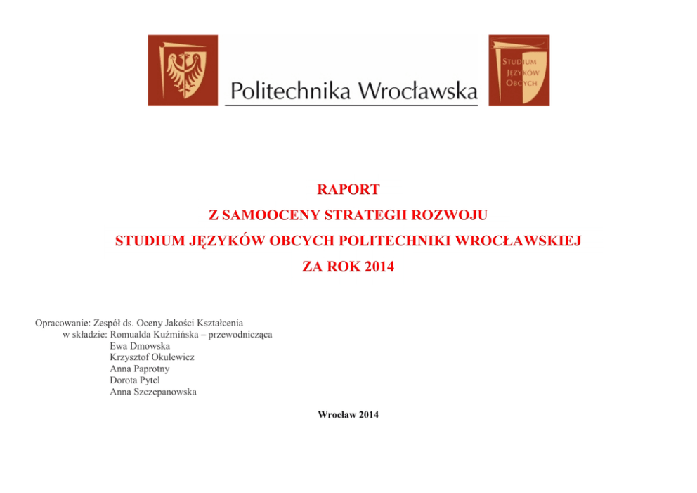 RAPORT Z SAMOOCENY STRATEGII ROZWOJU STUDIUM JĘZYKÓW OBCYCH POLITECHNIKI WROCŁAWSKIEJ ZA ROK 2014 Opracowanie: Zespół ds. Oceny Jakości Kształcenia w składzie: Romualda Kuźmińska – przewodnicząca Ewa Dmowska Krzysztof Okulewicz Anna Paprotny Dorota Pytel Anna Szczepanowska Wrocław 2014 RAPORT Z SAMOOCENY STRATEGII ROZWOJU SJO PWR ZA ROK 2014 Raport z samooceny Strategii Rozwoju SJO PWr za rok 2014 został przygotowany przez Zespół ds. Oceny Jakości Kształcenia zgodnie z założeniami zawartymi w rozdziale Strategii „Wdrożenie Strategii Rozwoju SJO”. Strategia Rozwoju SJO określa rolę, jaką Studium odgrywa w procesie umiędzynarodowienia Uczelni, opisuje misję i wizję SJO oraz filary rozwoju, zawiera modele kierunkowe i wskazuje sposoby wdrażania Strategii, określa Cele Strategiczne i sposoby ich realizacji (mierniki). Strategia opiera się na czterech podstawowych filarach (zgodnych z 4 programami Systemu doskonalenia jakości kształcenia językowego) oraz na pięciu modelach (ilustruje to poniższa tabela). FILAR I DOSKONALENIE PROCESU DYDAKTYCZNEGO 1. Model nauczania języków obcych a) Oferta dydaktyczna b) Systematyczny monitoring opinii studentów i doktorantów 2. Model jakości kształcenia językowego a) System doskonalenia jakości b) Programy nauczania kształcenia c) Kontakty z absolwentami i pracodawcami d) Warunki prowadzenia zajęć dydaktycznych c) Ocenianie efektów kształcenia językowego d) Autonomia uczenia się FILAR II PROGRAM WSPARCIA ŚRODOWISKA AKADEMICKIEGO 5. Model działań wspomagających a) Pozadydaktyczna działalność SJO b) Dokształcające płatne kursy i egzaminy certyfikatowe FILAR III ROZWÓJ KADRY DYDAKTYCZNEJ I PRACOWNIKÓW ADMINISTRACJI 3. Model kadrowy a) Pracownicy SJO 4. Model zarządzania SJO a) Zarządzanie b) Struktura organizacyjna SJO c) Polityka kadrowa b) Kierownictwo SJO d) Rozwój zawodowy pracowników c) Zarządzanie finansami e) Działalność dydaktycznonaukowa i tłumaczeniowa d) Administracja SJO FILAR IV PROMOCJA STUDIUM 5. Model działań wspomagających c) Współpraca z instytucjami edukacyjnymi d) Promocja SJO w środowisku akademickim W każdym Modelu są określone zadania główne i szczegółowe, według których została dokonana niniejsza samoocena. 1 FILAR I DOSKONALENIE PROCESU DYDAKTYCZNEGO 1. MODEL NAUCZANIA JĘZYKÓW OBCYCH a) Oferta dydaktyczna Lektoraty i kursy - oferta lektoratów obowiązkowych (język Semestr letni 2013/14 – 554 grupy: studia stacjonarne i doktoranci - 483, studia niestacjonarne - 71 grup ogólny, specjalistyczny, naukowo(załącznik nr 1); techniczny) Semestr zimowy 2014/15 – 521 grup: studia stacjonarne – 430 grup, studia niestacjonarne – 75 grup, doktoranci – 16 grup (załącznik nr 1). - kursy w ofercie dodatkowej w ramach W 2014 roku nie powstały oddzielne grupy w ramach 30 ECTS. Studenci dopisywali się do grup lektoratów 30 ECTS obowiązkowych. Od roku akad. 2014/15 zostały zlikwidowane dodatkowe punkty ECTS (na podstawie nowelizacji Ustawy). - kursy wyrównawcze (B1/B1+, 2 kursy: j. angielski B1 (2grupy), j. niemiecki B1 (2 grupy) przygotowujące do podjęcia nauki na poziomie B2.1) - kursy e-learningowe, kursy wspierane E-learning, „blended-learning” oraz platforma Moodle są wykorzystywane do wspomagania procesu platformą Moodle, kursy typu „blendeddydaktycznego podczas lektoratów obowiązkowych. learning” - kursy dla studentów z dysfunkcjami oraz 3 kursy: j. angielski B2E (semestr letni 2013/14) i B2.2 (semestr zimowy 2014/15) dla dyslektyków (2), indywidualne zajęcia dla studentów j. angielski B2.1 nauczanie indywidualne studenta niewidomego (1) niepełnosprawnych - kursy języka specjalistycznego 4 kursy zamawiane: j. niemiecki - B2+ dla W10 (1 grupa), j. angielski - B2+ dla W5 i W10 (9 grup), kurs dla (naukowo-technicznego) zamawiane doktorantów - C1 dla W10 (1 grupa) - autorskie kursy profilowane 3 kursy: j. angielski ogólnotechniczny B2 (3 grupy) - kursy językowe pomagające studentom 1 kurs: j. niemiecki (sem.zim.2014/15, zamówiony przez WPPT, poziom A1 z elementami realioznawstwa, 3 przygotować się do wymiany (wyjazdu) grupy) w ramach programów międzynarodowych - kursy języka polskiego dla 10 grup: poziom B1 (3), B2 (2), C1 (4), A2 (600 godz.) (1, ZOD w Jeleniej Górze?) cudzoziemców przygotowujące do 2 kursy języka polskiego ze studentami studiującymi w j. angielskim (60 godz.): poziom A2 (1 grupa, W10), podjęcia studiów w Polsce A1 (2 grupy, W7) - kursy języka angielskiego dla 2 kursy przygotowawcze j. angielskiego dla studentów obcokrajowców (300 godz.), poziom B2; cudzoziemców przygotowujące do podjęcia w Polsce studiów w języku angielskim kursy językowe dla studentów programu 2 kursy j. niemieckiego A1, 60 godz., dla studentów programu Erasmus, prowadzony w j. angielskim (1 grupa Erasmus sem.let. 2013/14, 2 grupy - sem.zim.2014/15) 2 kursy j. polskiego (Erasmus, 60 godz., poziom A1 (4 grupy), A2 (2 grupy) 2 - letnie kursy języka polskiego dla obcokrajowców w ramach projektów międzynarodowych - kursy kultury języka, wystąpień publicznych i in.(w ofercie przedmiotów humanistycznych) - kursy kultury języka oraz treningi interkulturowe dla nauczycieli akademickich nauczających grupy międzynarodowe i/lub dla pracowników administracji pracujących ze studentami różnych narodowości Egzaminy – certyfikaty - egzaminy certyfikatowe, odpłatne (Acert, Bulats, Mondiale) - egzaminy kwalifikacyjne umożliwiające studentom udział w programach międzynarodowych - egzaminy wstępne na studia doktoranckie 1 kurs w lipcu 2014 (2 grupy, ok.30 doktorantów z Ukrainy i Rosji, 3 tyg., 24 godz. języka polskiego, 16 godzin kultury polskiej i co drugi dzień wycieczki po mieście i muzeach wrocławskich, prowadzący mgr Marian Górecki), organizowany przez DWM i 3 wydziały: Elektroniki, Elektryczny i MechanicznoEnergetyczny (3E); w weekendy prowadzący organizował całodniowe wycieczki do cie