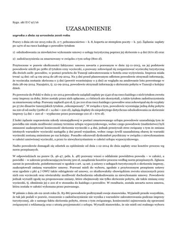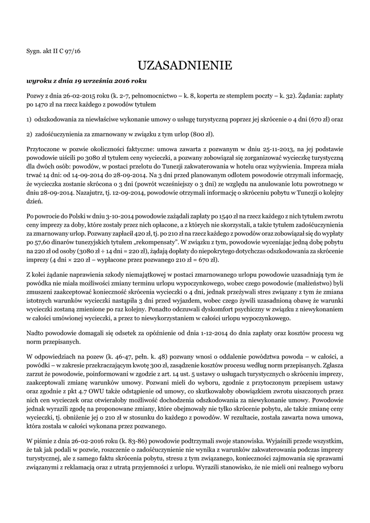 Sygn. akt II C 97/16 UZASADNIENIE wyroku z dnia 19 września 2016 roku Pozwy z dnia 26-02-2015 roku (k. 2-7, pełnomocnictwo – k. 8, koperta ze stemplem poczty – k. 32). Żądania: zapłaty po 1470 zł na rzecz każdego z powodów tytułem 1) odszkodowania za niewłaściwe wykonanie umowy o usługę turystyczną poprzez jej skrócenie o 4 dni (670 zł) oraz 2) zadośćuczynienia za zmarnowany w związku z tym urlop (800 zł). Przytoczone w pozwie okoliczności faktyczne: umowa zawarta z pozwanym w dniu 25-11-2013, na jej podstawie powodowie uiścili po 3080 zł tytułem ceny wycieczki, a pozwany zobowiązał się zorganizować wycieczkę turystyczną dla dwóch osób: powodów, w postaci przelotu do Tunezji zakwaterowania w hotelu oraz wyżywienia. Impreza miała trwać 14 dni: od 14-09-2014 do 28-09-2014. Na 3 dni przed planowanym odlotem powodowie otrzymali informację, że wycieczka zostanie skrócona o 3 dni (powrót wcześniejszy o 3 dni) ze względu na anulowanie lotu powrotnego w dniu 28-09-2014. Nazajutrz, tj. 12-09-2014, powodowie otrzymali informację o skróceniu pobytu w Tunezji o kolejny dzień. Po powrocie do Polski w dniu 3-10-2014 powodowie zażądali zapłaty po 1540 zł na rzecz każdego z nich tytułem zwrotu ceny imprezy za doby, które zostały przez nich opłacone, a z których nie skorzystali, a także tytułem zadośćuczynienia za zmarnowany urlop. Pozwany zapłacił 420 zł, tj. po 210 zł na rzecz każdego z powodów oraz zobowiązał się do wypłaty po 57,60 dinarów tunezyjskich tytułem „rekompensaty”. W związku z tym, powodowie wyceniając jedną dobę pobytu na 220 zł od osoby (3080 zł ÷ 14 dni = 220 zł), żądają dopłaty do niepokrytego dotychczas odszkodowania za skrócenie imprezy (4 dni × 220 zł – wypłacone przez pozwanego 210 zł = 670 zł). Z kolei żądanie naprawienia szkody niemajątkowej w postaci zmarnowanego urlopu powodowie uzasadniają tym że powódka nie miała możliwości zmiany terminu urlopu wypoczynkowego, wobec czego powodowie (małżeństwo) byli zmuszeni zaakceptować konieczność skrócenia wycieczki o 4 dni, jednak przeżywali stres związany z tym że zmiana istotnych warunków wycieczki nastąpiła 3 dni przed wyjazdem, wobec czego żywili uzasadnioną obawę że warunki wycieczki zostaną zmienione po raz kolejny. Ponadto odczuwali dyskomfort psychiczny w związku z niewykonaniem w całości umówionej wycieczki, a przez to niewykorzystaniem w całości urlopu wypoczynkowego. Nadto powodowie domagali się odsetek za opóźnienie od dnia 1-12-2014 do dnia zapłaty oraz kosztów procesu wg norm przepisanych. W odpowiedziach na pozew (k. 46-47, pełn. k. 48) pozwany wnosi o oddalenie powództwa powoda – w całości, a powódki – w zakresie przekraczającym kwotę 300 zł, zasądzenie kosztów procesu według norm przepisanych. Zgłasza zarzut że powodowie, poinformowani w zgodzie z art. 14 ust. 5 ustawy o usługach turystycznych o skróceniu imprezy, zaakceptowali zmianę warunków umowy. Pozwani mieli do wyboru, zgodnie z przytoczonym przepisem ustawy oraz zgodnie z pkt 4.7 OWU także odstąpienie od umowy, co skutkowałoby obowiązkiem zwrotu uiszczonych przez nich cen wycieczek oraz otwierałoby możliwość dochodzenia odszkodowania za niewykonanie umowy. Powodowie jednak wyrazili zgodę na proponowane zmiany, które obejmowały nie tylko skrócenie pobytu, ale także zmianę ceny wycieczki, tj. obniżenie jej o 210 zł w stosunku do każdego z powodów. W rezultacie, została zawarta nowa umowa, która została w całości wykonana przez pozwanego. W piśmie z dnia 26-02-2016 roku (k. 83-86) powodowie podtrzymali swoje stanowiska. Wyjaśnili przede wszystkim, że tak jak podali w pozwie, roszczenie o zadośćuczynienie nie wynika z warunków zakwaterowania podczas imprezy turystycznej, ale z samego faktu skrócenia pobytu, stresu z tym związanego, konieczności zajmowania się sprawami związanymi z reklamacją oraz z utratą przyjemności z urlopu. Wyrazili stanowisko, że nie mieli oni realnego wyboru w przedmiocie odstąpienia od umowy lub akceptacji zmienionych jej warunków, ponieważ zawiadomienie o zmianie warunków wystosowano na 3 dni przed planowanym odlotem, mimo że umowa została zawarta prawie rok wcześniej. Zakwestionowali przy tym twierdzenie pozwanego, że o konieczności zmiany istotnych warunków imprezy dowiedział się właśnie 3 dni przed odlotem, a nie wcześniej, a tym samym zakwestionowali twierdzenie, że pozwany zawiadomił konsumentów o zmianie niezwłocznie. Ponadto, w tak krótkim czasie powodowie nie uzyskaliby zwrotu całości uiszczonej ceny wycieczki, aby móc przeznaczyć odzyskane środki pieniężne na pokrycie ceny innej wycieczki u innego operatora turystyki. Ponadto, powodowie podejmowali próby znalezienia alternatywnej wycieczki w tym samym terminie i na podobnych warunkach, ale to się nie powiodło, na dowód czego złożyli wniosek o przesłuchanie świadka. Powodowie podnoszą, że zwrot na ich rzecz kwoty łącznie 420 zł nie nastąpił niezwłocznie, lecz dopiero po złożeniu przez nich reklamacji po powrocie z wycieczki. Zwrócona kwota ich zdaniem nie stanowi równowartości ceny 4 dni wycieczki, lecz jest kwotą zaoszczędzoną przez pozwanego z powodu skrócenia ich pobytu. Sąd ustalił następujący stan faktyczny. W dniu 25-11-2013 strony zawarły umowę o imprezę turystyczną (nr rez.: (...)) dla 2 osób: K. S. i A. S. (1), w dniach od 14-09-2014 do 28-09-2014 (14 dni) w Tunezji, z zakwaterowaniem w hotelu i wyżywieniem all inclusive. Cena imprezy została określona na kwoty po 3080 zł od udziału każdego z klientów, łącznie 6160 zł. (niesporne - k. 4, 46v) W nieustalonym dniu przed 26-11-2013 r. sporządzono wydruk pod nagłówkiem „zgłoszenie / umowa (...) / rez. (...)”. Jego treść potwierdza istotne warunki umowy stron, o których mowa wyżej. W dniu 1-10-2013 sporządzono wydruk „ogólne warunki uczestnictwa w imprez