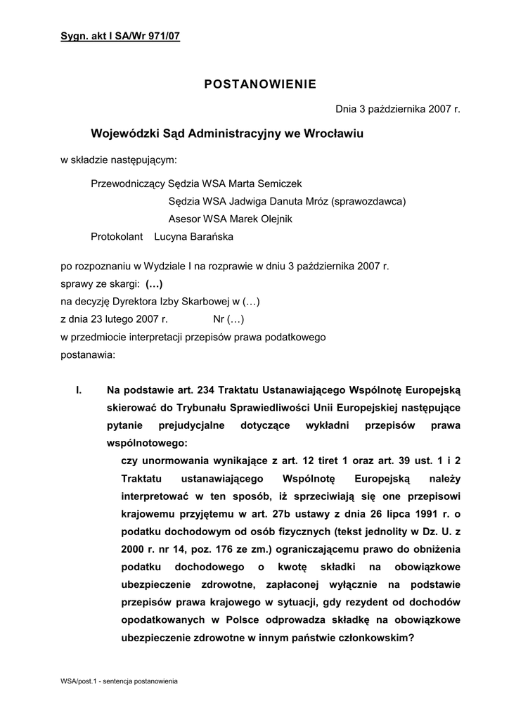 Sygn. akt I SA/Wr 971/07 POSTANOWIENIE Dnia 3 października 2007 r. Wojewódzki Sąd Administracyjny we Wrocławiu w składzie następującym: Przewodniczący Sędzia WSA Marta Semiczek Sędzia WSA Jadwiga Danuta Mróz (sprawozdawca) Asesor WSA Marek Olejnik Protokolant Lucyna Barańska po rozpoznaniu w Wydziale I na rozprawie w dniu 3 października 2007 r. sprawy ze skargi: (…) na decyzję Dyrektora Izby Skarbowej w (…) z dnia 23 lutego 2007 r. Nr (…) w przedmiocie interpretacji przepisów prawa podatkowego postanawia: I. Na podstawie art. 234 Traktatu Ustanawiającego Wspólnotę Europejską skierować do Trybunału Sprawiedliwości Unii Europejskiej następujące pytanie prejudycjalne dotyczące wykładni przepisów prawa wspólnotowego: czy unormowania wynikające z art. 12 tiret 1 oraz art. 39 ust. 1 i 2 Traktatu ustanawiającego Wspólnotę Europejską naleŜy interpretować w ten sposób, iŜ sprzeciwiają się one przepisowi krajowemu przyjętemu w art. 27b ustawy z dnia 26 lipca 1991 r. o podatku dochodowym od osób fizycznych (tekst jednolity w Dz. U. z 2000 r. nr 14, poz. 176 ze zm.) ograniczającemu prawo do obniŜenia podatku dochodowego ubezpieczenie zdrowotne, o kwotę zapłaconej składki na wyłącznie obowiązkowe na podstawie przepisów prawa krajowego w sytuacji, gdy rezydent od dochodów opodatkowanych w Polsce odprowadza składkę na obowiązkowe ubezpieczenie zdrowotne w innym państwie członkowskim? WSA/post.1 - sentencja postanowienia Sygn. akt I SA/Wr 971/07 II. Na podstawie art. 125 § 1 pkt 1) ustawy z dnia 30 sierpnia 2002 r. Prawo o postępowaniu przed sądami administracyjnymi (Dz. U. Nr 153, poz. 1270 ze zmianami) zawiesić postępowanie w sprawie do czasu uzyskania odpowiedzi na zadane pytanie. Uzasadnienie Stan faktyczny w tej sprawie jest nie sporny i przedstawia się następująco: 1. Przedmiotem skargi w sprawie jest decyzja Dyrektora Izby Skarbowej w (…) z dnia 23 lutego 2007 r. nr (…) odmawiająca, na podstawie art. 14b § 2 i § 5 pkt 1) ustawy z dnia 29 sierpnia 1997 r. Ordynacja podatkowa (t. j. w Dz. U. z 2005 r. nr 8, poz. 60 ze zm.) – dalej powoływanej jako Ordynacja podatkowa, zmiany postanowienia Naczelnika Urzędu Skarbowego w (…) z dnia 28 listopada 2006r. nr (…) w przedmiocie interpretacji co do zakresu i sposobu zastosowania prawa podatkowego, w części dotyczącej braku moŜliwości odliczenia od podatku płaconego w Rzeczypospolitej Polskiej, składek na ubezpieczenie zdrowotne zapłaconych w innym państwie członkowskim Unii Europejskiej. 2. Postępowanie podatkowe przed organem pierwszej instancji wszczęto na skutek przesłania przez Ministerstwo Finansów według właściwości wniosku Pana (…) o udzielenie interpretacji co do zakresu i sposobu zastosowania prawa podatkowego w sprawie zasad opodatkowania podatkiem dochodowym od osób fizycznych rent wypłacanych w Republice Federalnej Niemiec. Z przedstawionych przez wnioskodawcę wyjaśnień wynika, Ŝe Polska jest miejscem jego stałego pobytu, nie posiada on obywatelstwa polskiego i nie stara się o jego przyznanie. Uzyskuje jedynie niemieckie świadczenia rentowe: pierwsze – rentę zdrowotną płaconą przez Zakład Ubezpieczeń dla Pracowników Fizycznych (LVA) z tytułu 70% inwalidztwa oraz drugie – rentę zakładową wypłacaną przez spółkę Volkswagen, oba świadczenia wpłacane są na rachunek bankowy podatnika w Niemczech i tam teŜ odprowadzane są naleŜne składki, w tym składki na ubezpieczenie zdrowotne. Z uwagi na nieograniczony obowiązek podatkowy, jakiemu podatnik podlega w Rzeczypospolitej Polskiej, domaga się on uwzględnienia prawa do odliczenia od podatku dochodowego - składek na ubezpieczenie zdrowotne zapłaconych w Niemczech. 3. Postanowieniem z dnia 6 września 2006 r. nr (…) Minister Finansów stwierdził między innymi, iŜ skoro Pan (…) od 2005 r. stale zamieszkuje w Polsce, to dla celów 2 Sygn. akt I SA/Wr 971/07 podatkowych - podlega on w Rzeczypospolitej Polskiej nieograniczonemu obowiązkowi podatkowemu (art. 3 ust. 1 ustawy z dnia 26 lipca 1991 r. o podatku dochodowym od osób fizycznych (tj. w Dz. U. z 2000 r. nr 14, poz. 176 ze zm.) - dalej powoływanej jako ustawa o podatku dochodowym od osób fizycznych). Jednocześnie z uwagi na art. 18 ust. 2 umowy z dnia 14 maja 2003 r. między Rzeczypospolitą Polską a Republiką Federalną Niemiec w sprawie unikania podwójnego opodatkowania w zakresie podatków od dochodu i od majątku (Dz. U. z 2005 r. nr 12 poz. 90) – dalej powoływana jako umowa w sprawie unikania podwójnego opodatkowania w zakresie podatków od dochodu i od majątku), renta zdrowotna (wypłacana na terytorium Republiki Federalnej Niemiec przez LVA) opodatkowana jest w Republice Federalnej Niemiec, zaś zgodnie z art. 18 ust. 1 umowy w sprawie unikania podwójnego opodatkowania w zakresie podatków od dochodu i od majątku - renta zakładowa (wypłacana na terytorium Republiki Federalnej Niemiec przez spółkę Volkswagen) podlega opodatkowaniu wyłącznie w Rzeczypospolitej Polskiej. 4. Naczelnik Urzędu Skarbowego w (…) w postanowieniu z dnia 28 listopada 2006 r. nr (…) wskazał, Ŝe sposób opłacania podatku w Rzeczypospolitej Polskiej z tytułu uzyskiwanej z zagranicy renty uzaleŜniony jest od tego, czy podatnik uzyskuje kwotę świadczenia za pośrednictwem banku, czy teŜ bez jego pośrednictwa. Jeśli świadczenie wypłacane jest za pośrednictwem polskiego banku, wówczas bank jako płatnik zobowiązany jest do poboru za podatnika zaliczek na podatek dochodowy od osób fizycznych. Jeśli natomiast renta zagraniczna nie jest wypłacana za pośrednictwem polskiego banku, wówczas podatnik zobowiązany jest na podstawie art. 44 ust. 1a pkt 2) ustawy z dnia 26 lipca 1991 r. o podatku dochodowym od osób fizycznych (tj. w Dz. U. z 2000 r. nr 14, poz. 176 ze zm.) - dalej powoływanej jako ustawa o podatku dochodowym od osób fizycznych, do samodzielnego opłacania zaliczek na podatek do