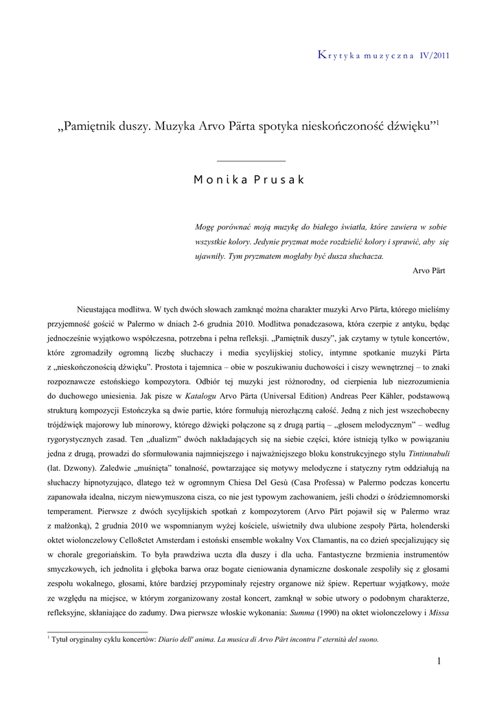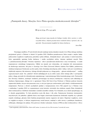 Kr y t y k a m u z y c z n a IV/2011 „Pamiętnik duszy. Muzyka Arvo Pärta spotyka nieskończoność dźwięku”1 Monika Prusak Mogę porównać moją muzykę do białego światła, które zawiera w sobie wszystkie kolory. Jedynie pryzmat może rozdzielić kolory i sprawić, aby się ujawniły. Tym pryzmatem mogłaby być dusza słuchacza. Arvo Pärt Nieustająca modlitwa. W tych dwóch słowach zamknąć można charakter muzyki Arvo Pärta, którego mieliśmy przyjemność gościć w Palermo w dniach 2-6 grudnia 2010. Modlitwa ponadczasowa, która czerpie z antyku, będąc jednocześnie wyjątkowo współczesna, potrzebna i pełna refleksji. „Pamiętnik duszy”, jak czytamy w tytule koncertów, które zgromadziły ogromną liczbę słuchaczy i media sycylijskiej stolicy, intymne spotkanie muzyki Pärta z „nieskończonością dźwięku”. Prostota i tajemnica – obie w poszukiwaniu duchowości i ciszy wewnętrznej – to znaki rozpoznawcze estońskiego kompozytora. Odbiór tej muzyki jest różnorodny, od cierpienia lub niezrozumienia do duchowego uniesienia. Jak pisze w Katalogu Arvo Pärta (Universal Edition) Andreas Peer Kähler, podstawową strukturą kompozycji Estończyka są dwie partie, które formułują nierozłączną całość. Jedną z nich jest wszechobecny trójdźwięk majorowy lub minorowy, którego dźwięki połączone są z drugą partią – „głosem melodycznym” – według rygorystycznych zasad. Ten „dualizm” dwóch nakładających się na siebie części, które istnieją tylko w powiązaniu jedna z drugą, prowadzi do sformułowania najmniejszego i najważniejszego bloku konstrukcyjnego stylu Tintinnabuli (lat. Dzwony). Zaledwie „muśnięta” tonalność, powtarzające się motywy melodyczne i statyczny rytm oddziałują na słuchaczy hipnotyzująco, dlatego też w ogromnym Chiesa Del Gesù (Casa Professa) w Palermo podczas koncertu zapanowała idealna, niczym niewymuszona cisza, co nie jest typowym zachowaniem, jeśli chodzi o śródziemnomorski temperament. Pierwsze z dwóch sycylijskich spotkań z kompozytorem (Arvo Pärt pojawił się w Palermo wraz z małżonką), 2 grudnia 2010 we wspomnianym wyżej kościele, uświetniły dwa ulubione zespoły Pärta, holenderski oktet wiolonczelowy Cello8ctet Amsterdam i estoński ensemble wokalny Vox Clamantis, na co dzień specjalizujący się w chorale gregoriańskim. To była prawdziwa uczta dla duszy i dla ucha. Fantastyczne brzmienia instrumentów smyczkowych, ich jednolita i głęboka barwa oraz bogate cieniowania dynamiczne doskonale zespoliły się z głosami zespołu wokalnego, głosami, które bardziej przypominały rejestry organowe niż śpiew. Repertuar wyjątkowy, może ze względu na miejsce, w którym zorganizowany został koncert, zamknął w sobie utwory o podobnym charakterze, refleksyjne, skłaniające do zadumy. Dwa pierwsze włoskie wykonania: Summa (1990) na oktet wiolonczelowy i Missa 1 Tytuł oryginalny cyklu koncertów: Diario dell' anima. La musica di Arvo Pärt incontra l' eternità del suono. 1 Kr y t y k a m u z y c z n a IV/2011 brevis (2009) na dwanaście wiolonczel (części Kyrie, Sanctus, Agnus Dei), pełne były archaicznych brzmień skoncentrowanych w średnim i wysokim rejestrze instrumentów, dźwięków, które rodzą się znikąd i zanikają niepostrzeżenie, dając wrażenie zawieszenia, nieskończoności. Trzeci utwór instrumentalny O-Antiphonen (2008), pełen łagodnych dysonansów, ciekawych kontrastów dynamicznych utrzymanych w granicach pp-mf, niósł ze sobą jakieś tajemnicze cierpienie, podkreślone głębokimi odcieniami niskiego rejestru wiolonczel. Również ensemble wokalny wykonał trzy dzieła a cappella, Summa (1977) na sopran, kontratenor, tenor i bas oraz dwa utwory w języku angielskim, And one of the Pharisees (1992) i Most Holy Mother of God (2003) oparte na zapętleniu tego samego motywu melodycznego na rodzaj mantry lub litanii. Oba zespoły razem zaprezentowały dość dynamiczne AlleluiaTropus (2008), w którym fragmenty a cappella przeplatają się z częściami tutti. Gęste, zbite brzmienie instrumentów dodawało tu potęgi ciepłym barwom głosów, zlewając się w jednolitą, doskonale scaloną całość, co jeszcze bardziej odczuło się w ostatnim utworze programu Da pacem Domine (2006). Głosy ludzkie zabrzmiały tu jak rejestry organów, długie „kładzione” dźwięki, zarówno w partii wokalnej, jak i w instrumentalnej, przenikanie jednej w drugą sprawiło, że tekst stracił na ważności, a słuchacz zatopił się w tę perfekcyjną „magmę” dźwięków. Drugie spotkanie z Arvo Pärtem, które odbyło się 6 grudnia 2010 w Sali „Scarlatti” Konserwatorium Muzycznego „V. Bellini” w Palermo, zgromadziło podobnie liczną publiczność. Wśród wykonawców studenci i wykładowcy dwóch sycylijskich konserwatoriów, wyżej wymienionego oraz Konserwatorium Muzycznego „A. Scontrino” w Trapani. Koncert był o wiele bardziej zróżnicowany dzięki różnorodności składów instrumentalnych zaangażowanych w interpretację dzieł Pärta, chciałoby sie rzec, bardziej „świecki” ze względu na zaprezentowany program. Na otwarcie niewielkie dzieło Pari intervallo (1976) w transkrypcji na kwartet fletów prostych w wykonaniu zespołu Daphne. Pozbawiony wibrata dźwięk fletu dodał utworowi szczególnej prostoty i sensu cierpienia, długie nuty, czasami delikatny tryl w niskim rejestrze, całość oparta na interwałach kwarty i tercji. Für Alina (1976) na fortepian, wykonany tu przez Oscara Pizzo, to jeden z najbardziej znanych utworów Pärta, przeplatanie się rejestrów wysokiego i niskiego z zupełnym pominięciem średnicy, w poszukiwaniu dźwięków „neutralnych”, jak określa je sam kompozytor: koncentracja na każdym, pojedynczym brzmieniu, poszukiwanie wewnętrznej ciszy. Dźwięki akordów tonalnych, które brzmią jak dzwony, a mimo wszystko brak im konkretnej tonacji poprzez liczne dysona