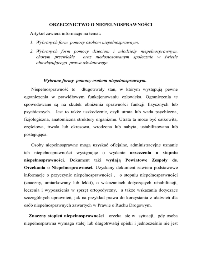 ORZECZNICTWO O NIEPEŁNOSPRAWNOŚCI Artykuł zawiera informacje na temat: 1. Wybranych form pomocy osobom niepełnosprawnym. 2. Wybranych form pomocy dzieciom i młodzieży niepełnosprawnym, chorym przewlekle oraz niedostosowanym społecznie w świetle obowiązującego prawa oświatowego. Wybrane formy pomocy osobom niepełnosprawnym. Niepełnosprawność to długotrwały stan, w którym występują pewne ograniczenia w prawidłowym funkcjonowaniu człowieka. Ograniczenia te spowodowane są na skutek obniżenia sprawności funkcji fizycznych lub psychicznych. Jest to także uszkodzenie, czyli utrata lub wada psychiczna, fizjologiczna, anatomiczna struktury organizmu. Utrata ta może być całkowita, częściowa, trwała lub okresowa, wrodzona lub nabyta, ustabilizowana lub postępująca. Osoby niepełnosprawne mogą uzyskać oficjalne, administracyjne uznanie ich niepełnosprawności występując o wydanie orzeczenia o stopniu niepełnosprawności. Dokument taki wydają Powiatowe Zespoły ds. Orzekania o Niepełnosprawności. Uzyskany dokument zawiera podstawowe informacje o przyczynie niepełnosprawności , o stopniu niepełnosprawności (znaczny, umiarkowany lub lekki), o wskazaniach dotyczących rehabilitacji, leczenia i wyposażenia w sprzęt ortopedyczny, a także wskazania dotyczące szczególnych uprawnień, jak na przykład prawa do korzystania z ułatwień dla osób niepełnosprawnych zawartych w Prawie o Ruchu Drogowym. Znaczny stopień niepełnosprawności orzeka się w sytuacji, gdy osoba niepełnosprawna wymaga stałej lub długotrwałej opieki i jednocześnie nie jest zdolna do pracy, albo też może pracować wyłącznie w warunkach pracy chronionej. Umiarkowany stopień niepełnosprawności wymusza czasową lub częściową opiekę innych osób. Jednocześnie naruszona sprawność organizmu uniemożliwia podjęcie pracy lub warunkuje pracę jedynie w warunkach pracy chronionej. Lekki stopień niepełnosprawności w sposób istotny obniża zdolności do wykonywania pracy, w porównaniu do zdolności jaką wykazuje osoba o podobnych kwalifikacjach zawodowych z pełną sprawnością fizyczną i psychiczną. Postępowanie w sprawi uzyskania orzeczenia o niepełnosprawności. Osoba zainteresowana lub jej przedstawiciel ustawowy albo, za ich zgodą ośrodek pomocy społecznej, składa wniosek o wydanie orzeczenia do powiatowego (miejskiego) zespołu do spraw orzekania o niepełnosprawności. W orzeczeniu powiatowego zespołu, poza ustaleniem niepełnosprawności lub stopnia niepełnosprawności, powinny być zawarte wskazania dotyczące w szczególności: a) odpowiedniego zatrudnienia uwzględniającego psychofizyczne możliwości danej osoby, b) szkolenia, w tym specjalistycznego, c) zatrudnienia w zakładzie aktywności zawodowej, d) uczestnictwa w terapii zajęciowej, e) konieczności zaopatrzenia w przedmioty ortopedyczne, środki pomocnicze oraz pomoce techniczne, ułatwiające funkcjonowanie danej osoby, f) korzystania z systemu środowiskowego wsparcia w samodzielnej egzystencji, przez co rozumie się korzystanie z usług socjalnych, opiekuńczych, terapeutycznych i rehabilitacyjnych świadczonych przez sieć instytucji pomocy społecznej, organizacje pozarządowe oraz inne placówki, g) konieczności stałej lub długotrwałej opieki lub pomocy innej osoby w związku ze znacznie ograniczoną możliwością samodzielnej egzystencji, h) konieczności stałego współudziału na co dzień opiekuna dziecka w procesie jego leczenia, rehabilitacji i edukacji, i) spełniania przez osobę niepełnosprawną przesłanek określonych w art. 8 ust. 1 ustawy z dnia 20 czerwca 1997 r. - Prawo o ruchu drogowym (Dz. U. Nr 98, poz. 602 ze zm.), j) wymogu zamieszkania w oddzielnym pokoju (dotyczy osób poruszających się na wózkach oraz osób, których niepełnosprawność wymaga zamieszkania w oddzielnym pokoju) zgodnie z art. 5 ust. 3 Ustawy o dodatkach mieszkaniowych. Służy to określaniu normatywnej (dopuszczalnej) powierzchni lokalu mieszkalnego niezbędnej dla celów ustalania prawa do dodatku mieszkaniowego. W drugiej instancji orzeka Wojewódzki Zespół do spraw orzekania o niepełnosprawności. Pełnomocnik Rządu do Spraw Osób Niepełnosprawnych, może zwrócić się o: a) stwierdzenie nieważności orzeczenia, b) wznowienie postępowania - jeżeli w ramach nadzoru stwierdzi, że istnieje uzasadniona wątpliwość, co do zgodności orzeczenia ze stanem faktycznym lub, że orzeczenie zostało wydane w sposób sprzeczny z przepisami prawa. Takie same uprawnienia posiada wojewoda, ale wyłącznie w stosunku do orzeczeń powiatowych zespołów. Od orzeczenia wojewódzkiego zespołu przysługuje odwołanie do Sądu Pracy i Ubezpieczeń Społecznych w terminie 30 dni od dnia doręczenia orzeczenia. Odwołanie wnosi się za pośrednictwem Wojewódzkiego Zespołu, który wydał orzeczenie. Jeżeli Wojewódzki Zespół uzna, że odwołanie zasługuje w całości na uwzględnienie, wydaje orzeczenie, w którym uchyla lub zmienia zaskarżone orzeczenie. Postępowanie w sprawach odwołań jest wolne od kosztów opłat sądowych. W razie zainteresowana wydania orzeczenia o niepełnosprawności, osoba może wystąpić o wydanie legitymacji niepełnosprawnego, która będzie pomocna w dokumentowaniu przysługujących uprawnień. Orzeczenie takie jest niezbędne w celu korzystania z uprawnień i ulg przewidzianych przepisami prawa, np. uprawnień do skróconego czasu pracy, dodatkowego urlopu, podatkowych odliczeń rehabilitacyjnych, skorzystania z programów PFRON, czy z pomocy społecznej. Wybrane formy pomocy dzieciom i młodzieży niepełnosprawnej oraz niedostosowanej społecznie w świetle najnowszego prawa oświatowego. W dniu 17 listopada 2010 r. zostały uprawomocnione ROZPORZĄDZENIA MINISTRA EDUKACJI NARODOWEJ w sprawie: - warunków organizowania kształcenia, wychowania i opieki dla dzieci i młodzieży niepełnosprawnych oraz niedostosowanych społecznie w przedszkolach, sz