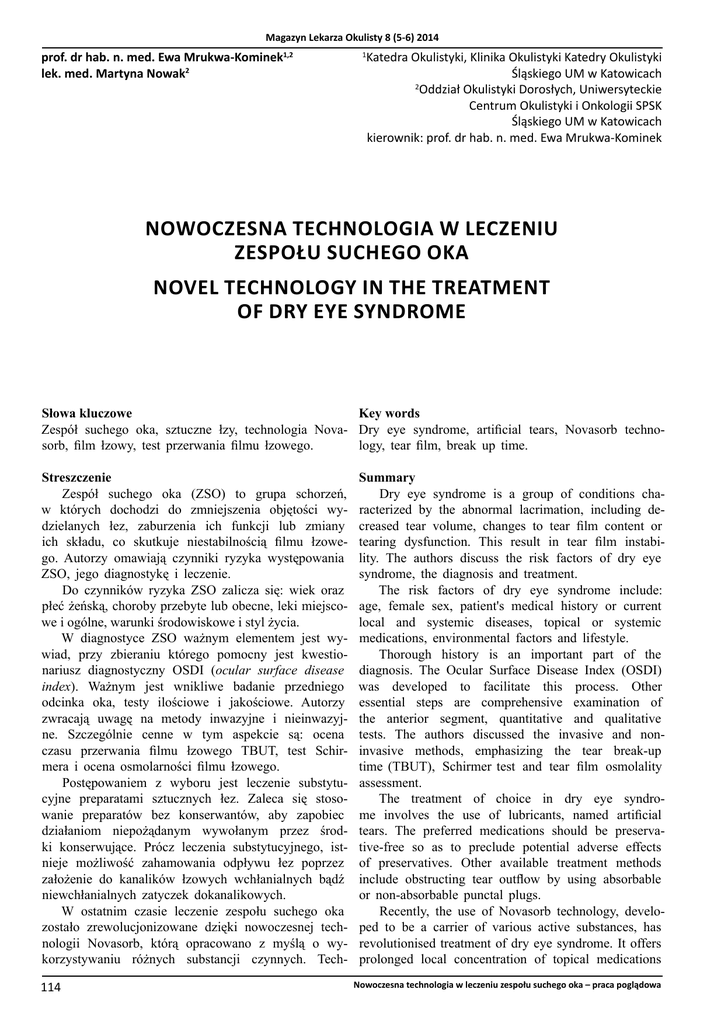 Magazyn Lekarza Okulisty 8 (5-6) 2014 prof. dr hab. n. med. Ewa Mrukwa-Kominek1,2 lek. med. Martyna Nowak2 Katedra Okulistyki, Klinika Okulistyki Katedry Okulistyki Śląskiego UM w Katowicach 2 Oddział Okulistyki Dorosłych, Uniwersyteckie Centrum Okulistyki i Onkologii SPSK Śląskiego UM w Katowicach kierownik: prof. dr hab. n. med. Ewa Mrukwa-Kominek 1 Nowoczesna technologia w leczeniu zespołu suchego oka Novel technology in the treatment of dry eye syndrome Słowa kluczowe Key words Zespół suchego oka, sztuczne łzy, technologia Nova- Dry eye syndrome, artificial tears, Novasorb technosorb, film łzowy, test przerwania filmu łzowego. logy, tear film, break up time. Streszczenie Zespół suchego oka (ZSO) to grupa schorzeń, w których dochodzi do zmniejszenia objętości wydzielanych łez, zaburzenia ich funkcji lub zmiany ich składu, co skutkuje niestabilnością filmu łzowego. Autorzy omawiają czynniki ryzyka występowania ZSO, jego diagnostykę i leczenie. Do czynników ryzyka ZSO zalicza się: wiek oraz płeć żeńską, choroby przebyte lub obecne, leki miejscowe i ogólne, warunki środowiskowe i styl życia. W diagnostyce ZSO ważnym elementem jest wywiad, przy zbieraniu którego pomocny jest kwestionariusz diagnostyczny OSDI (ocular surface disease index). Ważnym jest wnikliwe badanie przedniego odcinka oka, testy ilościowe i jakościowe. Autorzy zwracają uwagę na metody inwazyjne i nieinwazyjne. Szczególnie cenne w tym aspekcie są: ocena czasu przerwania filmu łzowego TBUT, test Schirmera i ocena osmolarności filmu łzowego. Postępowaniem z wyboru jest leczenie substytucyjne preparatami sztucznych łez. Zaleca się stosowanie preparatów bez konserwantów, aby zapobiec działaniom niepożądanym wywołanym przez środki konserwujące. Prócz leczenia substytucyjnego, istnieje możliwość zahamowania odpływu łez poprzez założenie do kanalików łzowych wchłanialnych bądź niewchłanialnych zatyczek dokanalikowych. W ostatnim czasie leczenie zespołu suchego oka zostało zrewolucjonizowane dzięki nowoczesnej technologii Novasorb, którą opracowano z myślą o wykorzystywaniu różnych substancji czynnych. Tech114 Summary Dry eye syndrome is a group of conditions characterized by the abnormal lacrimation, including decreased tear volume, changes to tear film content or tearing dysfunction. This result in tear film instability. The authors discuss the risk factors of dry eye syndrome, the diagnosis and treatment. The risk factors of dry eye syndrome include: age, female sex, patient's medical history or current local and systemic diseases, topical or systemic medications, environmental factors and lifestyle. Thorough history is an important part of the diagnosis. The Ocular Surface Disease Index (OSDI) was developed to facilitate this process. Other essential steps are comprehensive examination of the anterior segment, quantitative and qualitative tests. The authors discussed the invasive and noninvasive methods, emphasizing the tear break-up time (TBUT), Schirmer test and tear film osmolality assessment. The treatment of choice in dry eye syndrome involves the use of lubricants, named artificial tears. The preferred medications should be preservative-free so as to preclude potential adverse effects of preservatives. Other available treatment methods include obstructing tear outflow by using absorbable or non-absorbable punctal plugs. Recently, the use of Novasorb technology, developed to be a carrier of various active substances, has revolutionised treatment of dry eye syndrome. It offers prolonged local concentration of topical medications Nowoczesna technologia w leczeniu zespołu suchego oka – praca poglądowa Magazyn Lekarza Okulisty 8 (5-6) 2014 nologia ta pozwoliła na stworzenie kropli do oczu, które dłużej utrzymują miejscowe stężenie terapeutyczne. Jest nowatorską metodą, która udoskonaliła tolerancję leku, jego skuteczność, wydłużenie czasu działania oraz wzrost wchłaniania substancji czynnej przy braku działania toksycznego. in ocular tissues. It is a novel technology which improved drug tolerance, efficacy, duration of action and the active substance absorption without additional toxicity. Nowoczesna technologia w leczeniu zespołu suchego oka – praca poglądowa 115