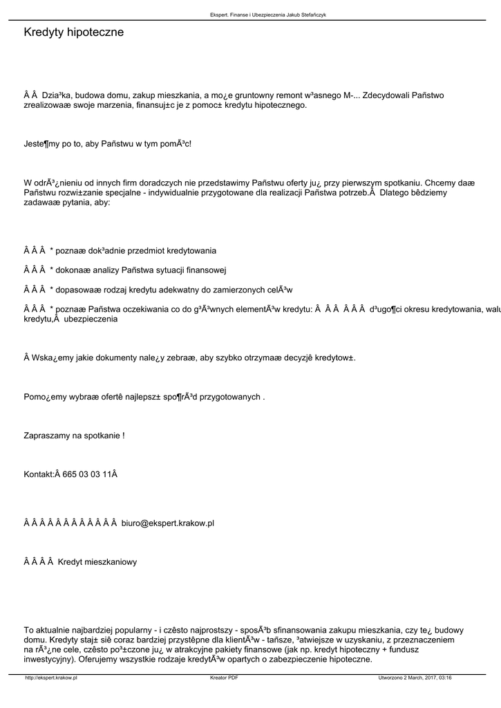Ekspert. Finanse i Ubezpieczenia Jakub Stefañczyk Kredyty hipoteczne   Dzia³ka, budowa domu, zakup mieszkania, a mo¿e gruntowny remont w³asnego M-... Zdecydowali Pañstwo zrealizowaæ swoje marzenia, finansuj±c je z pomoc± kredytu hipotecznego. Jeste¶my po to, aby Pañstwu w tym pomóc! W odró¿nieniu od innych firm doradczych nie przedstawimy Pañstwu oferty ju¿ przy pierwszym spotkaniu. Chcemy daæ Pañstwu rozwi±zanie specjalne - indywidualnie przygotowane dla realizacji Pañstwa potrzeb. Dlatego bêdziemy zadawaæ pytania, aby:    * poznaæ dok³adnie przedmiot kredytowania    * dokonaæ analizy Pañstwa sytuacji finansowej    * dopasowaæ rodzaj kredytu adekwatny do zamierzonych celów    * poznaæ Pañstwa oczekiwania co do g³Ã³wnych elementów kredytu:       d³ugo¶ci okresu kredytowania, walu kredytu, ubezpieczenia  Wska¿emy jakie dokumenty nale¿y zebraæ, aby szybko otrzymaæ decyzjê kredytow±. Pomo¿emy wybraæ ofertê najlepsz± spo¶ród przygotowanych . Zapraszamy na spotkanie ! Kontakt: 665 03 03 11             [email protected]     Kredyt mieszkaniowy To aktualnie najbardziej popularny - i czêsto najprostszy - sposób sfinansowania zakupu mieszkania, czy te¿ budowy domu. Kredyty staj± siê coraz bardziej przystêpne dla klientów - tañsze, ³atwiejsze w uzyskaniu, z przeznaczeniem na ró¿ne cele, czêsto po³±czone ju¿ w atrakcyjne pakiety finansowe (jak np. kredyt hipoteczny + fundusz inwestycyjny). Oferujemy wszystkie rodzaje kredytów opartych o zabezpieczenie hipoteczne. http://ekspert.krakow.pl Kreator PDF Utworzono 2 March, 2017, 03:16 Ekspert. Finanse i Ubezpieczenia Jakub Stefañczyk Kredyt hipoteczny mo¿na przeznaczyæ na zakup nieruchomo¶ci: - nabycie mieszkania lub domu od dewelopera, spó³dzielni mieszkaniowej lub osoby prywatnej - przekszta³cenie lokatorskiego spó³dzielczego prawa do lukalu we w³asno¶ciowe spó³dzielcze prawo - wykup mieszkania komunalnego i zak³adowego - nabycie udzia³u w nieruchomo¶ci - zakup nieruchomo¶ci rolnej z posiadan± zabudow± siedliskow± - zakup dzia³ki budowlanej (równie¿ z niedokoñczon± budow±) Kredyt hipoteczny mo¿na równie¿ przeznaczyæ na budowê domu lub mieszkania: - budowa domu prowadzona systemem gospodarczym - budowa domu realizowana przez dewelopera, spó³dzielniê mieszkaniow±, generalnego wykonawcê - budowa lokalu mieszkalnego w budynku wielorodzinnym, realizowanym przez dewelopera b±d¼ spó³dzielniê mieszkaniow± - budowa domu ca³orocznego, po³o¿onego na dzia³ce rekreacyjnej - remont, modernizacjê, rozbudowê domu lub mieszkania - adaptacjê nieruchomo¶ci na cele mieszkaniowe    Kredyt refinansowy to najlepszy sposób na zmniejszenie raty kredytu hipotecznego! Warto przyjrzeæ siê bli¿ej kredytom hipotecznym zaci±gniêtym przed rokiem lub jeszcze wcze¶niej i zamieniæ je na nowe, tañsze w innym banku. Zbyt wysokie raty kredytu i odsetek mo¿na szybko i sprawnie dostosowaæ do aktualnych mo¿liwo¶ci finansowych klienta kredyt refinansowy mo¿e byæ udzielony na inny okres ni¿ poprzednio, w innej walucie i oczywi¶cie na ni¿szy procent. Dodatkow± zalet± jest to, ¿e wiele banków oferuje minimum formalno¶ci przy refinansowaniu zobowi±zañ. http://ekspert.krakow.pl Kreator PDF Utworzono 2 March, 2017, 03:16 Ekspert. Finanse i Ubezpieczenia Jakub Stefañczyk     Kredyt konsolidacyjny To doskona³e rozwi±zanie dla klientów posiadaj±cych kilka zobowi±zañ kredytowych jednocze¶nie, np. kredyt mieszkaniowy, samochodowy, karty kredytowe i po¿yczkê gotówkow±. W zwi±zku z tym sp³acaj± kilka rat miesiêcznie - co stanowi du¿e obci±¿enie finansowe, jak równie¿ problem techniczny w obs³udze - kilka ró¿nych terminów, kwot i rachunków bankowych, na które nale¿y przelewaæ raty. Do kredytu konsolidacyjnego mo¿na w³±czyæ ró¿nego rodzaju zobowi±zania tj.: -  kredyt mieszkaniowy, -  kredyt samochodowy, -  po¿yczkê gotówkow± lub hipoteczn±, -  kartê kredytow±, -  liniê debetow± w ROR, za¶ dodatkow± kwotê kredytu mo¿na przeznaczyæ na dowolny cel.     Po¿yczka hipoteczna To optymalne rozwi±zanie dla klientów, którzy potrzebuj± du¿ej gotówki i nie chc± ponosiæ wysokich kosztów kredytu gotówkowego. Po¿yczka hipoteczna umo¿liwia uzyskanie taniej gotówki przeznaczonej na dowolny cel – inwestycjê w mieszkanie, ale tak¿e np. zakup samochodu. Jej oprocentowanie jest porównywalne z kosztem kredytu mieszkaniowego - poniewa¿ zabezpieczeniem jest równie¿ nieruchomo¶æ - jest ni¿sze o kilka punktów ni¿ przy kredycie odnawialnym czy gotówkowym. Dziêki d³u¿szemu okresowi sp³aty mo¿emy tak¿e po¿yczyæ znacznie wiêcej i mieæ ni¿sz± ratê. Po¿yczki hipoteczne czê¶ciej s± tak¿e udzielane w walutach obcych. http://ekspert.krakow.pl Kreator PDF Utworzono 2 March, 2017, 03:16
