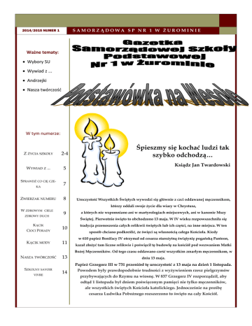 SAMORZĄDOWA SP NR 1 W ŻUROMINIE 2014/2015 NUMER 1 Ważne tematy: • Wybory SU • Wywiad z ... • Andrzejki • Nasza twórczość W tym numerze: Z ŻYCIA SZKOŁY 2-4 WYWIAD Z ... 5 SPRAWDŹ CO CIĘ CZEKA ZWIERZAK NUMERU Śpieszmy się kochać ludzi tak szybko odchodzą… Ksiądz Jan Twardowski 7 8 Uroczystość Wszystkich Świętych wywodzi się głównie z czci oddawanej męczennikom, którzy oddali swoje życie dla wiary w Chrystusa, W ZDROWYM CIELE ZDROWY DUCH KĄCIK CIOCI PORADY 9 a których nie wspomniano ani w martyrologiach miejscowych, ani w kanonie Mszy Świętej. Pierwotnie święto to obchodzono 13 maja. W IV wieku rozpowszechniła się 10 tradycja przenoszenia całych relikwii świętych lub ich części, na inne miejsca. W ten sposób chciano podkreślić, że święci są własnością całego Kościoła. Kiedy w 610 papież Bonifacy IV otrzymał od cesarza starożytną świątynię pogańską Panteon, KĄCIK MODY 11 kazał złożyć tam liczne relikwie i poświęcił tę budowlę na kościół pod wezwaniem Matki Bożej Męczenników. Od tego czasu oddawano cześć wszystkim zmarłym męczennikom, w NASZA TWÓRCZOŚĆ 13 dniu 13 maja. Papież Grzegorz III w 731 przeniósł tę uroczystość z 13 maja na dzień 1 listopada. SZKOLNY SAVOIR VIVRE 14 Powodem były prawdopodobnie trudności z wyżywieniem rzesz pielgrzymów przybywających do Rzymu na wiosnę. W 837 Grzegorz IV rozporządził, aby odtąd 1 listopada był dniem poświęconym pamięci nie tylko męczenników, ale wszystkich świętych Kościoła katolickiego. Jednocześnie na prośbę cesarza Ludwika Pobożnego rozszerzono to święto na cały Kościół. Podstawówka na wesoło Z ŻYCIA SZKOŁY ZESPÓŁ REDAKCYJNY GAZETKI NAJLEPSI Z NAJLEPSZYCH !!! Komisja Stypendialna działająca przy Urzędzie Gminy i Miasta w Żurominie przyznała jednorazowe stypendia za osiągnięcia naukowe, artystyczne i sportowe w roku szkolnym 2013/2014. Stypendia te otrzymało 13 uczniów naszej szkoły: Hubert Błaszkiewicz, Kamil Kawczyński, Anna Kąpińska z klasy 6b, Jacek Michalski-6c Natalia Żujewska-5a oraz absolwenci naszej szkoły : Maja Jabłońska, Zuzanna Jabłońska, Dominika Świątek, Julia Laskowska, Monika Tylicka, Michał Pawłowski, Kinga Kalisz, Maria Filipska. Gratulujemy!!! Antoszewska Monika Czaplińska Monika Karczewski Artur Kawczyński Kamil Kąpińska Ania Kraszewska Angelika DZIEŃ CHŁOPAKA Lipski Mateusz Radzimska Zuzia 30 września to święto naszych cudownych chłopaków .Dziewczyny o nim nie zapomniały. Wszystkie podarowały swoim kolegom z klasy Smulski Tobiasz jakieś drobne upominki,np: długopisy, słodycze, kubki, Sobiech Julia piłeczki lub dezodoranty. W niektórych klasach zorganizowano nawet przyjęcia, podczas których ucztowano przy pizzie lub torcie. Chłopaki mieli okazję poczuć się w tym dniu naprawdę wyjątkowo. Gratulujemy dziewczynom świetnych i trafionych pomysłów. Liczymy jednocześnie na to, że chłopaki równie wspaniale uczczą w naszej szkole Dzień Kobiet. Szablewska Dominika Wiśniewski Miłosz Wojtkiewicz Ola Zawiercichowska Agata WRZESIEŃ-MIESIĄC KONKURSÓW WOJEWÓDZKICH Opieka Jak co roku we wrześniu w naszej szkole odbyły się pierwsze etapy trzech konkur- Pawlak Hanna sów : z języka polskiego, matematyki i przyrody. Wzięło w nich udział 25 uczniów. Z języka polskiego trzeba było wykazać się znajomością dość obszernej literatury Kaczmarczyk Katarzyna dziecięcej oraz innymi umiejętnościami polonistycznymi. Przeczytanie wszystkich Dobies Marcin książek z wykazu lektur obowiązujących na konkursie zajęło sporo czasu i wymagało sporego poświęcenia. Szkoda, że nikomu nie udało się zakwalifikować do kolejnego etapu. Wyrazy uznania należą się w tym momencie Natalii Żujewskiej z klasy 5a, która jako jedyna przeczytała wszystkie obowiązujące lektury, ale niestety zabrakło jej punktów, aby przejść do następnego etapu. Z matematyki najtrudniejsze okazało się zadanie, w którym trzeba było dokonać przeliczeń za pomocą ułamków dziesiętnych. Pozostałe zadania też nie były łatwe. Z obu powyższych konkursów nikt nie zakwalifikował się do II etapu. Zadań przyrodniczych było o wiele za dużo na 60 minut, ale trzem osobom, Natalii Żujewskiej z V a, Hubertowi Błaszkiewiczowi z VI b i Julianowi Zakrzewskiemu z VI c udało się z nimi uporać i przeszli do następnego etapu: rejonowego. Życzymy im powodzenia !!! Kontakt Przez członków zespołu redakcyjnego Podstawówka na wesoło Z ŻYCIA SZKOŁY WYBORY DO SAMORZĄDU SZKOLNEGO W piątek 12 września odbyły się w naszej szkole wybory do Samorządu Szkolnego. Zaangażowali się w nie uczniowie klas czwartych, piątych i szóstych.Nad prawidłowym przebiegiem wyborów czuwali opiekunowie Samorządu Szkolnego: Pan Marcin Dobies oraz Pani Dorota Czarnomska. Najwięcej głosów zdobyła uczennica klasy 6b: Aleksandra Wojtkiewicz, która została Przewodniczącą Samorządu. Na drugim miejscu, biorąc pod uwagę liczbę głosów, uplasowały się dwie uczennice: Julia Sobiech z klasy 6b i Natalia Kacprzykowskaz klasy 6c. Ponieważ dziewczyny uzyskały taką samą liczbę głosów, opiekunowie Samorządu zdecydowali, że Julia i Natalia równorzędnie będą pełniły funkcję Zastępcy Przewodniczącej.Trzecie miejsce zajął Jacek Michalski z klasy 6c i tym samym zdobył posadę Sekretarza. Z naszych obserwacji wynika, że przedstawiciele naszego Samorządu świetnie się ze sobą dogadują. Życzymy im dalszej takiej dobrej współpracy. WYCIECZKA KLAS IV A I IV B” Piątek – 26.09.2014r. 7.00-niebo zachmurzone , nauczyciele oraz uczniowie zastanawiają się, czy wycieczka dojdzie do skutku . 8:45 - Wychodzimy, droga mija nam szybko , mamy do przejścia 3 km. 9:45 - Jesteśmy w gospodarstwie „Wersal” Przy wejściu wita nas pan Wojtek i jego koń, na którym za chwilę będzie można pojeździć. Niektórzy są głodni , więc siadają przy ognisku i piek