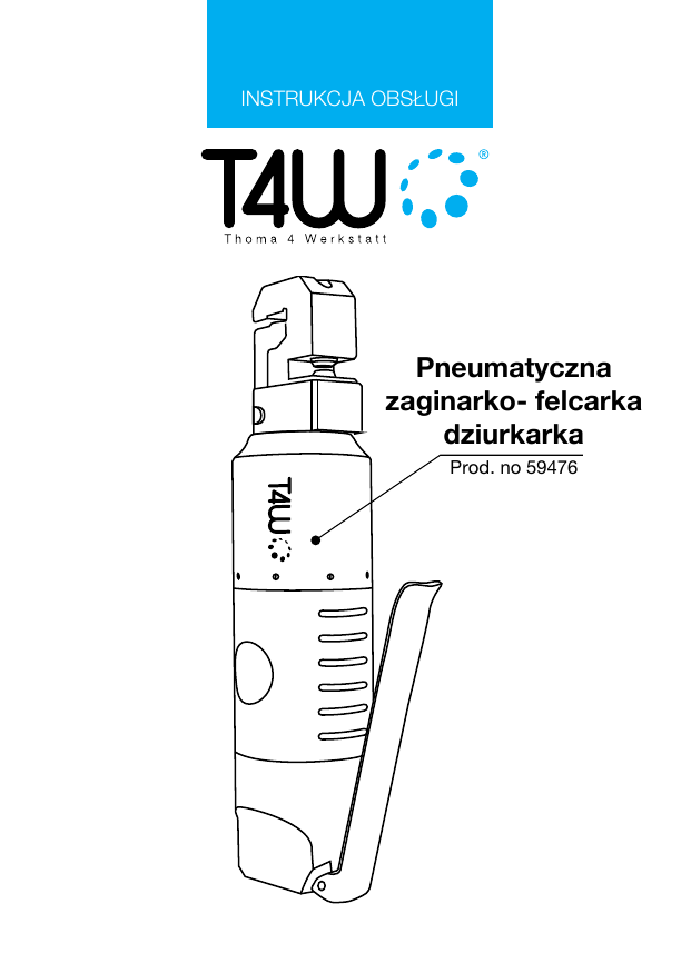 INSTRUKCJA OBSŁUGI Pneumatyczna zaginarko- felcarka dziurkarka Prod. no 59476 Lista części.................................................................................... 3 Środowisko pracy.......................................................................... 4 Bezpieczeństwo w czasie pracy..................................................... 4 Opis działania................................................................................. 5 Konserwacja.................................................................................. 6 Schemat połączenia....................................................................... 6 Instrukcja obsługi........................................................................... 6 Częste problemy i ich rozwiązanie.................................................. 8 2 Lista części 1 2 3 4 5 6 7 8 9 10 11 12 13 14 15 16 17 18 zacisk śruba tuleja tuleja podkładki stempel wkręt osłonka kowadło uszczelka oleju podkładka o-ring korek oleju o-ring siłownik hydrauliczny cylinder sprężonego powietrza rękaw korpus zaworu 19 20 21 22 23 24 25 26 27 28 29 30 31 32 33 34 35 36 37 wlot powietrza dźwignia przepustnicy bolec blokujący o-ring tuleja sprężyna zawór sprężyna o-ring wkręt o-ring podkładka pod pierścień hydrauliczny tłok o-ring wsparcie pierścień sprężyna tłok o-ring sprężyna 3 OSTRZEŻENIE! Proszę przeczytać instrukcję obsługi przed użyciem urządzenia i zachować ją w bezpiecznym miejscu. Przed dopuszczeniem kogoś do korzystania z tego produktu, upewnij się, że jest świadomy ryzyka wynikającego z użycia sprzętu.. OSTRZEŻENIE! Omówione w niniejszej instrukcji uwagi odnośnie możliwego ryzyka nie są w stanie przewidzieć wszystkich możliwych warunków i sytuacji, które mogą wystąpić. Zdrowy rozsądek i ostrożność nie są częścią tego produktu, ale muszą być zachowane przez operatora. tę instrukcję dla swego bezpieczeństwa, z czasem LLZachowaj odświeżyć pamięć odnośnie bezpiecznego używania przyrządu. warto Środowisko pracy • Miejsce pracy należy utrzymywać czyste i dobrze oświetlone • Nie stosować w miejscu pracy łatwopalnych gazów lub cieczy. • Osoby postronne oraz rzeczy nie wchodzące w skład wyposażenia trzymać z dala od miejsca pracy. czynniki rozpraszające pracę do minimum. Chwila nieuwagi LLZminimalizuj może spowodować wypadek. • Przechowuj narzędzia w odpowiednio suchym i bezpiecznym miejscu, aby zapobiec korozji lub uszkodzeniu. • Zawsze zabezpieczaj narzędzia i trzymaj je z dala od dzieci. Bezpieczeństwo w czasie pracy • Bądź ostrożny w trakcie pracy. Nie używać narzędzia, gdy jesteś zmęczony, pod wpływem narkotyków, alkoholu lub leków. Chwila nieuwagi podczas pracy zwiększa ryzyko wypadku. • Ubierz się odpowiednio. Nie noś luźnej odzieży ani biżuterii. Spinaj długie włosy. Luźne ubrania, biżuteria lub długie włosy zwiększają ryzyko obrażeń osób w wyniku pochwycenia przez ruchome części przyrządu. • Unikaj przypadkowego włączenia. Upewnij się, że przełącznik jest wyłączony przed podłączeniem do zasilania powietrzem. Nie przenoś urządzenia z palcem na przełącznik, unikasz w ten sposób przypadkowego włączenia. • Stabilna pozycja i równowaga ciała w trakcie pracy, umożliwia 4 lepszą kontrolę nad narzędziem w nieoczekiwanych sytuacjach. • Używać sprzętu ochronnego. Maskę przeciwpyłową, antypoślizgowe obuwie ochronne i kask. • Zawsze należy nosić okulary ochronne w trakcie pracy. • Należy stosować ochronę słuchu podczas korzystania z narzędzia. Długotrwałe narażenie na głośny hałas może spowodować utratę słuchu. • Ryzyko porażenia prądem. To urządzenie nie posiada izolowanej powierzchni, kontakt z przewodem pod napięciem może skutkować porażeniem prądem. Opis działania • Obrabiany element powinien być należycie unieruchomionyzabezpieczony w trakcie pracy np. poprzez zastosowanie zacisków. • Nie należy przeciążać urządzenia. Używaj tylko sprawnych i atestowanych narzędzi. Narzędzia wykorzystuj zgodnie ich przeznaczeniem. • Nie należy korzystać z urządzenia, jeśli przełącznik zasilania jest niesprawny. Każde narzędzie, z niesprawnym wyłącznikiem jest niebezpieczne i musi zostać naprawione. • Przed przystąpieniem do regulacji, wymiany akcesoriów lub przechowywaniem narzędzia, odłącz narzędzie od źródła powietrza. Taki środek zapobiegawczy zmniejsza ryzyko przypadkowego uruchomienia narzędzia. Odłącz dopływ powietrza, przestaw przełącznik do pozycji OFF przed opuszczeniem miejsca pracy. • Przechowywać narzędzia, gdy nie jest ono używane w miejscu niedostępnym dla dzieci i osób nie przeszkolonych. Narzędzie jest niebezpieczne w rękach niedoświadczonych użytkowników. • Zadbaj o odpowiedni stan techniczny narzędzia. 5 • Sprawdzić stan techniczny ruchomych części, wszelkie pęknięcia i uszkodzenia mechaniczne dyskwalifikują je do dalszego użycia. Uszkodzone narzędzie może powodować ryzyko wypadku. Wiele wypadków spowodowanych jest przez niewłaściwą konserwację. Istnieje ryzyko rozerwania jeśli narzędzie jest uszkodzone. • Należy używać tylko oryginalnych akcesoriów, które są dopuszczone przez producenta dla danego modelu narzędzia. Użycie akcesoriów nie przeznaczonych do użytku z określonego modelu narzędzia, zwiększa ryzyko obrażeń osób. Konserwacja Usługa narzędzie musi być wykonywane wyłącznie przez wykwalifikowany personel. Podczas serwisowania narzędzia, należy używać tylko oryginalnych części zamiennych. Stosować wyłącznie oryginalne części. Schemat połączenia 1 2 3 4 Przewód sprężonego powietrza Filtr Regulator ciśnienia 1 5 Odolejacz szybkozłączka (opcjonalnie) Instrukcja obsługi UWAGA: podczas pracy z blachą należy nosić odpowiednie - skórzane rękawiczki. Ostre krawędzie mogą spowodować poważne obraże