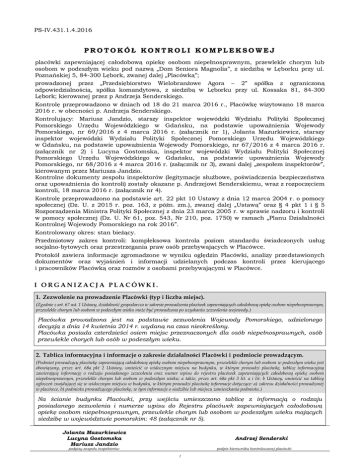 PS-IV.431.1.4.2016 PROTOKÓŁ KONTROLI KOMPLEKSOWEJ placówki zapewniającej całodobową opiekę osobom niepełnosprawnym, przewlekle chorym lub osobom w podeszłym wieku pod nazwą „Dom Seniora Magnolia”, z siedzibą w Lęborku przy ul. Poznańskiej 5, 84-300 Lębork, zwanej dalej „Placówką”; prowadzonej przez „Przedsiębiorstwo Wielobranżowe Agora – 2” spółka z ograniczoną odpowiedzialnością, spółka komandytowa, z siedzibą w Lęborku przy ul. Kossaka 81, 84-300 Lębork; kierowanej przez p Andrzeja Senderskiego. Kontrolę przeprowadzono w dniach od 18 do 21 marca 2016 r., Placówkę wizytowano 18 marca 2016 r. w obecności p. Andrzeja Senderskiego. Kontrolujący: Mariusz Jandzio, starszy inspektor wojewódzki Wydziału Polityki Społecznej Pomorskiego Urzędu Wojewódzkiego w Gdańsku, na podstawie upoważnienia Wojewody Pomorskiego, nr 69/2016 z 4 marca 2016 r. (załącznik nr 1), Jolanta Mazurkiewicz, starszy inspektor wojewódzki Wydziału Polityki Społecznej Pomorskiego Urzędu Wojewódzkiego w Gdańsku, na podstawie upoważnienia Wojewody Pomorskiego, nr 67/2016 z 4 marca 2016 r. (załącznik nr 2) i Lucyna Gostomska, inspektor wojewódzki Wydziału Polityki Społecznej Pomorskiego Urzędu Wojewódzkiego w Gdańsku, na podstawie upoważnienia Wojewody Pomorskiego, nr 68/2016 z 4 marca 2016 r. (załącznik nr 3), zwani dalej „zespołem inspektorów”, kierowanym przez Mariusza Jandzio. Kontrolne dokumenty zespołu inspektorów (legitymacje służbowe, poświadczenia bezpieczeństwa oraz upoważnienia do kontroli) zostały okazane p. Andrzejowi Senderskiemu, wraz z rozpoczęciem kontroli, 18 marca 2016 r. (załącznik nr 4). Kontrolę przeprowadzono na podstawie art. 22 pkt 10 Ustawy z dnia 12 marca 2004 r. o pomocy społecznej (Dz. U. z 2015 r. poz. 163, z późn. zm.), zwanej dalej „Ustawą” oraz § 4 pkt 1 i § 5 Rozporządzenia Ministra Polityki Społecznej z dnia 23 marca 2005 r. w sprawie nadzoru i kontroli w pomocy społecznej (Dz. U. Nr 61, poz. 543, Nr 210, poz. 1750) w ramach „Planu Działalności Kontrolnej Wojewody Pomorskiego na rok 2016”. Kontrolowany okres: stan bieżący. Przedmiotowy zakres kontroli: kompleksowa kontrola poziom standardu świadczonych usług socjalno-bytowych oraz przestrzegania praw osób przebywających w Placówce. Protokół zawiera informacje zgromadzone w wyniku oględzin Placówki, analizy przedstawionych dokumentów oraz wyjaśnień i informacji udzielanych podczas kontroli przez kierującego i pracowników Placówką oraz rozmów z osobami przebywającymi w Placówce. I ORGANIZACJA PLACÓWKI. 1. Zezwolenie na prowadzenie Placówki (typ i liczba miejsc). (Zgodnie z art. 67 ust. 1 Ustawy, działalność gospodarcza w zakresie prowadzenia placówek zapewniających całodobową opiekę osobom niepełnosprawnym, przewlekle chorym lub osobom w podeszłym wieku może być prowadzona po uzyskaniu zezwolenia wojewody.) Placówka prowadzona jest na podstawie zezwolenia Wojewody Pomorskiego, udzielonego decyzją z dnia 14 kwietnia 2014 r. wydaną na czas nieokreślony. Placówka posiada czterdzieści osiem miejsc przeznaczonych dla osób niepełnosprawnych, osób przewlekle chorych lub osób w podeszłym wieku. 2. Tablica informacyjna i informacje o zakresie działalności Placówki i podmiocie prowadzącym. (Podmiot prowadzący placówkę zapewniającą całodobową opiekę osobom niepełnosprawnym, przewlekle chorym lub osobom w podeszłym wieku jest obowiązany, przez art. 68a pkt 2 Ustawy, umieścić w widocznym miejscu na budynku, w którym prowadzi placówkę, tablicę informacyjną zawierającą informację o rodzaju posiadanego zezwolenia oraz numer wpisu do rejestru placówek zapewniających całodobową opiekę osobom niepełnosprawnym, przewlekle chorym lub osobom w podeszłym wieku; a także, przez art. 68a pkt 3 lit. a i lit. b Ustawy, umieścić na tablicy ogłoszeń znajdującej się w widocznym miejscu w budynku, w którym prowadzi placówkę informacje dotyczące: a) zakresu działalności prowadzonej w placówce, b) podmiotu prowadzącego placówkę, w tym informacje o siedzibie lub miejscu zamieszkania podmiotu.) Na ścianie budynku Placówki, przy wejściu umieszczono tablicę z informacją o rodzaju posiadanego zezwolenia i numerze wpisu do Rejestru placówek zapewniających całodobową opiekę osobom niepełnosprawnym, przewlekle chorym lub osobom w podeszłym wieku mających siedzibę w województwie pomorskim: 48 (załącznik nr 5). Jolanta Mazurkiewicz Lucyna Gostomska Mariusz Jandzio Andrzej Senderski podpisy zespołu inspektorów podpis kierownika kontrolowanej placówki 1 Protokół nr PS-IV.431.1.4.2016 z przeprowadzonej w dniach od 18 do 21 marca 2016 r. kontroli standardu świadczonych usług przez placówkę zapewniającą całodobową opiekę osobom niepełnosprawnym, przewlekle chorym lub osobom w podeszłym wieku pod nazwą „Dom Seniora Magnolia”, z siedzibą w Lęborku przy ul. Poznańskiej 5, 84-300 Lębork. W centralnym miejscu budynku w holu przy drzwiach wejściowych na tablicy ogłoszeń stwierdzono brak informacji dotyczącej zakresu działalności prowadzonej w Placówce oraz podmiotu prowadzącego Placówkę, w tym informacji o siedzibie podmiotu. W trakcie wizytacji Placówki w dniu 18 marca 2016 r. p. Andrzej Senderski uzupełnił brakującą ww. informację i umieścił ją na tablicy ogłoszeń. II USŁUGI BYTOWE. 1. Miejsce pobytu (budynek i jego otoczenie). (Na podstawie art. 68 ust. 1 pkt 2 lit. a Ustawy, opieka w placówce zapewniającej całodobową opiekę osobom niepełnosprawnym, przewlekle chorym lub osobom w podeszłym wieku polega na świadczeniu przez całą dobę usług bytowych zapewniających miejsce pobytu.) Placówka mieści się w trzykondygnacyjnym budynku zamieszkania zbiorowego, wyposażonym w dźwig osobowy (windę). Przed Placówką znajdują się miejsca postojowe dla samochodów użytkowników stałych i przebywających okresowo, w tym r