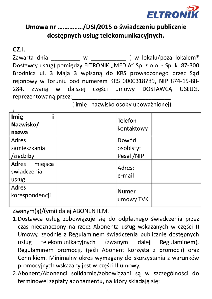 Umowa nr ……………/DSI/2015 o świadczeniu publicznie dostępnych usług telekomunikacyjnych. CZ.I. Zawarta dnia _________ w ___________ ( w lokalu/poza lokalem* Dostawcy usług) pomiędzy ELTRONIK „MEDIA” Sp. z o.o. - Sp. k. 87-300 Brodnica ul. 3 Maja 3 wpisaną do KRS prowadzonego przez Sąd rejonowy w Toruniu pod numerem KRS 0000318789, NIP 874-15-88284, zwaną w dalszej części umowy DOSTAWCĄ USŁUG, reprezentowaną przez:_______________________________ ( imię i nazwisko osoby upoważnionej) a Imię i Nazwisko/ nazwa Adres zamieszkania /siedziby Adres miejsca świadczenia usług Adres korespondencji Telefon kontaktowy Dowód osobisty: Pesel /NIP Adres: e-mail Numer umowy TVK Zwanym(ą)/(ymi) dalej ABONENTEM. 1.Dostawca usług zobowiązuje się do odpłatnego świadczenia przez czas nieoznaczony na rzecz Abonenta usług wskazanych w części II Umowy, zgodnie z Regulaminem świadczenia publicznie dostępnych usług telekomunikacyjnych (zwanym dalej Regulaminem), Regulaminem promocji, (jeśli Abonent korzysta z promocji) oraz Cennikiem. Minimalny okres wymagany do skorzystania z warunków promocyjnych wskazany jest w części II umowy. 2.Abonent/Abonenci solidarnie/zobowiązani są w szczególności do terminowej zapłaty abonamentu, na który składają się: 1 a) opłata za dostęp do Sieci TVK b) opłata za możliwość korzystania z Usługi, c) opłata za usługi serwisowe. d) inne opłaty wynikające z Cennika, Regulaminu, Regulaminu promocji lub Umowy. W przypadku opóźnienia w zapłacie Abonent zobowiązany jest do zapłaty odsetek ustawowych. Opłaty dokonywane są na rachunek Dostawca usług na wskazane na dokumencie konto bankowe. Inne sposoby zapłaty określa Regulamin. Za dzień zapłaty uważa się dzień uznania rachunku bankowego Dostawcy usług. 3.Dostawca usług, zapewnia następujące procedury zmiany Umowy: a) Zmiana warunków Umowy, co do danych z art. 56 ust. 3 pkt. 2, 4-7 Pt (zmiana zakresu świadczonych usług, elementów, składających się na abonament, okresu, na jaki Umowa została zawarta, minimalnego okresu do skorzystania z warunków promocyjnych, pakietu programowego, taryfowego, pakietu w usłudze transmisji danych z dostępem do Internetu, sposobu zamawiania pakietów oraz dodatkowych opcji usług, sposobu dokonywania płatności) może zostać dokonana za pomocą środków porozumiewania się na odległość. Dostawca usług, zobowiązany jest utrwalić zgłoszenie zmiany i przechowywać je zgodnie z przepisami oraz udostępniać na każde żądanie Abonenta. Zmiana taka wymaga potwierdzenia jej przez Dostawcę usług, co do tego, że została złożona, czego zmiana dotyczy i od jakiego dnia zmiana będzie wprowadzona w życie. Potwierdzenie winno zostać doręczone Abonentowi w terminie z nim ustalonym, nie później jednak niż w terminie 1 miesiąca od dnia zgłoszenia zmiany. Potwierdzenie Dostawca usług dostarcza Abonentowi za pomocą środków porozumiewania się na odległość. Jeśli takie dostarczenie nie jest niemożliwe lub zażądał tego Abonent, potwierdzenie dostarczane jest w formie pisemnej. Potwierdzenie winno zawierać treść zmiany warunków Umowy lub odesłanie do miejsca na stronie internetowej www.eltronik.net.pl gdzie zmiana jest zamieszczona ze względu na jej objętość, oraz informację o zgłoszeniu zmiany, jej zakresie i terminie wprowadzenia zmian. Abonent może odstąpić od dokonanej zmiany bez podania przyczyn w terminie 14 2 dni od dnia otrzymania potwierdzenia. Jeśli Abonent nie otrzymał potwierdzenia, może odstąpić od dokonanej zmiany w terminie 3 miesiącu od dnia zgłoszenia zmiany. Jeżeli po rozpoczęciu biegu 3 miesięcznego terminu Abonent otrzyma potwierdzenie termin ulega skróceniu do 14 dni, od dnia otrzymania potwierdzenia. Odstąpienie nie jest możliwe, jeśli Dostawca usług za zgodą Abonenta rozpoczął świadczenie usług zgodnie z dokonaną zmianą. b) O zmianach warunków Umowy, w tym określonych w Cenniku i/lub Regulaminach Dostawca usług informuje Abonenta na piśmie, chyba, że Abonent zażądał poinformowania za pomocą środków porozumiewania się na odległość oraz podaje treść zmian warunków Umowy określonych w Regulaminach i/lub Cenniku do publicznej wiadomości, z wyprzedzeniem, co najmniej 1 miesiąca przed wprowadzeniem zmian. Krótszy termin może wynikać z przepisów prawa. Jeśli Abonent nie akceptuje zmian może rozwiązać Umowę do dnia wejścia zmian w życie. W przypadku rozwiązania Umowy przez Abonenta z powodu podwyższenia cen i/lub zmiany warunków Umowy, w tym określonych w Regulaminach Dostawcy usług nie przysługuje zwrot odszkodowania za przydzielone ulgi. Dostawca usług, może jednak żądać od Abonenta roszczenia odszkodowawczego w przypadku rozwiązania Umowy przez Abonenta z powodu zmian warunków Umowy, w tym określonych w Regulaminach, wynikających z przepisów prawa albo z usunięcia niedozwolonych klauzul oraz wydania przez Prezesa UKE decyzji na podstawie art. 63 ust. 2a Pt. W przypadku braku akceptacji podwyższenia cen, Dostawcy usług nie przysługuje zwrot opustu. c) O zmianach warunków Umowy określonych w Regulaminach i/lub Cenniku, wynikających z przepisów prawa, powodujących obniżenie cen, dodanie nowej usługi lub wynikających z decyzji przez Prezesa UKE. Dostawca usług, informuje Abonenta przez podanie treści zmian do publicznej wiadomości z wyprzedzeniem, co najmniej 1 miesiąca przed ich wprowadzeniem w życie. Krótszy termin może wynikać z przepisów prawa. Dostawcy usług przysługuje w takim przypadku zwrot opustów. 3 d) O zmianach warunków Umowy, w tym określonych w Cenniku i/lub Regulaminach wynikających ze zmiany podatku VAT Dostawca usług, informuje Abonenta przez podanie do publicznej wiadomości informacji o zmianie warunków Umowy, w tym określonych w Regulaminach i/lub Cenniku, terminie wprowadzenia zmian ze wskazaniem miejsca udostępnienia treści zmian lub treści zmienionej U