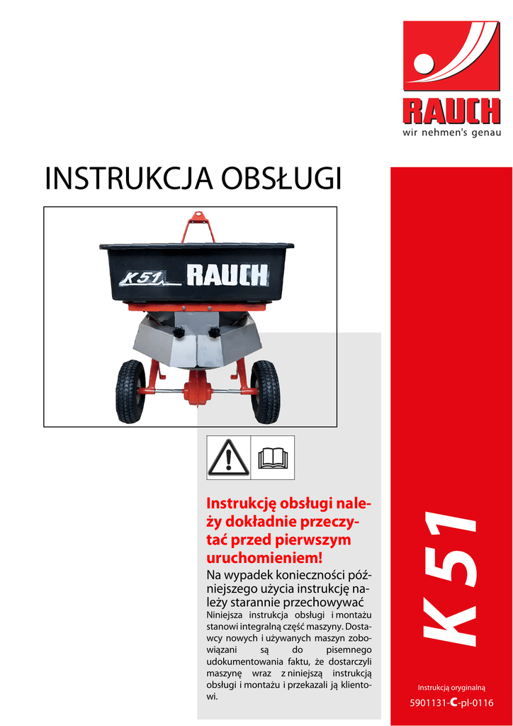 Instrukcję obsługi należy dokładnie przeczytać przed pierwszym uruchomieniem! Na wypadek konieczności późniejszego użycia instrukcję należy starannie przechowywać Niniejsza instrukcja obsługi i montażu stanowi integralną część maszyny. Dostawcy nowych i używanych maszyn zobowiązani są do pisemnego udokumentowania faktu, że dostarczyli maszynę wraz z niniejszą instrukcją obsługi i montażu i przekazali ją klientowi. K 51 INSTRUKCJA OBSŁUGI Instrukcją oryginalną c 5901131- -pl-0116 Wstęp Szanowni Klienci! Kupując rozsiewacz typu kombi K 51, okazali Państwo zaufanie wobec naszego produktu. Dziękujemy! Udowodnimy, że warto nam zaufać. Kupili Państwo wydajną i niezawodną maszynę. Gdyby jednak wbrew oczekiwaniom pojawiły się problemy, nasz serwis jest zawsze do Państwa dyspozycji. Prosimy, aby przed pierwszym uruchomieniem rozsiewacza typu kombi K 51 dokładnie przeczytać niniejszą instrukcję obsługi i stosować się do zamieszczonych w niej wskazówek. Instrukcja zawiera szczegółowy opis obsługi maszyny oraz cenne wskazówki dotyczące montażu, konserwacji i pielęgnacji. W niniejszej instrukcji może znajdować się również opis osprzętu, który nie stanowi wyposażenia zakupionej maszyny. Jak wiadomo, prawo do wnoszenia roszczeń z tytułu gwarancji za szkody powstałe na skutek błędów obsługi lub niewłaściwego użytkowania maszyny nie przysługuje. WSKAZÓWKA Prosimy o wpisanie w tym miejscu typu, numeru seryjnego oraz roku produkcji zakupionej maszyny. Dane te można znaleźć na tabliczce znamionowej lub na ramie. Podanie tych informacji jest wymagane w przypadku zamawiania części zamiennych lub wyposażenia specjalnego oraz w przypadku zgłaszania usterki. Typ Numer seryjny Rok produkcji Ulepszenia techniczne Dążymy do ciągłego ulepszania naszych produktów. W związku z tym zastrzegamy sobie prawo do wprowadzania w naszych maszynach bez uprzedzenia różnego rodzaju ulepszeń i zmian, o ile uznamy to za konieczne, przy czym jednocześnie wykluczamy obowiązek wprowadzania takich ulepszeń i zmian w uprzednio sprzedanych urządzeniach. Z chęcią odpowiemy na wszystkie pytania naszych Klientów. Z poważaniem RAUCH Landmaschinenfabrik GmbH Spis treści Wstęp 1 Użytkowanie zgodne z przeznaczeniem oraz zgodność z UE 1.1 1.2 2 3 1 Użytkowanie zgodne z przeznaczeniem . . . . . . . . . . . . . . . . . . . . . . . . . . . . . . . . . . 1 Deklaracja zgodności. . . . . . . . . . . . . . . . . . . . . . . . . . . . . . . . . . . . . . . . . . . . . . . . . 2 Wskazówki dla użytkownika 3 2.1 2.2 2.3 3 3 4 4 4 4 Kilka słów o instrukcji obsługi . . . . . . . . . . . . . . . . . . . . . . . . . . . . . . . . . . . . . . . . . . Układ instrukcji obsługi . . . . . . . . . . . . . . . . . . . . . . . . . . . . . . . . . . . . . . . . . . . . . . . Wskazówki dotyczące prezentacji tekstu. . . . . . . . . . . . . . . . . . . . . . . . . . . . . . . . . . 2.3.1 Instrukcje i polecenia . . . . . . . . . . . . . . . . . . . . . . . . . . . . . . . . . . . . . . . . . . . 2.3.2 Wyliczenia . . . . . . . . . . . . . . . . . . . . . . . . . . . . . . . . . . . . . . . . . . . . . . . . . . . 2.3.3 Odnośniki . . . . . . . . . . . . . . . . . . . . . . . . . . . . . . . . . . . . . . . . . . . . . . . . . . . . Bezpieczeństwo 5 3.1 3.2 3.3 3.4 Ogólne wskazówki . . . . . . . . . . . . . . . . . . . . . . . . . . . . . . . . . . . . . . . . . . . . . . . . . . . 5 Znaczenie wskazówek ostrzegawczych . . . . . . . . . . . . . . . . . . . . . . . . . . . . . . . . . . 5 Allgemeines zur Sicherheit der Maschine . . . . . . . . . . . . . . . . . . . . . . . . . . . . . . . . . 7 Wskazówki dla użytkownika . . . . . . . . . . . . . . . . . . . . . . . . . . . . . . . . . . . . . . . . . . . 7 3.4.1 Kwalifikacje personelu . . . . . . . . . . . . . . . . . . . . . . . . . . . . . . . . . . . . . . . . . . 7 3.4.2 Przeszkolenie. . . . . . . . . . . . . . . . . . . . . . . . . . . . . . . . . . . . . . . . . . . . . . . . . 7 3.4.3 Zapobieganie wypadkom . . . . . . . . . . . . . . . . . . . . . . . . . . . . . . . . . . . . . . . . 8 3.5 Wskazówki dotyczące bezpiecznej eksploatacji . . . . . . . . . . . . . . . . . . . . . . . . . . . . 8 3.5.1 Podnoszenie i przemieszczanie maszyny . . . . . . . . . . . . . . . . . . . . . . . . . . . 8 3.5.2 Ustawienie maszyny . . . . . . . . . . . . . . . . . . . . . . . . . . . . . . . . . . . . . . . . . . . 8 3.5.3 Napełnianie maszyny . . . . . . . . . . . . . . . . . . . . . . . . . . . . . . . . . . . . . . . . . . . 8 3.5.4 Czynności kontrolne przed uruchomieniem . . . . . . . . . . . . . . . . . . . . . . . . . . 9 3.5.5 Obszar zagrożeń . . . . . . . . . . . . . . . . . . . . . . . . . . . . . . . . . . . . . . . . . . . . . . 9 3.5.6 Bieżąca eksploatacja . . . . . . . . . . . . . . . . . . . . . . . . . . . . . . . . . . . . . . . . . . 10 3.6 Stosowanie nawozu. . . . . . . . . . . . . . . . . . . . . . . . . . . . . . . . . . . . . . . . . . . . . . . . . 10 3.7 Konserwacja i utrzymanie ruchu . . . . . . . . . . . . . . . . . . . . . . . . . . . . . . . . . . . . . . . 11 3.7.1 Kwalifikacje personelu konserwacyjnego. . . . . . . . . . . . . . . . . . . . . . . . . . . 11 3.7.2 Części zużywalne. . . . . . . . . . . . . . . . . . . . . . . . . . . . . . . . . . . . . . . . . . . . . 11 3.7.3 Prace konserwacyjne i serwisowe . . . . . . . . . . . . . . . . . . . . . . . . . . . . . . . . 11 3.8 Bezpieczeństwo w ruchu drogowym . . . . . . . . . . . . . . . . . . . . . . . . . . . . . . . . . . . . 12 3.8.1 Kontrole przed rozpoczęciem jazdy . . . . . . . . . . . . . . . . . . . . . . . . . . . . . . . 12 3.8.2 Przejazd transportowy z maszyną . . . . . . . . . . . . . . . . . . . . . . . . . . . . . . . . 12 3.9 Urządzenia zabezpieczające na maszynie . . . . . . . . . . . . . . . . . . . . . . . . . . . . . . . 13 3.9.1 Usytuowanie urządzeń zabezpieczających . . . . . . . . . . . . . . .