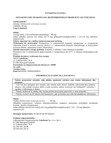 ETYKIETO-ULOTKA OZNAKOWANIE OPAKOWANIA BEZPOŚREDNIEGO PRODUKTU LECZNICZEGO GINKGOFOL® (Ginkgo bilobae folii extractum siccum) Tabletka, 40 mg Logo Labofarm Skład: wyciąg suchy z liści miłorzębu japońskiego – 40 mg Jedna tabletka zawiera nie mniej niż 6 mg ginkgoflawonoglikozydów i 2,0–2,8 mg laktonów terpenowych. Należy zapoznać się z ulotką zamieszczoną pod etykietą. Wskazania do stosowania: Pomocniczo w zaburzeniach krążenia mózgowego ze związanymi objawami (szum w uszach, zawroty głowy) i w zaburzeniach krążenia obwodowego w kończynach (uczucie chłodu, zaburzenia czucia, mrowienia). Sposób stosowania i droga podania: doustnie, 1 tabletka 3 razy dziennie po posiłku. Przechowywać w zamkniętych opakowaniach, w temperaturze do 25C, w miejscu niedostępnym dla dzieci. Produkt leczniczy wydawany bez recepty IWLF Labofarm ul. Lubichowska 176 b 83-200 Starogard Gdański Pozwolenie na dopuszczenie do obrotu nr: 10598 Nr serii: Termin ważn.: Kod EAN UCC 5909991059835 INFORMACJA O LEKU DLA PACJENTA Należy przeczytać uważnie całą ulotkę, ponieważ zawiera ona ważne informacje dla pacjenta. - Lek ten jest dostępny bez recepty, aby można było leczyć niektóre schorzenia bez pomocy lekarza. Aby jednak uzyskać dobry wynik leczenia, należy stosować lek Ginkgofol® ostrożnie i zgodnie z informacją w ulotce. - Należy zachować tę ulotkę, aby można ją było przeczytać ponownie w razie potrzeby. - Należy zwrócić się do lekarza lub farmaceuty, gdy potrzebna jest rada lub dodatkowa informacja. Skład: Ginkgo bilobae folii extractum siccum 40 mg Składniki pomocnicze: celuloza mikrokrystaliczna, magnezu stearynian, koloidalny dwutlenek krzemu, skrobia ziemniaczana Jedna tabletka zawiera nie mniej niż 6 mg ginkgoflawonoglikozydów i 2,0 – 2,8 mg laktonów terpenowych. Dostępne opakowania: 30 lub 60 lub 90 tabletek. Podmiot odpowiedzialny: Laboratorium Farmaceutyczne Labofarm Sp. z o.o. Sp. k. 83-200 Starogard Gdański ul. Lubichowska 176 b tel. 058 561-20-08 fax 058 561-20-16 e-mail: [email protected] 1. Co to jest lek Ginkgofol® i w jakim celu się go stosuje? Jest to lek w postaci tabletek, o działaniu usprawniającym krążenie tętnicze, żylne i włosowate naczyń krwionośnych. Lek stosuje się pomocniczo w zaburzeniach krążenia mózgowego ze związanymi objawami (szum w uszach, zawroty głowy) i w zaburzeniach krążenia obwodowego w kończynach (uczucie chłodu, zaburzenia czucia, mrowienia). 2. Zanim zastosuje się lek Ginkgofol®: Nie należy stosować leku w przypadku nadwrażliwości na jego składniki. Zachować szczególną ostrożność stosując lek Ginkgofol®: Preparat może powodować wydłużenie czasu krwawienia., dlatego w przypadku występowania hemofilii stosowanie leku należy konsultować z lekarzem. Istnieje możliwość interakcji preparatu z lekami przeciwagregacyjnymi i przeciwzakrzepowymi, inhibitorami MAO, diuretykami tiazydowymi, trazodonem, fluksetyną, buspironem, zielem dziurawca, melatoniną, insuliną, lekami metabolizowanymi przez cytochrom P 450 3A4. Stosowanie leku Ginkgofol® u dzieci: Lek nie jest przeznaczony dla dzieci. Ciąża i karmienie piersią: Nie stosować u kobiet w ciąży. Brak danych z badań klinicznych. Prowadzenie pojazdów i obsługa maszyn: Brak wpływu. 3. Jak stosować lek Ginkgofol®? Jeżeli lekarz nie zaleci inaczej: 1 tabletkę 3 razy dziennie po posiłku. Nie stosować dłużej niż przez 10 tygodni bez konsultacji z lekarzem. W przypadku zażycia większej dawki leku niż zalecana: Dla produktu nie zaobserwowano objawów przedawkowania. 4. Możliwe działania niepożądane: W rzadkich przypadkach mogą wystąpić: łagodne zaburzenia żołądkowo-jelitowe, bóle głowy, skórne reakcje alergiczne, krwawienia, w tym krwawienia wewnątrzczaszkowe. Zgłaszanie działań niepożądanych: Jeśli wystąpią jakiekolwiek objawy niepożądane, w tym wszelkie objawy niepożądane niewymienione w ulotce, należy powiedzieć o tym lekarzowi lub farmaceucie, lub pielęgniarce. Działania niepożądane można zgłaszać bezpośrednio do Departamentu Monitorowania Niepożądanych Działań Produktów Leczniczych Urzędu Rejestracji Produktów Leczniczych, Wyrobów Medycznych i Produktów Biobójczych: Al. Jerozolimskie 181C, 02-222 Warszawa, tel.: 22 49-21-301, fax: 22 49-21-309, e-mail: [email protected]. Działania niepożądane można zgłaszać również podmiotowi odpowiedzialnemu. Dzięki zgłaszaniu działań niepożądanych można będzie zgromadzić więcej informacji na temat bezpieczeństwa stosowania leku. 5. Przechowywanie leku Ginkgofol®: Przechowywać w zamkniętych opakowaniach w temperaturze do 25C, w miejscu niedostępnym dla dzieci. Nie należy stosować preparatu po upływie terminu ważności zamieszczonego na opakowaniu 6. Inne informacje: W celu uzyskania bardziej szczegółowych informacji należy zwrócić się do podmiotu odpowiedzialnego. Data zatwierdzenia ulotki: 2016.04.28