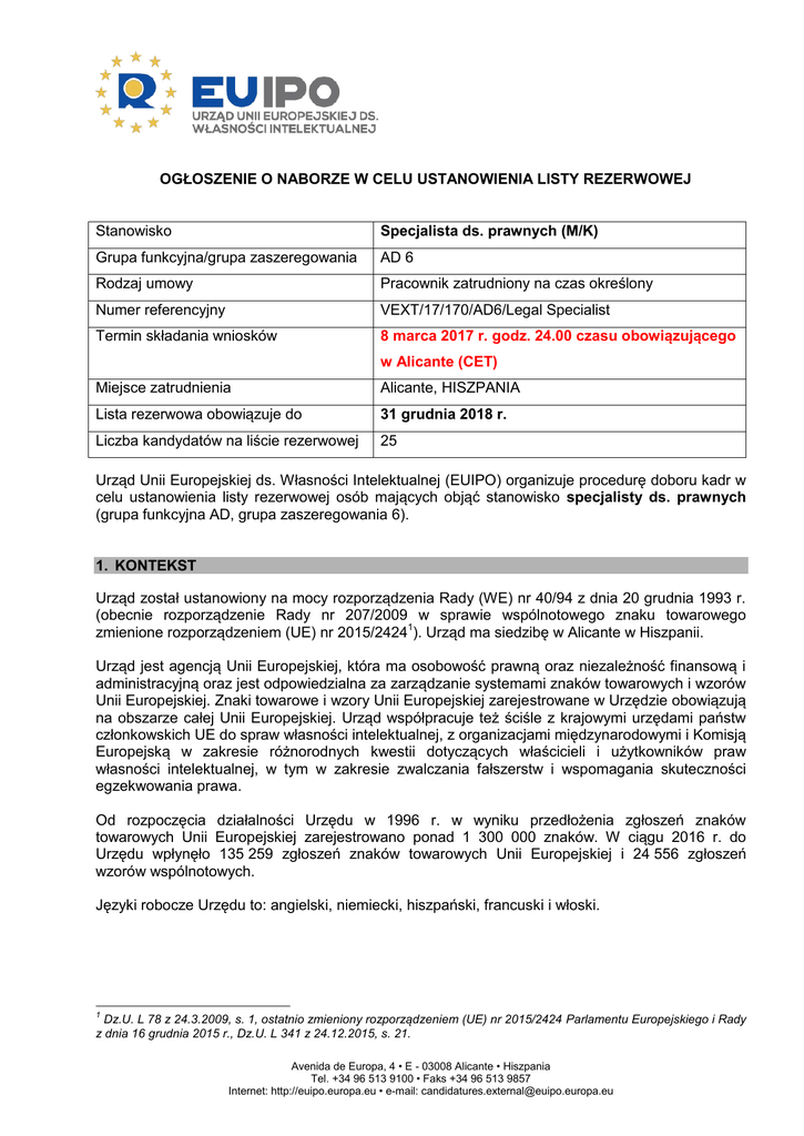 OGŁOSZENIE O NABORZE W CELU USTANOWIENIA LISTY REZERWOWEJ Stanowisko Specjalista ds. prawnych (M/K) Grupa funkcyjna/grupa zaszeregowania AD 6 Rodzaj umowy Pracownik zatrudniony na czas określony Numer referencyjny VEXT/17/170/AD6/Legal Specialist Termin składania wniosków 8 marca 2017 r. godz. 24.00 czasu obowiązującego w Alicante (CET) Miejsce zatrudnienia Alicante, HISZPANIA Lista rezerwowa obowiązuje do 31 grudnia 2018 r. Liczba kandydatów na liście rezerwowej 25 Urząd Unii Europejskiej ds. Własności Intelektualnej (EUIPO) organizuje procedurę doboru kadr w celu ustanowienia listy rezerwowej osób mających objąć stanowisko specjalisty ds. prawnych (grupa funkcyjna AD, grupa zaszeregowania 6). 1. KONTEKST Urząd został ustanowiony na mocy rozporządzenia Rady (WE) nr 40/94 z dnia 20 grudnia 1993 r. (obecnie rozporządzenie Rady nr 207/2009 w sprawie wspólnotowego znaku towarowego zmienione rozporządzeniem (UE) nr 2015/24241). Urząd ma siedzibę w Alicante w Hiszpanii. Urząd jest agencją Unii Europejskiej, która ma osobowość prawną oraz niezależność finansową i administracyjną oraz jest odpowiedzialna za zarządzanie systemami znaków towarowych i wzorów Unii Europejskiej. Znaki towarowe i wzory Unii Europejskiej zarejestrowane w Urzędzie obowiązują na obszarze całej Unii Europejskiej. Urząd współpracuje też ściśle z krajowymi urzędami państw członkowskich UE do spraw własności intelektualnej, z organizacjami międzynarodowymi i Komisją Europejską w zakresie różnorodnych kwestii dotyczących właścicieli i użytkowników praw własności intelektualnej, w tym w zakresie zwalczania fałszerstw i wspomagania skuteczności egzekwowania prawa. Od rozpoczęcia działalności Urzędu w 1996 r. w wyniku przedłożenia zgłoszeń znaków towarowych Unii Europejskiej zarejestrowano ponad 1 300 000 znaków. W ciągu 2016 r. do Urzędu wpłynęło 135 259 zgłoszeń znaków towarowych Unii Europejskiej i 24 556 zgłoszeń wzorów wspólnotowych. Języki robocze Urzędu to: angielski, niemiecki, hiszpański, francuski i włoski. 1 Dz.U. L 78 z 24.3.2009, s. 1, ostatnio zmieniony rozporządzeniem (UE) nr 2015/2424 Parlamentu Europejskiego i Rady z dnia 16 grudnia 2015 r., Dz.U. L 341 z 24.12.2015, s. 21. Avenida de Europa, 4 • E - 03008 Alicante • Hiszpania Tel. +34 96 513 9100 • Faks +34 96 513 9857 Internet: http://euipo.europa.eu • e-mail: [email protected] 2. OBOWIĄZKI Do obowiązków pomyślnie wyłonionych kandydatów będzie należeć wykonywanie zadań w zakresie wszystkich obszarów prawnych, na których działa Urząd, w tym prawa własności intelektualnej oraz działania powiązane z egzekwowaniem tych praw, w szczególności: oferowanie doradztwa prawnego i pomocy prawnej departamentom i członkom personelu wspierającym całą działalność Urzędu; sporządzanie projektów złożonych dokumentów prawnych (opinii prawnych, zarysów koncepcji, odpowiedzi na wnioski, decyzji, czynności prawnych), w tym w kontekście postępowania sądowego oraz działań egzekucyjnych; wykonywanie prac przygotowawczych takich jak badania prawne i analizy orzecznictwa; sporządzanie projektów streszczeń orzecznictwa w konsultacji ze współpracownikami; przygotowywanie i współtworzenie dokumentów dotyczących polityki w zakresie prawa własności intelektualnej i innych obszarów działalności Urzędu; reprezentowanie Urzędu w sporach dotyczących własności intelektualnej przed Trybunałem Sprawiedliwości Unii Europejskiej; udzielanie wsparcia prawnego w ramach ujednolicania praktyk w zakresie własności intelektualnej z urzędami krajowymi; wykonywanie czynności związanych z europejskim obserwatorium do spraw naruszeń praw własności intelektualnej; udział w sieciach wewnętrznych; przygotowywanie i dostarczanie prezentacji i komunikatów; wnoszenie wkładu na rzecz koordynacji, nadzorowania i mentoringu personelu. Obowiązki spoczywające na wszystkich pracownikach: aktywne działanie na rzecz osiągnięcia celów EUIPO zgodnie z planem strategicznym; wypełnianie wszelkich innych obowiązków i zobowiązań związanych z pracą, które może przydzielić bezpośredni przełożony. 3. KRYTERIA KWALIFIKACJI Aby kandydat mógł zostać dopuszczony do procedury naboru, musi spełniać wszystkie wymienione poniżej warunki przed upływem terminu na wniesienie zgłoszenia: Warunki ogólne2 mieć obywatelstwo jednego z państw członkowskich Unii Europejskiej; korzystanie z pełni praw obywatelskich; mieć uregulowany stosunek do służby wojskowej; spełniać wymogi dotyczące predyspozycji do wykonywania obowiązków wiążących się z danym stanowiskiem; mieć zdolność fizyczną do wykonywania obowiązków. Wykształcenie Kandydat musi mieć poziom wykształcenia odpowiadający ukończonym studiom uniwersyteckim trwającym co najmniej trzy lata, potwierdzony dyplomem z zakresu prawa lub ekwiwalentnymi kwalifikacjami prawniczymi. 2 Zob. art. 12 warunków zatrudnienia innych pracowników Unii Europejskiej. Avenida de Europa, 4 • E - 03008 Alicante • Hiszpania Tel. +34 96 513 9100 • Faks +34 96 513 9857 Internet: http://euipo.europa.eu • e-mail: [email protected] Doświadczenie zawodowe posiadać minimum 3 lata odpowiedniego pełnoetatowego doświadczenia zawodowego3 dotyczącego i będącego na poziomie zadań opisanych w „Obowiązkach”. Znajomość języków obcych Dogłębna znajomość języka angielskiego (poziom min. C1) – Język 1. Dobra znajomość jednego z języków urzędowych Unii Europejskiej (poziom min. B2) – Język 24. Wskazane poziomy odpowiadają wspólnemu europejskiemu systemowi opisu kształcenia językowego. Znajomość obsługi komputera Umiejętność obsługi komputera na poziomie zaawansowanym jest obowiązkowa. Kandydaci muszą wykazać obszerne doświadczenie praktyczne w zakresie aplikacji komputerowych takich jak pakiet MS Office lub podobny (głównie Word, Excel, PowerPoint, Outlo