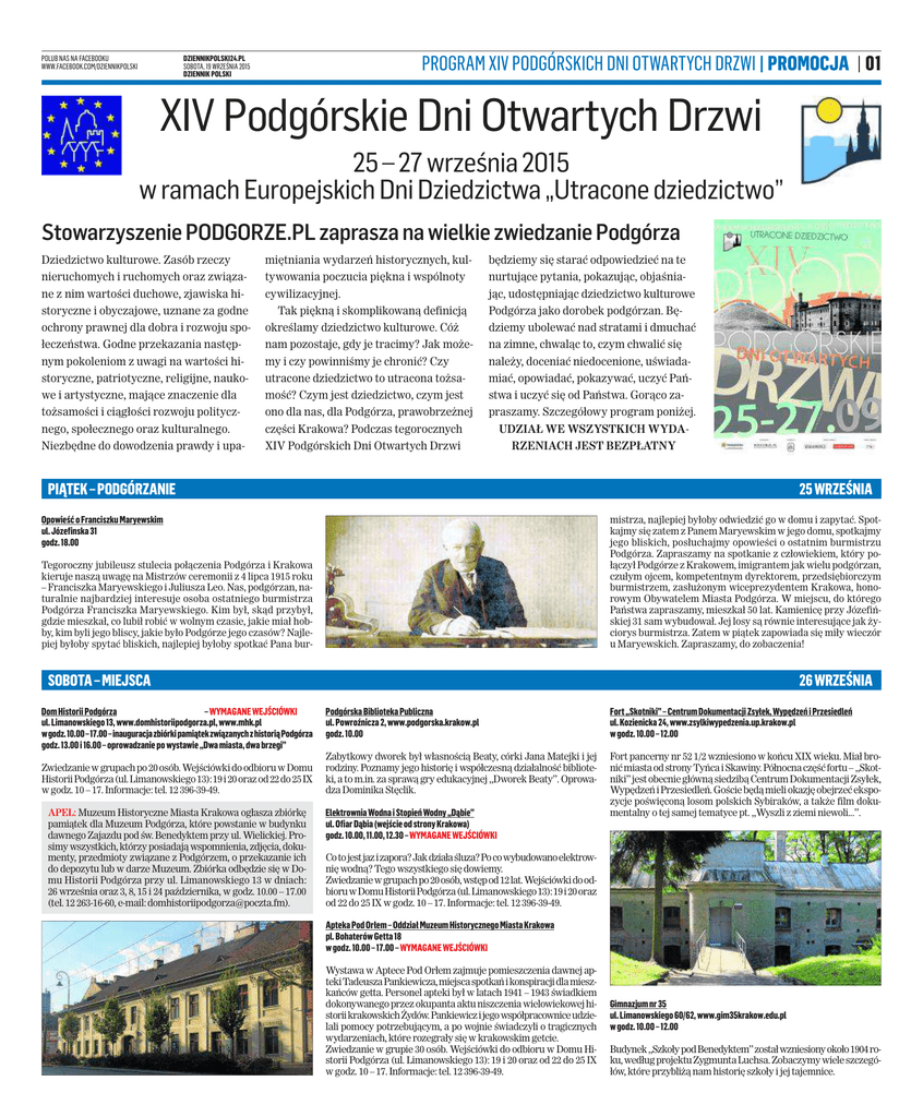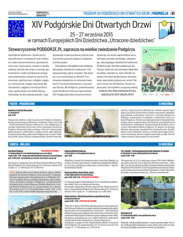 POLUB NAS NA FACEBOOKU WWW.FACEBOOK.COM/DZIENNIKPOLSKI PROGRAM XIV PODGÓRSKICH DNI OTWARTYCH DRZWI | PROMOCJA | 01 DZIENNIKPOLSKI24.PL SOBOTA, 19 WRZEŚNIA 2015 DZIENNIK POLSKI XIV Podgórskie Dni Otwartych Drzwi 25 – 27 września 2015 w ramach Europejskich Dni Dziedzictwa „Utracone dziedzictwo” Stowarzyszenie PODGORZE.PL zaprasza na wielkie zwiedzanie Podgórza Dziedzictwo kulturowe. Zasób rzeczy nieruchomych i ruchomych oraz związane z nim wartości duchowe, zjawiska historyczne i obyczajowe, uznane za godne ochrony prawnej dla dobra i rozwoju społeczeństwa. Godne przekazania następnym pokoleniom z uwagi na wartości historyczne, patriotyczne, religijne, naukowe i artystyczne, mające znaczenie dla tożsamości i ciągłości rozwoju politycznego, społecznego oraz kulturalnego. Niezbędne do dowodzenia prawdy i upa- miętniania wydarzeń historycznych, kultywowania poczucia piękna i wspólnoty cywilizacyjnej. Tak piękną i skomplikowaną definicją określamy dziedzictwo kulturowe. Cóż nam pozostaje, gdy je tracimy? Jak możemy i czy powinniśmy je chronić? Czy utracone dziedzictwo to utracona tożsamość? Czym jest dziedzictwo, czym jest ono dla nas, dla Podgórza, prawobrzeżnej części Krakowa? Podczas tegorocznych XIV Podgórskich Dni Otwartych Drzwi będziemy się starać odpowiedzieć na te nurtujące pytania, pokazując, objaśniając, udostępniając dziedzictwo kulturowe Podgórza jako dorobek podgórzan. Będziemy ubolewać nad stratami i dmuchać na zimne, chwaląc to, czym chwalić się należy, doceniać niedocenione, uświadamiać, opowiadać, pokazywać, uczyć Państwa i uczyć się od Państwa. Gorąco zapraszamy. Szczegółowy program poniżej. UDZIAŁ WE WSZYSTKICH WYDARZENIACH JEST BEZPŁATNY PIĄTEK – PODGÓRZANIE 25 WRZEŚNIA mistrza, najlepiej byłoby odwiedzić go w domu i zapytać. Spotkajmy się zatem z Panem Maryewskim w jego domu, spotkajmy jego bliskich, posłuchajmy opowieści o ostatnim burmistrzu Podgórza. Zapraszamy na spotkanie z człowiekiem, który połączył Podgórze z Krakowem, imigrantem jak wielu podgórzan, czułym ojcem, kompetentnym dyrektorem, przedsiębiorczym burmistrzem, zasłużonym wiceprezydentem Krakowa, honorowym Obywatelem Miasta Podgórza. W miejscu, do którego Państwa zapraszamy, mieszkał 50 lat. Kamienicę przy Józefińskiej 31 sam wybudował. Jej losy są równie interesujące jak życiorys burmistrza. Zatem w piątek zapowiada się miły wieczór u Maryewskich. Zapraszamy, do zobaczenia! Opowieść o Franciszku Maryewskim ul. Józefinska 31 godz. 18.00 Tegoroczny jubileusz stulecia połączenia Podgórza i Krakowa kieruje naszą uwagę na Mistrzów ceremonii z 4 lipca 1915 roku – Franciszka Maryewskiego i Juliusza Leo. Nas, podgórzan, naturalnie najbardziej interesuje osoba ostatniego burmistrza Podgórza Franciszka Maryewskiego. Kim był, skąd przybył, gdzie mieszkał, co lubił robić w wolnym czasie, jakie miał hobby, kim byli jego bliscy, jakie było Podgórze jego czasów? Najlepiej byłoby spytać bliskich, najlepiej byłoby spotkać Pana bur- SOBOTA – MIEJSCA Dom Historii Podgórza – WYMAGANE WEJŚCIÓWKI ul. Limanowskiego 13, www.domhistoriipodgorza.pl, www.mhk.pl wgodz.10.00–17.00–inauguracjazbiórkipamiątekzwiązanychzhistoriąPodgórza godz. 13.00 i 16.00 – oprowadzanie po wystawie „Dwa miasta, dwa brzegi” Zwiedzanie w grupach po 20 osób. Wejściówki do odbioru w Domu Historii Podgórza (ul. Limanowskiego 13): 19 i 20 oraz od 22 do 25 IX w godz. 10 – 17. Informacje: tel. 12 396-39-49. APEL: Muzeum Historyczne Miasta Krakowa ogłasza zbiórkę pamiątek dla Muzeum Podgórza, które powstanie w budynku dawnego Zajazdu pod św. Benedyktem przy ul. Wielickiej. Prosimy wszystkich, którzy posiadają wspomnienia, zdjęcia, dokumenty, przedmioty związane z Podgórzem, o przekazanie ich do depozytu lub w darze Muzeum. Zbiórka odbędzie się w Domu Historii Podgórza przy ul. Limanowskiego 13 w dniach: 26 września oraz 3, 8, 15 i 24 października, w godz. 10.00 – 17.00 (tel. 12 263-16-60, e-mail: [email protected]). 26 WRZEŚNIA Podgórska Biblioteka Publiczna ul. Powroźnicza 2, www.podgorska.krakow.pl godz. 10.00 Fort „Skotniki” – Centrum Dokumentacji Zsyłek, Wypędzeń i Przesiedleń ul. Kozienicka 24, www.zsylkiwypedzenia.up.krakow.pl w godz. 10.00 – 12.00 Zabytkowy dworek był własnością Beaty, córki Jana Matejki i jej rodziny. Poznamy jego historię i współczesną działalność biblioteki, a to m.in. za sprawą gry edukacyjnej „Dworek Beaty”. Oprowadza Dominika Stęclik. Fort pancerny nr 52 1/2 wzniesiono w końcu XIX wieku. Miał bronić miasta od strony Tyńca i Skawiny. Północna część fortu – „Skotniki” jest obecnie główną siedzibą Centrum Dokumentacji Zsyłek, Wypędzeń i Przesiedleń. Goście będą mieli okazję obejrzeć ekspozycje poświęconą losom polskich Sybiraków, a także film dokumentalny o tej samej tematyce pt. „Wyszli z ziemi niewoli...”. Elektrownia Wodna i Stopień Wodny „Dąbie” ul. Ofiar Dąbia (wejście od strony Krakowa) godz. 10.00, 11.00, 12.30 – WYMAGANE WEJŚCIÓWKI Cotojestjazizapora?Jakdziałaśluza?Po cowybudowanoelektrownię wodną? Tego wszystkiego się dowiemy. Zwiedzaniewgrupachpo20osób,wstępod 12lat.Wejściówkidoodbioru wDomu Historii Podgórza (ul. Limanowskiego 13): 19 i20 oraz od 22 do 25 IX w godz. 10 – 17. Informacje: tel. 12 396-39-49. Apteka Pod Orłem – Oddział Muzeum Historycznego Miasta Krakowa pl. Bohaterów Getta 18 w godz. 10.00 – 17.00 – WYMAGANE WEJŚCIÓWKI Wystawa w Aptece Pod Orłem zajmuje pomieszczenia dawnej apteki Tadeusza Pankiewicza, miejsca spotkań ikonspiracji dla mieszkańców getta. Personel apteki był w latach 1941 – 1943 świadkiem dokonywanego przez okupanta aktu niszczenia wielowiekowej historiikrakowskichŻydów.Pankiewiczijegowspółpracowniceudzielali pomocy potrzebującym, a po wojnie świadczyli o tragicznych wydarzeniach, któr