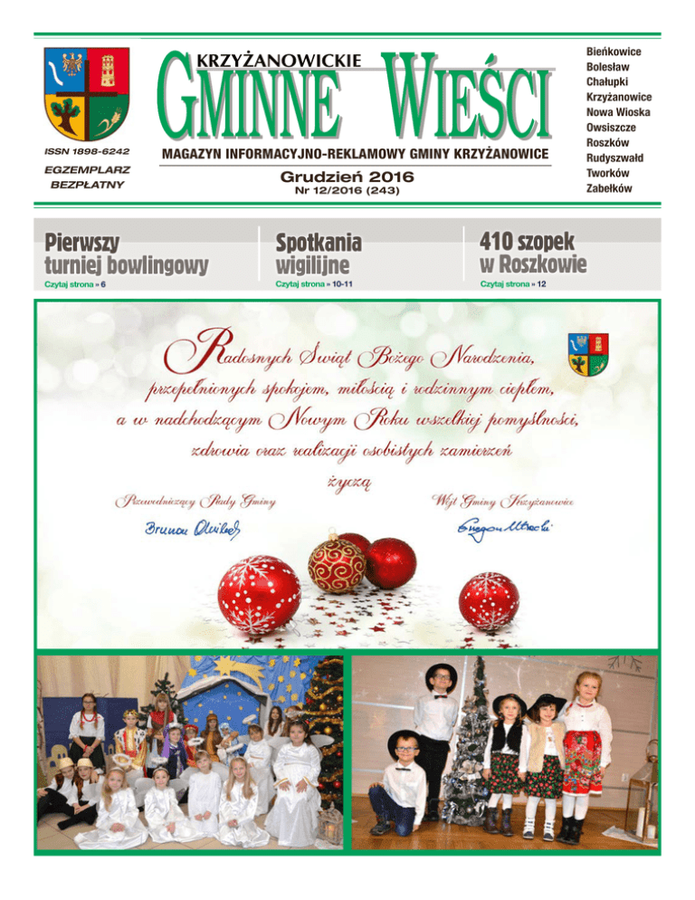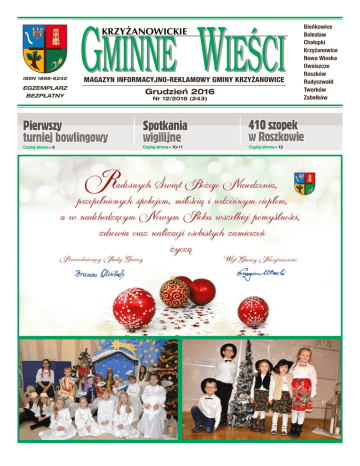 ISSN 1898-6242 MAGAZYN INFORMACYJNO-REKLAMOWY GMINY KRZYŻANOWICE EGZEMPLARZ BEZPŁATNY Pierwszy turniej bowlingowy Czytaj strona » 6 Grudzień 2016 Nr 12/2016 (243) Spotkania wigilijne Czytaj strona » 10-11 Bieńkowice Bolesław Chałupki Krzyżanowice Nowa Wioska Owsiszcze Roszków Rudyszwałd Tworków Zabełków 410 szopek w Roszkowie Czytaj strona » 12 2 » Wydarzenia i aktualności » Grudzień 2016 » Krzyżanowickie Gminne Wieści Święta z kolędą Tworków » „Święta z kolędą- Weihnachten mit Weihnachtsliedern”, pod takim tytułem odbył się 14 grudnia w Centrum Kultury w Tworkowie 12. Gminny Przegląd Kolęd i Pastorałek w języku polskim i niemieckim. Wszystkich gości, licznych uczestników konkursu i ich opiekunów powitała dyrektor GZOKSiT Daria Wieczorek, natomiast cały przegląd poprowadziła Sabina Ciuraszkiewicz. Organizowany przez Gminny Zespół Oświaty, Kultury, Sportu i Turystyki przegląd cieszy się niezmienną popularnością. Wzięły w nim udział zespoły wokalne, duety, soliści z przedszkoli, szkół podstawowych i gimnazjów oraz grupy wokalne i so- listki ze świetlicy w Chałupkach i Zabełkowie oraz DFK w Krzyżanowicach. Łącznie na scenie wystąpiło 170 dzieci. Kolę- dy i pastorałki nagradzane były przez widzów ogromnymi brawami, szczególnie te wykonywane przez najmłodszych, czyli przedszkolaków. Występy dzieci i młodzieży oceniało jury: Zuzanna Ortmans – muzykolog oraz Jan Goldman – muzyk, opiekun chóru parafialnego. Jurorzy zgodnie chwali- ZŁOTE GODY Polskiej medale za długoletnie pożycie małżeńskie 15 grudnia obu parom wręczył wójt gminy Grzegorz Utracki wraz z zastępcą kierownika Urzędu Stanu Cywilnego Dorotą Dwulecki, W tym roku 25 par z gminy waż na tę uroczystość nie mo- składając jubilatom serdeczne Krzyżanowice obchodziło jubi- gli przybyć państwo Agnieszka życzenia i gratulacje. Dostojni jubilaci zostali uholeusz 50-lecia zawarcia związku i Józef Moskwa z Krzyżanowic małżeńskiego. Uroczystość z tej oraz Józefa i Werner Mosyrz norowani medalami i dyplomaokazji miała miejsce w Urzędzie z Bieńkowic, przyznane przez mi oraz obdarowani kwiatami Gminy 6 października. Ponie- prezydenta Rzeczypospolitej i upominkami. li bardzo dobre przygotowanie, a niejednokrotnie wyjątkowe zdolności młodych śpiewaków. Docenili także dobór repertuaru, który zawierał wiele ciekawych i mało znanych utworów świątecznych, zarówno polskich jak i niemieckich. Gratulacje i dużo ciepłych słów usłyszeli opiekunowie, którzy przygotowali dzieci i młodzież do konkursu. Laureaci przeglądu wystąpią podczas Koncertu Galowego „Kolędowanie przy żłóbku” 15 stycznia 2017 roku w kościele parafialnym w Tworkowie. (tb) « Wydarzenia i aktualności « 3 Grudzień 2016 » Krzyżanowickie Gminne Wieści Na świąteczną nutę Tworków » Kiermasz Bożonarodzeniowy w Tworkowie to święto dla wszystkich zmysłów – smakowicie pachnący, roztaczający świąteczną aurę, z bożonarodzeniowymi dźwiękami i kulinarnymi przysmakami. Ta przedświąteczna impreza organizowana przez Gminy Zespół Oświaty Kultury Sportu i Turystyki, w drugą niedzielę adwentu, cieszy się ogromnym zainteresowaniem nie tylko wśród mieszkańców naszej gminy. W tegorocznym kiermaszu swoje miejscowe specjały przygotowały koła gospodyń wiejskich z Bieńkowic, Chałupek, Rudyszwałdu, Zabełkowa i Owsiszcz. Panie przy pięknie ozdobionych stołach oferowały odwiedzającym przepyszne serniki, ciasteczka świąteczne, pierniczki, torty, babeczki, makowce. Dla osób, które lubią konkretne potrawy mistrzynie kuchni przygotowały sałatki, krokiety, pierogi z kapustą i grzybami. Nie zabrakło także moczki. Na kiermaszu można było kupić stroiki i wszelkie ozdoby świąteczne zrobione przez dzieci i młodzież na zajęciach w świetlicach. Oferta była bardzo urozmaicona. Od różnorodnych bombek, ozdób, po gwiazdki, aniołki, kartki świąteczne i stroiki. W świąteczny nastrój wprowadziły wszystkich melodie grane przez Orkiestrę Dętą Gminy Krzyżanowice pod kierunkiem Krzysztofa Fulneczka. Z orkiestrą wystąpiła gościnnie Natalia Tul oraz Sandra Czuraj, uczennica tworkowskiej szkoły. Gościem specjalnym był święty Mikołaj, który rozdał prezenty przedstawicielkom KGW. Przybyłym na kiermasz mieszkańcom świąteczne życzenia złożył wójt gminy Grzegorz Utracki i dyrektor GZOKSiT Daria Wieczorek. Na tworkowski kiermasz zawitał też staro- sta Bogumina Petr Vicha oraz wójt senior Wilhelm Wolnik. Podczas kiermaszu wręczono dyplomy i nagrody za wyróżnione prace w Gminnym Konkursie na Szopkę Bożonarodzeniową: Przedszkola • Karol Czerwiński 6 lat – Świetlica Chałupki • Wiktor Lasak 5 lat – Świetlica Tworków • Karolina Basista 6 lat – Świetlica Rudyszwałd Klasy I – III • Samuel Wolnik 9 lat – Świetlica Rudyszwałd • Wiktoria Antończyk 9 lat – Świetlica Chałupki • Błażej Nawrocki 7 lat – Świe• Natalia Klon 11 lat – Świetli- Gimnazja tlica Tworków ca Chałupki • Dominik Obruśnik 15 lat – • Oliwia Siwoń 12 lat – ŚwietliKlasy IV – VI Świetlica Bolesław ca Krzyżanowice • Patryk Fichna 14 lat – Świe• Natalia Riedel 11 lat – Świetlica Bolesław tlica Roszków • Martyna Bujak 13 lat – Świetlica Krzyżanowice Dorośli • Anna Gajęcka – KGW Chałupki • Irena Mikołajek – Świetlica Roszków • Zofia Lukoszek – Świetlica Nowa Wioska Praca rodzinna/zbiorowa • Julia Fiegler, Adam Kramarczyk, Magdalena Kramarczyk – Świetlica Bieńkowice • Kacper Kuprewicz i Jessica Pitrasz – Świetlica Chałupki • Koło Gospodyń Wiejskich – Tworków (tb) 4 » Wydarzenia i aktualności » KRÓTKO 1 grudnia Wójt gminy Krzyżanowice spotkał się z rektorem PWSZ w Raciborzu w sprawie nawiązania współpracy. 4 grudnia Kiermasz przedświąteczny w Centrum Kultury w Tworkowie zorganizowany przez GZOKSiT i koła g