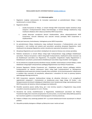 REGULAMIN SKLEPU INTERNETOWEGO WWW.EVREE.EU § 1. Informacje ogólne 1. Regulamin znajduje zastosowanie do transakcji zawieranych za pośrednictwem Sklepu i Usług świadczonych w ramach Sklepu. 2. Regulamin określa: i. zasady korzystania ze Sklepu, w ramach którego MCR Corporation będzie świadczył usługi związane z funkcjonowaniem sklepu internetowego, w ramach którego Użytkownicy mają możliwość składania ofert nabycia produktów MCR Corporation, ii. zasady dotyczące zarządzania danymi Użytkowników, zakres odpowiedzialności MCR Corporation, warunki reklamacji oraz warunki Umowy pomiędzy MCR Corporation a Użytkownikiem. 3. Serwis jest tworzony, kontrolowany i obsługiwany przez MCR Corporation. 4. Za pośrednictwem Sklepu Użytkownicy mają możliwość korzystania z Funkcjonalności, przy czym korzystanie z nich możliwe jest jedynie pod warunkiem uprzedniej akceptacji Regulaminu. Jeżeli Użytkownik nie akceptuje Regulaminu winien niezwłocznie zaprzestać korzystania z Serwisu. 5. Akceptacja Regulaminu jest warunkiem niezbędnym do zawarcia Umowy oraz umowy sprzedaży. 6. Niektóre świadczone w ramach Sklepu Usługi bądź Funkcjonalności mogą podlegać Dodatkowym warunkom. Podczas korzystania z takich Usług bądź Funkcjonalności, Użytkownik winien stosować się do Dodatkowych warunków oraz Regulaminu. W przypadku niezgodności między Regulaminem a Dodatkowymi warunkami, postanowienia Dodatkowych warunków mają charakter rozstrzygający. 7. ile nie zostanie to w sposób wyraźny określone inaczej, wszelkie: nowe funkcje w ramach Sklepu, a także dodatkowe Usługi bądź Funkcjonalności podlegają Regulaminowi oraz Polityce Prywatności. 8. Zarówno Regulamin, Polityka Prywatności jak i Dodatkowe warunki, którym podlegają niektóre Funkcjonalności (w zakresie dotyczącym takich Usług bądź Funkcjonalności) są udostępnione nieodpłatnie przed zawarciem Umowy w sposób, który umożliwia : (i) ich przechowywanie i odtwarzanie w zwykłym toku czynności; (ii) pozyskanie, odtwarzanie i utrwalanie ich treści za pomocą Systemu spełniającego Wymogi techniczne. 9. MCR Corporation zapewnia Użytkownikowi dostęp do aktualnej informacji o: (i) szczególnych zagrożeniach związanych z korzystaniem ze świadczonej przez niego Usługi, (ii) funkcji i celu Oprogramowania lub danych niebędących składnikiem treści świadczonej Usługi, wprowadzanych przez MCR Corporation do Systemu, którym posługuje się Użytkownik. 10. Wszelkie wyrażenia pisane wielką literą, jak i inne terminy zawarte w Regulaminie mają przede wszystkim znaczenie przypisane im w § 2. Poniżej. 11. Wyrażenia lub zwroty niezdefiniowane w Regulaminie, Dodatkowych warunkach lub Polityce Prywatności będą mieć znaczenie przypisywane im przez prawo, a w przy braku takiej definicji powinny być rozumiane zgodnie ze znaczeniami obowiązującymi w branży prawniczej. 12. Podane w Sklepie ceny zawierają podatek VAT i są cenami detalicznymi brutto wyrażonymi w złotych polskich. 13. Wszystkie produkty dostępne w Sklepie są fabrycznie nowe i wolne od wad. § 2. Definicje 1. Użytkownik - podmiot korzystający z Usług lub Funkcjonalności za pośrednictwem Sklepu. 2. Kodeks cywilny – ustawa z dnia 23 kwietnia 1964 r. (Dz. U. Nr 16, poz. 93 ze zm.). 3. Regulamin – niniejszy regulamin. 4. Sklep – witryna internetowa dostępna pod nazwą domenową mincerpharma.com, za pośrednictwem której Użytkownik może korzystać z Usług lub Funkcjonalności. 5. Usługi - usługa, w tym Funkcjonalność, świadczona przy wykorzystaniu Sklepu - bez jednoczesnej obecności stron, poprzez przekaz danych na indywidualne żądanie Użytkownika, przesyłanych i otrzymywanych za pomocą urządzeń do elektronicznego przetwarzania, włącznie z kompresją cyfrową, i przechowywania danych, która jest w całości nadawana, odbierana lub transmitowana za pomocą Sieci. 6. Funkcjonalność - funkcjonalności w ramach Sklepu, w tym możliwości: dostępu do Konta Użytkownika, składania ofert nabycia produktów MCR Corporation. 7. Ustawa o świadczeniu usług drogą elektroniczną – ustawa z dnia 18 lipca 2002 r. o świadczeniu usług drogą elektroniczną (Dz. U. Nr 144, poz. 1204 ze zm.). 8. MCR Corporation – spółka MCR Corporation Sp. z o.o. ul. Graniczna 4, Pęcice (05-816 Michałowice), wpisana do rejestru przedsiębiorców Krajowego Rejestru Sądowego pod numerem 0000545554 przez, której dokumentacja rejestrowa przechowywana jest przez Sąd Rejonowy dla m.st. Warszawy w Warszawie, XIV Wydział Gospodarczy Krajowego Rejestru Sądowego, posiadająca NIP: 5342502397, posiadająca kapitał zakładowy w wysokości 6.000 PLN, tel.: +48 537 007 698; e-mail: [email protected] 9. Umowa – umowa o świadczenie Usług. 10. Użytkownik Zarejestrowany – Użytkownik, który posiada Konto. 11. Konto – konto zakładane w ramach Sklepu. 12. Konsument – osoba fizyczna dokonująca z przedsiębiorcą czynności prawnej niezwiązanej bezpośrednio z jej działalnością gospodarczą lub zawodową. 13. Terytorium – terytorium Rzeczypospolitej Polskiej. 14. Sieć - systemy transmisyjne oraz urządzenia komutacyjne lub przekierowujące, a także inne zasoby, które umożliwiają nadawanie, odbiór lub transmisję sygnałów za pomocą przewodów, fal radiowych, optycznych lub innych środków wykorzystujących energię elektromagnetyczną, niezależnie od ich rodzaju. 15. System - zespół współpracujących ze sobą urządzeń informatycznych i oprogramowania, zapewniający przetwarzanie i przechowywanie, a także wysyłanie i odbieranie danych poprzez Sieci za pomocą właściwego dla danego rodzaju Sieci Urządzenia końcowego. 16. Urządzenie końcowe - urządzenie elektryczne lub elektroniczne przeznaczone do zapewniania telekomunikacji, przeznaczone do podłączenia bezpośrednio lub pośrednio do zakończeń Sieci. 17. Reklamacja – żądanie, o którym mowa w § 9 Regulaminu, skierowan