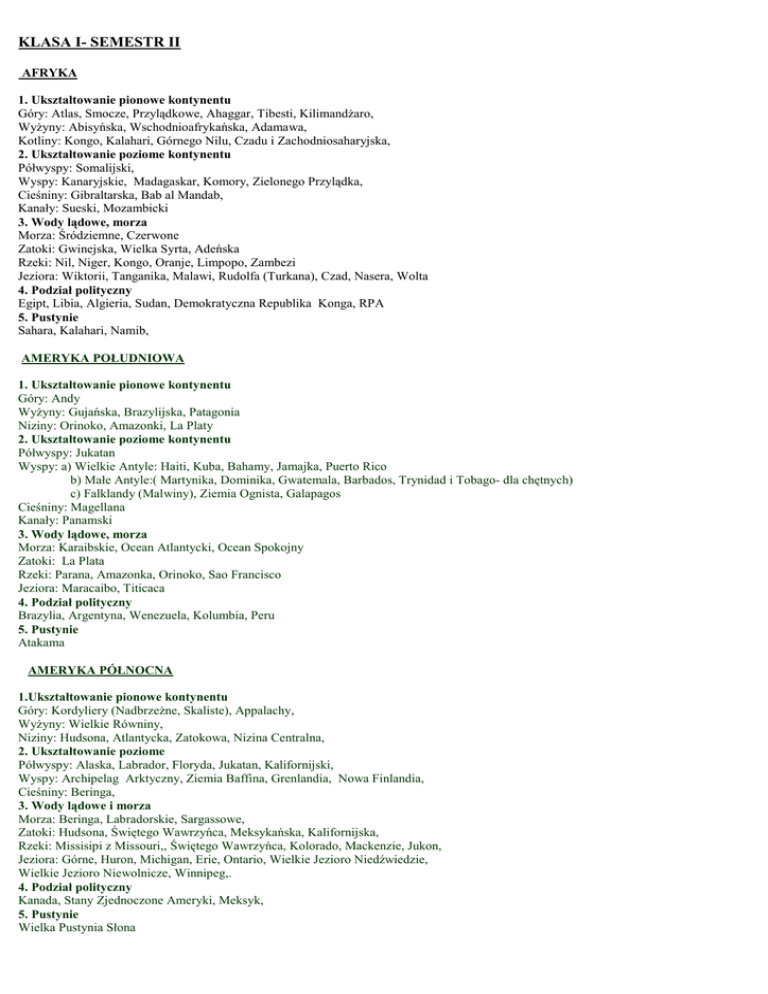 KLASA I- SEMESTR II AFRYKA 1. Ukształtowanie pionowe kontynentu Góry: Atlas, Smocze, Przylądkowe, Ahaggar, Tibesti, Kilimandżaro, Wyżyny: Abisyńska, Wschodnioafrykańska, Adamawa, Kotliny: Kongo, Kalahari, Górnego Nilu, Czadu i Zachodniosaharyjska, 2. Ukształtowanie poziome kontynentu Półwyspy: Somalijski, Wyspy: Kanaryjskie, Madagaskar, Komory, Zielonego Przylądka, Cieśniny: Gibraltarska, Bab al Mandab, Kanały: Sueski, Mozambicki 3. Wody lądowe, morza Morza: Śródziemne, Czerwone Zatoki: Gwinejska, Wielka Syrta, Adeńska Rzeki: Nil, Niger, Kongo, Oranje, Limpopo, Zambezi Jeziora: Wiktorii, Tanganika, Malawi, Rudolfa (Turkana), Czad, Nasera, Wolta 4. Podział polityczny Egipt, Libia, Algieria, Sudan, Demokratyczna Republika Konga, RPA 5. Pustynie Sahara, Kalahari, Namib, AMERYKA POŁUDNIOWA 1. Ukształtowanie pionowe kontynentu Góry: Andy Wyżyny: Gujańska, Brazylijska, Patagonia Niziny: Orinoko, Amazonki, La Platy 2. Ukształtowanie poziome kontynentu Półwyspy: Jukatan Wyspy: a) Wielkie Antyle: Haiti, Kuba, Bahamy, Jamajka, Puerto Rico b) Małe Antyle:( Martynika, Dominika, Gwatemala, Barbados, Trynidad i Tobago- dla chętnych) c) Falklandy (Malwiny), Ziemia Ognista, Galapagos Cieśniny: Magellana Kanały: Panamski 3. Wody lądowe, morza Morza: Karaibskie, Ocean Atlantycki, Ocean Spokojny Zatoki: La Plata Rzeki: Parana, Amazonka, Orinoko, Sao Francisco Jeziora: Maracaibo, Titicaca 4. Podział polityczny Brazylia, Argentyna, Wenezuela, Kolumbia, Peru 5. Pustynie Atakama AMERYKA PÓŁNOCNA 1.Ukształtowanie pionowe kontynentu Góry: Kordyliery (Nadbrzeżne, Skaliste), Appalachy, Wyżyny: Wielkie Równiny, Niziny: Hudsona, Atlantycka, Zatokowa, Nizina Centralna, 2. Ukształtowanie poziome Półwyspy: Alaska, Labrador, Floryda, Jukatan, Kalifornijski, Wyspy: Archipelag Arktyczny, Ziemia Baffina, Grenlandia, Nowa Finlandia, Cieśniny: Beringa, 3. Wody lądowe i morza Morza: Beringa, Labradorskie, Sargassowe, Zatoki: Hudsona, Świętego Wawrzyńca, Meksykańska, Kalifornijska, Rzeki: Missisipi z Missouri,, Świętego Wawrzyńca, Kolorado, Mackenzie, Jukon, Jeziora: Górne, Huron, Michigan, Erie, Ontario, Wielkie Jezioro Niedźwiedzie, Wielkie Jezioro Niewolnicze, Winnipeg,. 4. Podział polityczny Kanada, Stany Zjednoczone Ameryki, Meksyk, 5. Pustynie Wielka Pustynia Słona AUSTRALIA 1.Ukształtowanie pionowe kontynentu Góry: Wielkie Góry Wododziałowe, Wyżyny: Wyżyna Zachodnia, Kimberley, Niziny: Wielki Basen Australijski, 2. Ukształtowanie poziome Półwyspy: Jork, Ziemia Arnhema, Wyspy: Nowa Gwinea, Nowa Kaledonia, Nowa Zelandia, Tasmania, 3. Wody lądowe i morza Morza: Koralowe, Tasmana, Zatoki: Karpentaria, Wielka Zatoka Australijska, Rzeki: Murray i Darling, Jeziora: Eyre, 4. Podział polityczny Australia, Nowa Zelandia, Papua- Nowa Gwinea, Indonezja, 5. Pustynie Wielka Pustynia Piaszczysta, Wielka Pustynia Wiktorii, Gibsona,