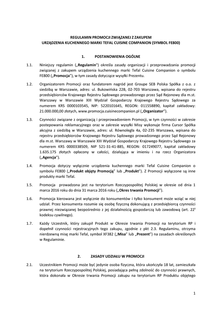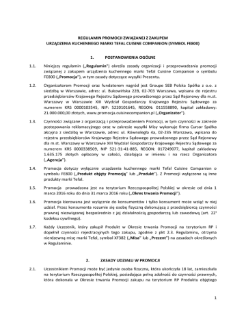 REGULAMIN PROMOCJI ZWIĄZANEJ Z ZAKUPEM URZĄDZENIA KUCHENNEGO MARKI TEFAL CUISINE COMPANION (SYMBOL FE800) 1. POSTANOWIENIA OGÓLNE 1.1. Niniejszy regulamin („Regulamin") określa zasady organizacji i przeprowadzania promocji związanej z zakupem urządzenia kuchennego marki Tefal Cuisine Companion o symbolu FE800 („Promocja”), w tym zasady dotyczące wysyłki Prezentu. 1.2. Organizatorem Promocji oraz fundatorem nagród jest Groupe SEB Polska Spółka z o.o. z siedzibą w Warszawie, adres: ul. Bukowińska 22B, 02-703 Warszawa, wpisana do rejestru przedsiębiorców Krajowego Rejestru Sądowego prowadzonego przez Sąd Rejonowy dla m.st. Warszawy w Warszawie XIII Wydział Gospodarczy Krajowego Rejestru Sądowego za numerem KRS 0000103545, NIP: 5220101645, REGON: 011558890, kapitał zakładowy: 21.000.000,00 złotych, www.promocja.cuisinecompanion.pl („Organizator”). 1.3. Czynności związane z organizacją i przeprowadzeniem Promocji, w tym czynności w zakresie postepowania reklamacyjnego oraz w zakresie wysyłki Misy wykonuje firma Cursor Spółka akcyjna z siedzibą w Warszawie, adres: ul. Równoległa 4a, 02-235 Warszawa, wpisana do rejestru przedsiębiorców Krajowego Rejestru Sądowego prowadzonego przez Sąd Rejonowy dla m.st. Warszawy w Warszawie XIII Wydział Gospodarczy Krajowego Rejestru Sądowego za numerem KRS 0000338509, NIP 521-31-41-885, REGON: 017249077, kapitał zakładowy 1.635.175 złotych opłacony w całości, działająca w imieniu i na rzecz Organizatora („Agencja”). 1.4. Promocja dotyczy wyłącznie urządzenia kuchennego marki Tefal Cuisine Companion o symbolu FE800 („Produkt objęty Promocją” lub „Produkt”). Z Promocji wyłączone są inne produkty marki Tefal. 1.5. Promocja prowadzona jest na terytorium Rzeczypospolitej Polskiej w okresie od dnia 1 marca 2016 roku do dnia 31 marca 2016 roku („Okres trwania Promocji”). 1.6. Promocja kierowana jest wyłącznie do konsumentów i tylko konsument może wziąć w niej udział. Przez konsumenta rozumie się osobę fizyczną dokonującą z przedsiębiorcą czynności prawnej niezwiązanej bezpośrednio z jej działalnością gospodarczą lub zawodową (art. 22¹ kodeksu cywilnego). 1.7. Każdy Uczestnik, który zakupił Produkt w Okresie trwania Promocji na terytorium RP i dopełnił czynności rejestracyjnych tego zakupu, zgodnie z pkt 2.3. Regulaminu, otrzyma nierdzewną misę marki Tefal, symbol XF382 („Misa” lub „Prezent”) na zasadach określonych w Regulaminie. 2. 2.1. ZASADY UDZIAŁU W PROMOCJI Uczestnikiem Promocji może być jedynie osoba fizyczna, która ukończyła 18 lat, zamieszkała na terytorium Rzeczypospolitej Polskiej, posiadająca pełną zdolność do czynności prawnych, która dokonała w Okresie trwania Promocji zakupu na terytorium RP Produktu objętego 1 Promocją jako konsument w rozumieniu art. 22¹ kodeksu cywilnego, a więc nie w związku z jej działalnością gospodarczą lub zawodową. 2.2. Warunkiem otrzymania Misy jest zakup Produktu w Okresie objętym Promocją na terytorium RP oraz dopełnienie czynności rejestracyjnych tego zakupu, zgodnie z pkt 2.3. Regulaminu. Uczestnik powinien zachować oryginał dowodu zakupu Produktu do czasu upływu okresu, o którym mowa w pkt 4.4. Regulaminu. Organizator ma prawo zwrócić się do Uczestnika o przesłanie oryginału zakupu Produktu w przypadku powzięcia wątpliwości co do autentyczności (wiarygodności) przedstawionej kopii dowodu zakupu Produktu, w celu weryfikacji autentyczności (wiarygodności) przesłanej kopii dowodu zakupu Produktu z oryginalnym dowodem zakupu Produktu. Po zweryfikowaniu autentyczności (wiarygodności) dowodu zakupu, Organizator odeśle Uczestnikowi listem oryginał dowodu zakupu Produktu. 2.3. W celu otrzymania Misy Uczestnik Promocji powinien dokonać rejestracji zakupu Produktu w Okresie trwania Promocji na stronie www.promocja.cuisinecompanion.pl, wypełniając elektroniczny formularz rejestracyjny udostępniony na tej stronie („Formularz Rejestracyjny”), poprzez: a) podanie: imienia, nazwiska, adresu e-mail, numeru telefonu, adresu zamieszkania, b) akceptację treści regulaminu Promocji, złożenie zgody na przetwarzanie danych osobowych w celu organizacji i przeprowadzenia Promocji, w tym wysyłki Misy oraz złożenia oświadczenia, że Produkt nie został nabyty w związku z prowadzoną działalnością gospodarczą lub zawodową; b) załączenie do Formularza Rejestracyjnego kopii dowodu zakupu Produktu, albo podanie numeru zamówienia, jeśli Produkt został zakupiony za pośrednictwem strony www. cuisinecompanion.tefal.pl; e) wysłanie prawidłowo wypełnionego Formularza Rejestracyjnego drogą elektroniczną, naciskając przycisk „wyślij” widoczny pod Formularzem Rejestracyjnym. 2.4. Podczas rejestracji Uczestnik zobowiązany jest podać swoje prawdziwe dane osobowe. 2.5. Po otrzymaniu przez Organizatora Formularza Rejestracyjnego w systemie informatycznym na adres e-mail podany w Formularzu Rejestracyjnym, Organizator wysyła do Uczestnika informację o przyjętym poprawnie Formularzu Rejestracyjnym. 2.6. Uczestnictwo w Promocji jest dobrowolne i nieodpłatne. 2.7. Uczestnictwo w Promocji nie wyłącza możliwości brania udziału w innych promocjach organizowanych przez Organizatora w okresie trwania Promocji dotyczących Produktu. 3. WYSYŁKA MISY, PODATKI 3.1. Każdemu Uczestnikowi, który zakupił Produkt w Okresie trwania Promocji na terytorium Polski i dopełnił czynności rejestracyjnych tego zakupu, o których mowa w pkt 2.3. Regulaminu, przysługuje prawo do otrzymania Misy. 3.2. Misa zostanie wysłana na dane adresowe Uczestnika, podane przez Uczestnika w Formularzu Rejestracyjnym, za pośrednictwem firmy kurierskiej – najpóźniej w terminie 30 dni od dnia wysłania Organizatorowi Formularza Rejestracyjnego. Agencja poinformuje Uczestnika o terminie przekazania kurierowi Misy na adres email wskazany przez Uczestnika w Formularzu Rejestracyjnym
