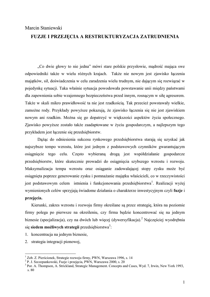 Marcin Staniewski FUZJE I PRZEJĘCIA A RESTRUKTURYZACJA ZATRUDNIENIA „Co dwie głowy to nie jedna” mówi stare polskie przysłowie, mądrość mająca swe odpowiedniki także w wielu różnych krajach. Także nie nowym jest zjawisko łączenia majątków, sił, doświadczenia w celu zaradzenia wielu trudnym, nie dającym się rozwiązać w pojedynkę sytuacji. Taka właśnie sytuacja powodowała powstawanie unii między państwami dla zapewnienia sobie wzajemnego bezpieczeństwa przed innym, rosnącym w siłę agresorem. Także w skali mikro prawidłowość ta nie jest rzadkością. Tak przecież powstawały wielkie, zamożne rody. Przykłady powyższe pokazują, że zjawisko łączenia się nie jest zjawiskiem nowym ani rzadkim. Można się go dopatrzyć w większości aspektów życia społecznego. Zjawisko powyższe zostało także zaadaptowane w życiu gospodarczym, a najlepszym tego przykładem jest łączenie się przedsiębiorstw. Dążąc do odniesienia sukcesu rynkowego przedsiębiorstwa starają się uzyskać jak najszybsze tempo wzrostu, które jest jednym z podstawowych czynników gwarantującym osiągnięcie tego celu. Często wybieraną drogą jest współdziałanie gospodarcze przedsiębiorstw, które skutecznie prowadzi do osiągnięcia szybszego wzrostu i rozwoju. Maksymalizacja tempa wzrostu oraz osiąganie zadowalającej stopy zysku może być osiągnięta poprzez generowanie zysku i pomnażanie majątku właścicieli, co w rzeczywistości jest podstawowym celem istnienia i funkcjonowania przedsiębiorstwa1. Realizacji wyżej wymienionych celów sprzyjają świadome działania o charakterze inwestycyjnym czyli fuzje i przejęcia. Kierunki, zakres wzrostu i rozwoju firmy określane są przez strategię, która na poziomie firmy polega po pierwsze na określeniu, czy firma będzie koncentrować się na jednym biznesie (specjalizacja), czy na dwóch lub więcej (dywersyfikacja).2 Najczęściej wyodrębnia się siedem możliwych strategii przedsiębiorstwa3: 1. koncentracja na jednym biznesie, 2. strategia integracji pionowej, 1 Zob. Z. Pierścionek, Strategie rozwoju firmy, PWN, Warszawa 1996, s. 14 P. J. Szczepankowski, Fuzje i przejęcia, PWN, Warszawa 2000, s. 20 3 Por. A. Thompson, A. Strickland, Strategic Management. Concepts and Cases, Wyd. 7, Irwin, New York 1993, s. 80 2 1 3. strategia dywersyfikacji pokrewnej, 4. strategia dywersyfikacji konglomeratowej (niepokrewnej), 5. strategia redukcji, 6. strategia wyjścia i likwidacji, 7. strategia mieszana. Decydując się na jeden z ww. wyborów przedsiębiorstwo podejmuje decyzję czy będzie dążyć do zachowania swojej pozycji w stanie niezmienionym, czy też będzie dążyć do aktywnego wzrostu i rozwoju lub przeciwnie, wycofania i rezygnacji z dotychczasowej działalności. Istnieje także możliwość występowania strategii kombinowanych, zawierających elementy różnych makrostrategii, stosowanych w odniesieniu do konkretnych rynków czy biznesów. Fuzje i przejęcia są doskonałymi sposobami realizacji strategii wzrostu i rozwoju. Nie są one klasycznymi strategiami, gdyż nie zawierają jednocześnie określenia celów oraz sposobów ich osiągnięcia, lecz są wyrazem realizacji strategii drogą wyjścia poza dotychczasowe struktury przedsiębiorstwa4. Rozwój jest zazwyczaj zjawiskiem jakościowym, a polega na wprowadzeniu innowacji produktowych, procesowych, strukturalnych oraz innowacji w dziedzinie organizacji i zarządzania. Natomiast wzrost stanowi kategorię ilościową, tzn. powiększenie ilości zapasów, zwiększenie skali działania, wzrostu lub utrzymania udziału w rynku oraz dywersyfikacji struktury działalności.5 W przypadku omawianych procesów zawsze jako pierwszy występuje wzrost firmy (powiększenie jej rozmiarów), a dopiero jako drugi występuje rozwój. Fuzje, o których mowa to nic innego jak łączenie się przedsiębiorstw. Jest to jedna z form współpracy miedzy aktualnymi lub potencjalnymi konkurentami oraz dostawcami i klientami, którzy zdecydowali się wspólnie prowadzić jakieś przedsięwzięcie lub rodzaj działalności, integrując i łącząc swoje zasoby oraz umiejętności. Fuzja ma miejsce wtedy, gdy dwa (lub więcej) przedsiębiorstwa, początkowo autonomiczne, w wyniku umowy łączą się tworząc nową spółkę6. Wówczas każde z przedsiębiorstw traci przy tym dotychczasową odrębność i osobowość. Cechą fuzji jest zasadniczo zgodne, dobrowolne działanie partnerów, najczęściej podobnych pod względem wielkości. Akcjonariusze (udziałowcy) łączących się firm otrzymują w zamian za posiadane do tej pory akcje (udziały) obydwu spółek akcje (udziały) 4 P.J. Szczepankowski, Fuzje..., op. cit., s. 21 Zob. szerzej. Z. Pierścionek, Strategie..., op. cit., ss. 15-16 6 P. J. Szczepankowski, Fuzje..., op. cit., s. 53 5 2 nowo utworzonego przedsiębiorstwa. Do przytoczonej definicji fuzji rezerwuje się pojęcie konsolidacji, czyli połączenia albo zespolenia dwóch (lub więcej) przedsiębiorstw, przy czym łączone jednostki ulegają likwidacji (wypisowi z rejestru handlowego), a na ich miejsce powstaje nowa firma i nowy podmiot prawny; (A + B = C). W literaturze przedmiotu można także odnaleźć inne podejście do fuzji, jako połączenia dwóch (lub więcej) przedsiębiorstw w jedno, przy czym tylko przedsiębiorstwo–nabywca zachowuje tożsamość (firmę) i podmiotowość (osobowość prawną)7 – proces taki określany jest inaczej mianem inkorporacji lub wcieleniem8; (A + B = A). Fuzja powstaje zazwyczaj wtedy, gdy słabnie rywalizacja przedsiębiorstw a wzmacnia się współpraca. Za przejęcie natomiast uznaje się zdobycie kontroli przez firmę (najczęściej silniejszą ekonomicznie) nad inną firmą poprzez nabycie jej akcji (udziałów) w liczbie wystarczającej do kontroli i zarządzania (pakiet kontrolny). Dotychczasowi akcjonariusze (udziałowcy) nabytej firmy tracą niezależność na rzecz kontroli kapitałowej objętej pr