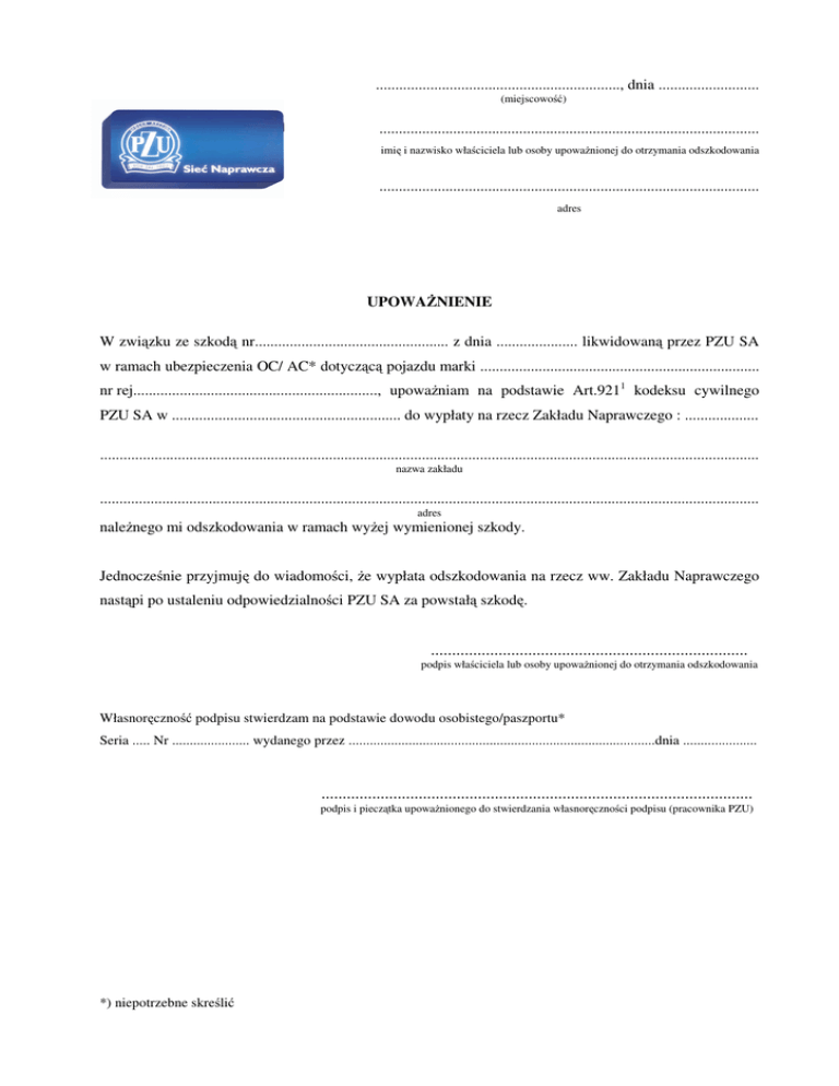 ..............................................................., dnia .......................... (miejscowość) .................................................................................................. imię i nazwisko właściciela lub osoby upoważnionej do otrzymania odszkodowania .................................................................................................. adres UPOWAŻNIENIE W związku ze szkodą nr.................................................. z dnia ..................... likwidowaną przez PZU SA w ramach ubezpieczenia OC/ AC* dotyczącą pojazdu marki ........................................................................ nr rej..............................................................., upoważniam na podstawie Art.9211 kodeksu cywilnego PZU SA w ........................................................... do wypłaty na rzecz Zakładu Naprawczego : ................... .......................................................................................................................................................................... nazwa zakładu .......................................................................................................................................................................... adres należnego mi odszkodowania w ramach wyżej wymienionej szkody. Jednocześnie przyjmuję do wiadomości, że wypłata odszkodowania na rzecz ww. Zakładu Naprawczego nastąpi po ustaleniu odpowiedzialności PZU SA za powstałą szkodę. ........................................................................... podpis właściciela lub osoby upoważnionej do otrzymania odszkodowania Własnoręczność podpisu stwierdzam na podstawie dowodu osobistego/paszportu* Seria ..... Nr ...................... wydanego przez .......................................................................................dnia ..................... ...................................................................................................... podpis i pieczątka upoważnionego do stwierdzania własnoręczności podpisu (pracownika PZU) *) niepotrzebne skreślić