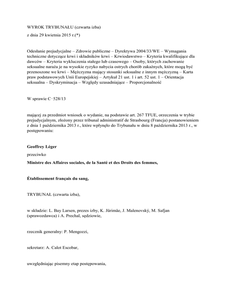 WYROK TRYBUNAŁU (czwarta izba) z dnia 29 kwietnia 2015 r.(*) Odesłanie prejudycjalne – Zdrowie publiczne – Dyrektywa 2004/33/WE – Wymagania techniczne dotyczące krwi i składników krwi – Krwiodawstwo – Kryteria kwalifikujące dla dawców – Kryteria wykluczenia stałego lub czasowego – Osoby, których zachowanie seksualne naraża je na wysokie ryzyko nabycia ostrych chorób zakaźnych, które mogą być przenoszone we krwi – Mężczyzna mający stosunki seksualne z innym mężczyzną – Karta praw podstawowych Unii Europejskiej – Artykuł 21 ust. 1 i art. 52 ust. 1 – Orientacja seksualna – Dyskryminacja – Względy uzasadniające – Proporcjonalność W sprawie C‑528/13 mającej za przedmiot wniosek o wydanie, na podstawie art. 267 TFUE, orzeczenia w trybie prejudycjalnym, złożony przez tribunal administratif de Strasbourg (Francja) postanowieniem z dnia 1 października 2013 r., które wpłynęło do Trybunału w dniu 8 października 2013 r., w postępowaniu: Geoffrey Léger przeciwko Ministre des Affaires sociales, de la Santé et des Droits des femmes, Établissement français du sang, TRYBUNAŁ (czwarta izba), w składzie: L. Bay Larsen, prezes izby, K. Jürimäe, J. Malenovský, M. Safjan (sprawozdawca) i A. Prechal, sędziowie, rzecznik generalny: P. Mengozzi, sekretarz: A. Calot Escobar, uwzględniając pisemny etap postępowania, rozważywszy uwagi przedstawione: – w imieniu rządu francuskiego przez D. Colasa oraz F. Gloaguen, działających w charakterze pełnomocników, – w imieniu Komisji Europejskiej przez C. Gheorghiu oraz M. Owsiany-Hornung, działające w charakterze pełnomocników, po zapoznaniu się z opinią rzecznika generalnego na posiedzeniu w dniu 17 lipca 2014 r., wydaje następujący Wyrok 1 Wniosek o wydanie orzeczenia w trybie prejudycjalnym dotyczy wykładni pkt 2.1 załącznika III do dyrektywy Komisji 2004/33/WE z dnia 22 marca 2004 r. wykonującej dyrektywę 2002/98/WE Parlamentu Europejskiego i Rady w zakresie niektórych wymagań technicznych dotyczących krwi i składników krwi (Dz.U. L 91, s. 25 – wyd. spec. w jęz. polskim, rozdz. 15, t. 8, s. 272). 2 Niniejszy wniosek został złożony w ramach sporu pomiędzy G. Légerem a ministre des Affaires sociales, de la Santé et des Droits des femmes (ministrem do spraw społecznych, zdrowia i praw kobiet) oraz Établissement français du sang (francuskim centrum krwiodawstwa) w przedmiocie odmowy zakwalifikowania G. Légera jako dawcy krwi ze względu na to, że odbył on stosunek seksualny z mężczyzną. Ramy prawne Prawo Unii Dyrektywa 2002/98/WE 3 Podstawą dyrektywy 2002/98/WE Parlamentu Europejskiego i Rady z dnia 27 stycznia 2003 r. ustanawiającej normy jakości i bezpiecznego pobierania, testowania, przetwarzania, przechowywania i dystrybucji krwi ludzkiej i składników krwi oraz zmieniającej dyrektywę 2001/83/WE (Dz.U. L 33, s. 30 – wyd. spec. w jęz. polskim, rozdz. 15, t. 7, s. 346) jest art. 152 ust. 4 lit. a) WE. 4 Zgodnie z motywami 1, 2, 24 i 29 dyrektywy 2002/98: „(1) Zakres wykorzystywania krwi ludzkiej w celach leczniczych wymaga zapewnienia jakości i bezpiecznego stosowania pełnej krwi i składników krwi w celu ochrony zdrowia, w szczególności przed przenoszeniem chorób. (2) Dostępność krwi i składników krwi wykorzystywanych w celach leczniczych w dużej mierze zależy od gotowości obywateli Wspólnoty do jej oddawania. W celu ochrony zdrowia publicznego i zapobiegania przenoszeniu chorób zakaźnych należy podjąć wszelkie środki ostrożności podczas jej pobierania, przetwarzania, dystrybucji i stosowania z właściwym wykorzystaniem postępów nauki w wykrywaniu, inaktywacji i eliminowaniu przenoszonych w trakcie transfuzji czynników chorobotwórczych. […] (24) Krew i składniki krwi stosowane do celów leczniczych i do wytwarzania wyrobów medycznych należy pozyskiwać od osób, których stan zdrowia wskazuje, że w wyniku pobrania nie wystąpią skutki szkodliwe dla ich zdrowia oraz że zminimalizowano wszelkie ryzyko przeniesienia chorób zakaźnych; każdą pobraną krew należy przetestować zgodnie z zasadami zapewniającymi, że podjęto wszystkie niezbędne środki ochrony zdrowia osób, które zostaną biorcami krwi i [lub] składników krwi. […] (29) Testy należy przeprowadzać w zgodności z [zgodnie z] najnowszymi procedurami naukowymi i technicznymi, odzwierciedlającymi określaną obecnie jako najlepszą praktykę w tej dziedzinie oraz – regularnie rewidowane i uaktualniane – odpowiednie konsultacje specjalistyczne. W tym procesie rewizji należy też bezwarunkowo uwzględniać postępy naukowe w wykrywaniu, inaktywacji i eliminowaniu czynników chorobotwórczych, które mogą być przenoszone w procesie transfuzji krwi”. 5 Artykuł 1 wspomnianej dyrektywy stanowi: „Niniejsza dyrektywa ustanawia normy jakości i bezpieczeństwa dla ludzkiej krwi i składników krwi w celu zapewnienia wysokiego poziomu ochrony zdrowia ludzkiego”. 6 Artykuł 2 ust. 1 tej dyrektywy przewiduje: „Niniejsza dyrektywa stosuje się do pobierania i testowania krwi ludzkiej i składników krwi, niezależnie od ich przeznaczenia oraz od [do] ich przetwarzania, przechowywania i dystrybucji, jeśli przeznaczona jest [przeznaczone są] do transfuzji”. 7 Artykuł 18 dyrektywy 2002/98, zatytułowany „Kwalifikowanie dawców”, ma następujące brzmienie: „1. Zakłady krwiodawstwa zapewniają, że istnieją procedury oceny dla wszystkich dawców krwi i składników krwi oraz że spełniają [spełnione są] kryteria krwiodawstwa określone w art. 29 lit. d). 2. Wyniki oceny krwiodawcy i procedury badania zostają [zostaną] udokumentowane, a wszelkie odnośne wyniki badań odbiegające od normy zostaną zgłoszone krwiodawcy”. 8 Artykuł 19 wspomnianej dyrektywy, zatytułowany „Badanie krwiodawców”, stanowi: „Badanie dawcy, w tym wywiad, przeprowadza się przed każdym oddaniem krwi lub składników krwi. Wykwa