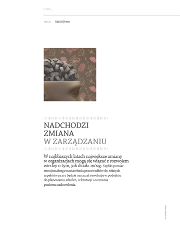 xxx _ TEKST> Rafał Ohme nadchodzi zmiana w zarządzaniu W najbliższych latach największe zmiany w organizacjach mogą się wiązać z rozwojem wiedzy o tym, jak działa mózg. Szybki pomiar FOT.: Jupiter images emocjonalnego nastawienia pracowników do różnych aspektów pracy będzie oznaczał rewolucję w podejściu do planowania szkoleń, rekrutacji i oceniania poziomu zadowolenia. 58 _ 59 firma W 2002 r. psycholog Daniel Kahneman otrzymał Nagrodę Nobla w dziedzinie ekonomii za zastosowanie badań psychologicznych w analizie ekonomicznej. Ustalił, że procesy decyzyjne są zarządzane przez dwa systemy myślenia: szybki (emocjonalny) oraz wolniejszy (racjonalny). Oznacza to, że najpierw czujemy, potem działamy, a dopiero na końcu szukamy uzasadnienia lub usprawiedliwienia dla własnego zachowania. Wcześniej uważaliśmy, że zgodnie ze swoją gatunkową nazwą człowiek najpierw się namyśla, a dopiero potem działa. Inne stanowisko przyjmuje neuronauka, stosunkowo nowa dyscyplina zajmująca się analizą pracy mózgu w sytuacjach społecznych. Według niej określenie Homo sapiens otrzymaliśmy nieco na wyrost. Podstawą procesów przetwarzania informacji są emocje, a nie logika. Kartezjańskie cogito ergo sum winno być zamienione na „czuję, więc jestem”. Jakieś spektakularne wydarzenie wkrótce sprawi, że Daniel Kahneman będzie tak powszechnie rozpoznawany jak Albert Einstein (ten czekał na sławę dobrych kilkanaście lat). Wtedy opinia publiczna i osoby zarządzające organizacjami uświadomią sobie, że zakończyła się era ekonomii klasycznej, a rozpoczęła się – nowoczesna. Taka, która byłaby w stanie wytłumaczyć (zawczasu, nie po fakcie) recesję, z której wciąż wiele państw nie może się wydobyć. Albo przewidzieć, że pracownik odrzuci opłacalną ofertę, bo rządzi nim emocja, która każe mu zoptymalizować zyski na swój (subiektywny, a nie obiektywny) sposób. Nobel z 2002 r. dowodzi, że akademicy wiedzą już, jak ważne są emocje dla rynku i gospodarki. Nadchodzi czas, aby biznes tę wiedzę wprowadził w swoje DNA. Nowy wymiar zarządzania Emocje wkroczyły do świata „poważnej” nauki dopiero pod koniec ubiegłego wieku. W podręcznikach psychologii jeszcze z lat 80. emocje zajmują śladowe miejsce i są często przedstawiane jako… zakłócenie w procesach przetwarzania informacji. „Im mniej pasji, tym więcej rozumu” – powtarzaliśmy wszyscy po Arystotelesie. W W W. m t t p. P L 24 _ 2015 Prowadzone współcześnie badania genetyczne pokazują, że mózg oryginalnie został stworzony nie do myślenia, ale do odczuwania. Uczucia towarzyszą naszym przodkom od 5 mln lat, a zdolność do abstrakcyjnego myślenia posiedliśmy 250 tys. lat temu. Odkrycia neuronauki spowodowały, że w biznesie emocjonalnością człowieka zainteresował się w pierwszej kolejności sektor reklamowy. Agencje i działy marketingu jako pierwsze pojęły jak dużo zyskają, jeśli sprawią, że konsument pokocha kreowaną przez nich markę (pisaliśmy o tym w: R Ohme, M. Matukin, D. Wolińska „Neurobadania: w głąb umysłu konsumenta”; www.thinktankmagazin.pl, R1109F05, 09.2011). Dzisiaj pojawia się drugi obszar, na którym odkrycia neuronauki odcisną swój znak – zarządzanie. Zarządzanie ludźmi przez pryzmat miękkich emocji i relacji stanie się normą, choć dziś brzmi to nieco egzotycznie. Stanie się tak dzięki postępującym badaniom nad neuronami lustrzanymi. Neurony te odkryto w połowie lat 90. Powodują, że jesteśmy zdolni odczuwać (a nie tylko odczytywać) emocje drugiego człowieka. Służą też przeczuwaniu cudzych intencji – czy ktoś nam sprzyja, czy chce nas skrzywdzić. Współczesna nauka dowiodła, że emocjonalność i intuicja to wynik aktywności znakomicie wyspecjalizowanych ośrodków mózgu, a przeczucie – efekt bezwiednego połączenia z drugim człowiekiem i odczytania jego intencji. EQ: umiejętność nowych czasów Empatia i rozwijanie inteligencji emocjonalnej to jedne z najważniejszych kompetencji liderów, menedżerów i pracowników przyszłości. Już dzisiaj trudno bez nich zarządzać, działać w zespole czy realizować projekty. Tyle że nikt nie kształci tych kompetencji profesjonalnie, czyli w systematyczny i zorganizowany sposób. Po prostu, albo się je ma, albo nie. Tymczasem już w niedalekiej przyszłości stworzony zostanie system nauczania i rozwijania zdolności do czytania i kształtowania relacji. Wszyscy będą pracowali nad tym, jak rozwijać neurony lustrzane, jak zwiększać i zmniejszać ich aktywność, tak aby szybko dostroić się do drugiej osoby. Główna myśl .Neurobadania rozwijają się w błyskawicznym tempie. Postęp w tej dziedzinie zmieni zarządzanie. .Wszyscy będziemy w przyszłości pracowali nad tym, jak rozwijać neurony lustrzane; jak zwiększać i zmniejszać ich aktywność, tak aby szybko dostroić się do drugiej osoby. xxx _ 1mlndol. Tyle wydała firma Starbucks na program szkoleniowy uczący pracowników nawyku samodyscypliny (przychodzenia na czas, nieirytowania się z powodu upomnień i obsługiwania wszystkich z uśmiechem). Źródło: Charles Duhigg, „Siła nawyku", PWN, Warszawa, 2013 Już niedługo pojawią się metody, za pomocą których błyskawicznie będzie można sprawdzić, czy np. nowo przyjmowany pracownik przystaje do danej kultury organizacyjnej, czy też stara się jedynie zrobić dobre wrażenie, ale w gruncie rzeczy wartości firmy są mu obojętne. Do działów sprzedaży będą poszukiwane osoby o odpowiednich parametrach neuronów lustrzanych – takich, które pozwolą sprzedawcy dopasowywać się do klienta i lepiej odpowiadać na jego potrzeby. Już dzisiaj istnieją metody do określenia, czy pracownicy są prawdziwie zadowoleni z atmosfery i warunków pracy. Jeśli wyniki są negatywne, to pracodawca może szybko zareagować i zaradzić problemowi, zanim przybierze na sile. Przypomina to profilaktykę ch