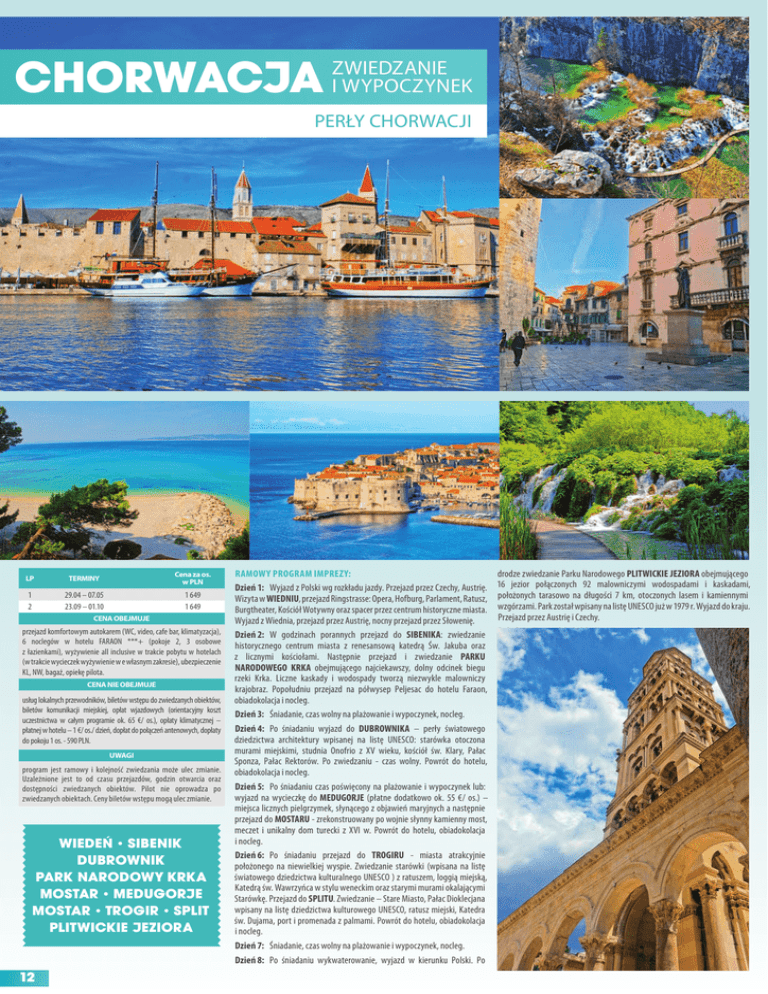 chorwacJa zwieDzanie i wypoczyneK perły chorwacji LP TERMINY Cena za os. w PLN 1 2 29.04 – 07.05 23.09 – 01.10 1 649 1 649 CENA OBEJMUJE przejazd komfortowym autokarem (Wc, video, cafe bar, klimatyzacja), 6 noclegów w hotelu faraon ***+ (pokoje 2, 3 osobowe z łazienkami), wyżywienie all inclusive w trakcie pobytu w hotelach (w trakcie wycieczek wyżywienie w e własnym zakresie), ubezpieczenie Kl, nW, bagaż, opiekę pilota. CENA NIE OBEJMUJE usług lokalnych przewodników, biletów wstępu do zwiedzanych obiektów, biletów komunikacji miejskiej, opłat wjazdowych (orientacyjny koszt uczestnictwa w całym programie ok. 65 €/ os.), opłaty klimatycznej – płatnej w hotelu – 1 €/ os./ dzień, dopłat do połączeń antenowych, dopłaty do pokoju 1 os. - 590 pln. UwAgI program jest ramowy i kolejność zwiedzania może ulec zmianie. uzależnione jest to od czasu przejazdów, godzin otwarcia oraz dostępności zwiedzanych obiektów. pilot nie oprowadza po zwiedzanych obiektach. ceny biletów wstępu mogą ulec zmianie. wiedeń sibenik dUbrownik park narodowy krka Mostar MedUgorJe Mostar trogir split plitwickie Jeziora 12 RAMoWY PRoGRAM IMPREZY: dzień 1: Wyjazd z polski wg rozkładu jazdy. przejazd przez czechy, austrię. Wizyta w WIEdnIu, przejazd ringstrasse: opera, hofburg, parlament, ratusz, Burgtheater, Kościół Wotywny oraz spacer przez centrum historyczne miasta. Wyjazd z Wiednia, przejazd przez austrię, nocny przejazd przez słowenię. dzień 2: W godzinach porannych przejazd do SIBEnIKA: zwiedzanie historycznego centrum miasta z renesansową katedrą Św. jakuba oraz z licznymi kościołami. następnie przejazd i zwiedzanie PARKu nARodoWEGo KRKA obejmującego najciekawszy, dolny odcinek biegu rzeki Krka. liczne kaskady i wodospady tworzą niezwykle malowniczy krajobraz. popołudniu przejazd na półwysep peljesac do hotelu faraon, obiadokolacja i nocleg. dzień 3: Śniadanie, czas wolny na plażowanie i wypoczynek, nocleg. dzień 4: po śniadaniu wyjazd do duBRoWnIKA – perły światowego dziedzictwa architektury wpisanej na listę unesco: starówka otoczona murami miejskimi, studnia onofrio z XV wieku, kościół św. Klary, pałac sponza, pałac rektorów. po zwiedzaniu - czas wolny. powrót do hotelu, obiadokolacja i nocleg. dzień 5: po śniadaniu czas poświęcony na plażowanie i wypoczynek lub: wyjazd na wycieczkę do MEduGoRJE (płatne dodatkowo ok. 55 €/ os.) – miejsca licznych pielgrzymek, słynącego z objawień maryjnych a następnie przejazd do MoStARu - zrekonstruowany po wojnie słynny kamienny most, meczet i unikalny dom turecki z XVi w. powrót do hotelu, obiadokolacja i nocleg. dzień 6: po śniadaniu przejazd do tRoGIRu - miasta atrakcyjnie położonego na niewielkiej wyspie. zwiedzanie starówki (wpisana na listę światowego dziedzictwa kulturalnego unesco ) z ratuszem, loggią miejską, Katedrą św. Wawrzyńca w stylu weneckim oraz starymi murami okalającymi starówkę. przejazd do SPLItu. zwiedzanie – stare miasto, pałac dioklecjana wpisany na listę dziedzictwa kulturowego unesco, ratusz miejski, Katedra św. dujama, port i promenada z palmami. powrót do hotelu, obiadokolacja i nocleg. dzień 7: Śniadanie, czas wolny na plażowanie i wypoczynek, nocleg. dzień 8: po śniadaniu wykwaterowanie, wyjazd w kierunku polski. po drodze zwiedzanie parku narodowego PLItWICKIE JEZIoRA obejmującego 16 jezior połączonych 92 malowniczymi wodospadami i kaskadami, położonych tarasowo na długości 7 km, otoczonych lasem i kamiennymi wzgórzami. park został wpisany na listę unesco już w 1979 r. Wyjazd do kraju. przejazd przez austrię i czechy. dzień 9: przyjazd do polski, Katowice – ok. 14:00.