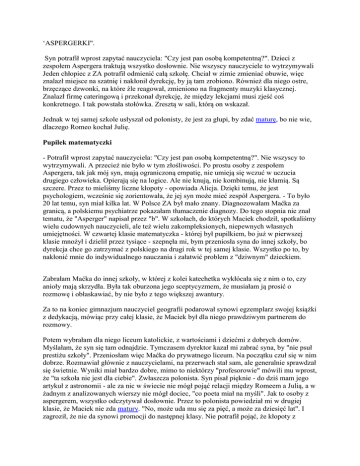 ‘ASPERGERKI". Syn potrafił wprost zapytać nauczyciela: "Czy jest pan osobą kompetentną?". Dzieci z zespołem Aspergera traktują wszystko dosłownie. Nie wszyscy nauczyciele to wytrzymywali Jeden chłopiec z ZA potrafił odmienić całą szkołę. Chciał w zimie zmieniać obuwie, więc znalazł miejsce na szatnię i nakłonił dyrekcję, by ją tam zrobiono. Również dla niego ostre, brzęczące dzwonki, na które źle reagował, zmieniono na fragmenty muzyki klasycznej. Znalazł firmę cateringową i przekonał dyrekcję, że między lekcjami musi zjeść coś konkretnego. I tak powstała stołówka. Zresztą w sali, którą on wskazał. Jednak w tej samej szkole usłyszał od polonisty, że jest za głupi, by zdać maturę, bo nie wie, dlaczego Romeo kochał Julię. Pupilek matematyczki - Potrafił wprost zapytać nauczyciela: "Czy jest pan osobą kompetentną?". Nie wszyscy to wytrzymywali. A przecież nie było w tym złośliwości. Po prostu osoby z zespołem Aspergera, tak jak mój syn, mają ograniczoną empatię, nie umieją się wczuć w uczucia drugiego człowieka. Opierają się na logice. Ale nie knują, nie kombinują, nie kłamią. Są szczere. Przez to mieliśmy liczne kłopoty - opowiada Alicja. Dzięki temu, że jest psychologiem, wcześnie się zorientowała, że jej syn może mieć zespół Aspergera. - To było 20 lat temu, syn miał kilka lat. W Polsce ZA był mało znany. Diagnozowałam Maćka za granicą, a polskiemu psychiatrze pokazałam tłumaczenie diagnozy. Do tego stopnia nie znał tematu, że "Asperger" napisał przez "b". W szkołach, do których Maciek chodził, spotkaliśmy wielu cudownych nauczycieli, ale też wielu zakompleksionych, niepewnych własnych umiejętności. W czwartej klasie matematyczka - której był pupilkiem, bo już w pierwszej klasie mnożył i dzielił przez tysiące - szepnęła mi, bym przeniosła syna do innej szkoły, bo dyrekcja chce go zatrzymać z polskiego na drugi rok w tej samej klasie. Wszystko po to, by nakłonić mnie do indywidualnego nauczania i załatwić problem z "dziwnym" dzieckiem. Zabrałam Maćka do innej szkoły, w której z kolei katechetka wykłócała się z nim o to, czy anioły mają skrzydła. Była tak oburzona jego sceptycyzmem, że musiałam ją prosić o rozmowę i obłaskawiać, by nie było z tego większej awantury. Za to na koniec gimnazjum nauczyciel geografii podarował synowi egzemplarz swojej książki z dedykacją, mówiąc przy całej klasie, że Maciek był dla niego prawdziwym partnerem do rozmowy. Potem wybrałam dla niego liceum katolickie, z wartościami i dziećmi z dobrych domów. Myślałam, że syn się tam odnajdzie. Tymczasem dyrektor kazał mi zabrać syna, by "nie psuł prestiżu szkoły". Przeniosłam więc Maćka do prywatnego liceum. Na początku czuł się w nim dobrze. Rozmawiał głównie z nauczycielami, na przerwach stał sam, ale generalnie sprawdzał się świetnie. Wyniki miał bardzo dobre, mimo to niektórzy "profesorowie" mówili mu wprost, że "ta szkoła nie jest dla ciebie". Zwłaszcza polonista. Syn pisał pięknie - do dziś mam jego artykuł z astronomii - ale za nic w świecie nie mógł pojąć relacji między Romeem a Julią, a w żadnym z analizowanych wierszy nie mógł dociec, "co poeta miał na myśli". Jak to osoby z aspergerem, wszystko odczytywał dosłownie. Przez to polonista powiedział mi w drugiej klasie, że Maciek nie zda matury. "No, może uda mu się za pięć, a może za dziesięć lat". I zagroził, że nie da synowi promocji do następnej klasy. Nie potrafił pojąć, że kłopoty z polskim nie wynikają z zaniedbania czy braku inteligencji, ale są charakterystyczne dla tego zaburzenia. To tak jakby zmuszać daltonistę do nazywania barw, choć pokazuje nam zaświadczenie, że nie rozróżnia kolorów. Ostatecznie Maciek zdał, ale musiałam obiecać, że przeniosę go do innej szkoły, bo ta obawiała się zaniżenia wyników w rankingu. Przeniosłam go więc po raz kolejny, tym razem do szkoły pod miastem. Tam wprowadzona w temat polonistka rozrysowała mu na kartonach epoki i najważniejsze motywy literackie. Po rozłożeniu wszystkie karty zajęły niemal całą salę gimnastyczną, ale syn chwycił w mig. Komentował potem: "Ale to proste! Dlaczego nikt mi tego wcześniej nie pokazał?". Dzięki tej nauczycielce uwierzył w siebie, a maturę z polskiego zdał na 100 proc.! Dziś ma już licencjat z geografii na Uniwersytecie Jagiellońskim i wybiera się na studia magisterskie. Dzieci, które nie lubią zmian Według szacunkowych danych fundacji Synapsis zaburzenia z kręgu autyzmu mogą dotyczyć 30 tys. osób w Polsce. - W krajach anglosaskich szacuje się, że jest to 15-25 na każde 10 tys. osób, więc w Polsce dawałoby to 57 tys. osób - mówi Marzena Dąbrowska. Od 25 lat pracuje jako terapeuta, od 20 lat z osobami z ZA. Poza tym na Uniwersytecie Jagiellońskim uczy przyszłych nauczycieli języka polskiego, jak postępować z dziećmi z dysfunkcjami. Zespół Aspergera to zaburzenie rozwoju mieszczące się w spektrum autyzmu, dotyka przede wszystkim zaburzeń sfery komunikacji. Z osobami z ZA czasem trudno się porozumieć przez echolalię, czyli powtarzanie bez potrzeby cudzych słów albo fragmentów wypowiedzi. Charakterystyczna jest też awersja do zmian, nawet najdrobniejszych, i chętne trzymanie się rytuałów. - Dla dziecka wycieczka zwykle jest atrakcją. Dla dziecka z zespołem Aspergera - nie, jeśli nie jest na nią przygotowane - opowiada Dąbrowska. - Każda zmiana jest stresem. Ale z tymi małymi, codziennymi stresami większość z nas dobrze sobie radzi, czasem nawet przestajemy je dostrzegać. Dzieci z ZA potrafią płakać, krzyczeć, czy nawet uderzyć, gdy na przykład mama zmieni drogę powrotu z przedszkola do domu. Dlatego terapeutka uczy rodziców, by trenowali dzieci w reagowaniu na sytuacje zmienne, np. wybierali inną drogę powrotu do domu, ale po wcześniejszym uprzedzeniu dziecka i 