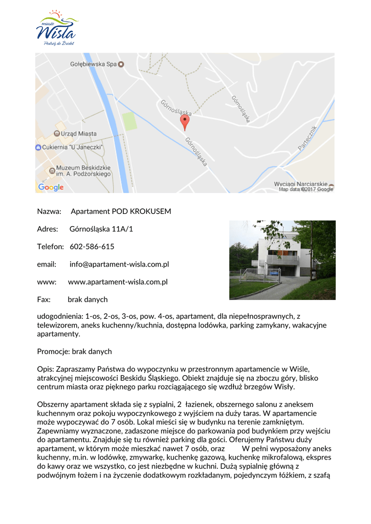 Nazwa: Apartament POD KROKUSEM Adres: Górnośląska 11A/1 Telefon: 602-586-615 email: [email protected] www: www.apartament-wisla.com.pl Fax: brak danych udogodnienia: 1-os, 2-os, 3-os, pow. 4-os, apartament, dla niepełnosprawnych, z telewizorem, aneks kuchenny/kuchnia, dostępna lodówka, parking zamykany, wakacyjne apartamenty. Promocje: brak danych Opis: Zapraszamy Państwa do wypoczynku w przestronnym apartamencie w Wiśle, atrakcyjnej miejscowości Beskidu Śląskiego. Obiekt znajduje się na zboczu góry, blisko centrum miasta oraz pięknego parku rozciągającego się wzdłuż brzegów Wisły. Obszerny apartament składa się z sypialni, 2 łazienek, obszernego salonu z aneksem kuchennym oraz pokoju wypoczynkowego z wyjściem na duży taras. W apartamencie może wypoczywać do 7 osób. Lokal mieści się w budynku na terenie zamkniętym. Zapewniamy wyznaczone, zadaszone miejsce do parkowania pod budynkiem przy wejściu do apartamentu. Znajduje się tu również parking dla gości. Oferujemy Państwu duży apartament, w którym może mieszkać nawet 7 osób, oraz W pełni wyposażony aneks kuchenny, m.in. w lodówkę, zmywarkę, kuchenkę gazową, kuchenkę mikrofalową, ekspres do kawy oraz we wszystko, co jest niezbędne w kuchni. Dużą sypialnię główną z podwójnym łożem i na życzenie dodatkowym rozkładanym, pojedynczym łóżkiem, z szafą i komodą oraz wyjściem na balkon, drugą sypialnię z dwoma pojedynczymi łóżkami i szafą. Ponadto w obu pokojach dziennych znajdują się dwie rozkładane kanapy. Dwie łazienki wyposażone w kabiny prysznicowe, umywalki, WC oraz suszarkę do włosów. Dwa balkony oraz duży taras. Obszerny salon z kominkiem, kompletem wypoczynkowym, TV SAT (Cyfra+), DVD. Pokój wypoczynkowy z wyjściem na duży taras, który jest wyposażony w meble ogrodowe. Apartament jest położony na nasłonecznionym, zazielenionym zboczu górskim. Z tarasów rozciąga się widok na panoramę gór i miasta. Świetne miejsce na wypoczynek oraz rekreację, np. piesze wycieczki i spacery w góry, zimą narty (w pobliżu jest kilka wyciągów). Niedaleko znajduje się kompleks Centralnego Ośrodka Sportów z basenami krytym i odkrytym nad brzegiem Wisły. Istnieje możliwość korzystania z parku wodnego w Hotelu Gołębiewski.
