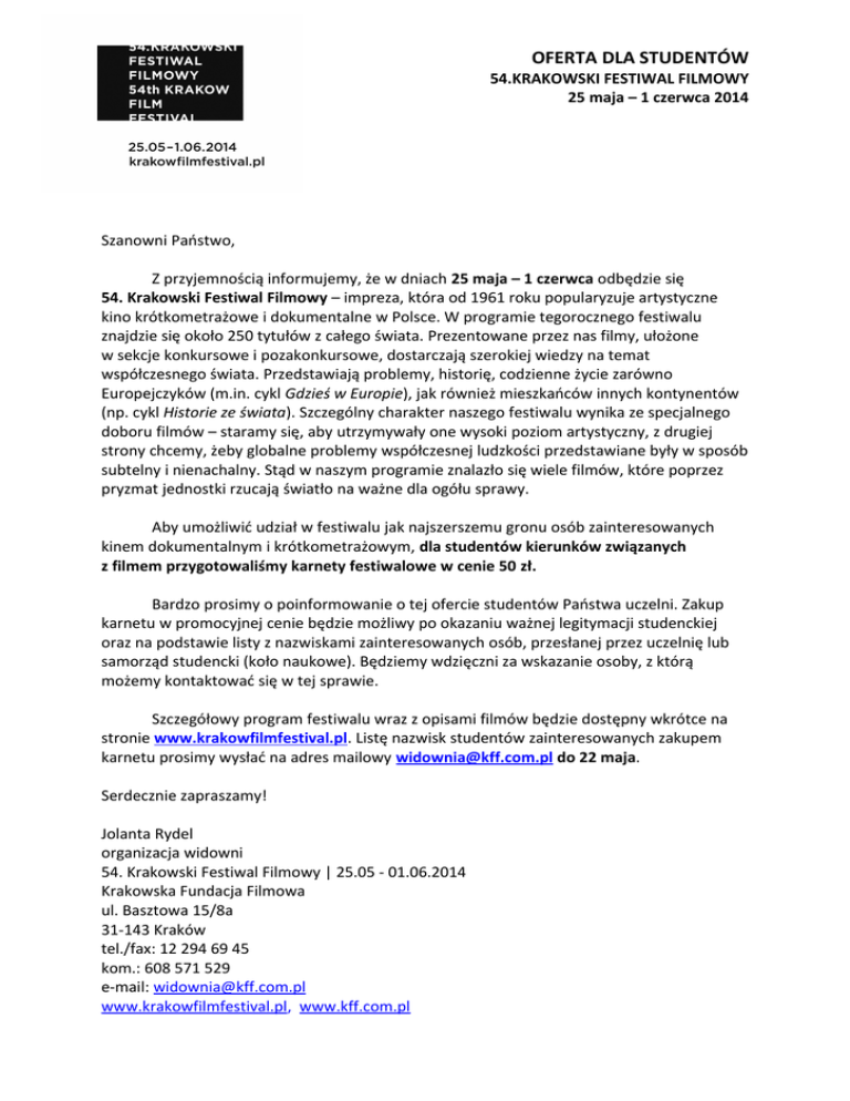 OFERTA DLA STUDENTÓW 54.KRAKOWSKI FESTIWAL FILMOWY 25 maja – 1 czerwca 2014 Szanowni Państwo, Z przyjemnością informujemy, że w dniach 25 maja – 1 czerwca odbędzie się 54. Krakowski Festiwal Filmowy – impreza, która od 1961 roku popularyzuje artystyczne kino krótkometrażowe i dokumentalne w Polsce. W programie tegorocznego festiwalu znajdzie się około 250 tytułów z całego świata. Prezentowane przez nas filmy, ułożone w sekcje konkursowe i pozakonkursowe, dostarczają szerokiej wiedzy na temat współczesnego świata. Przedstawiają problemy, historię, codzienne życie zarówno Europejczyków (m.in. cykl Gdzieś w Europie), jak również mieszkańców innych kontynentów (np. cykl Historie ze świata). Szczególny charakter naszego festiwalu wynika ze specjalnego doboru filmów – staramy się, aby utrzymywały one wysoki poziom artystyczny, z drugiej strony chcemy, żeby globalne problemy współczesnej ludzkości przedstawiane były w sposób subtelny i nienachalny. Stąd w naszym programie znalazło się wiele filmów, które poprzez pryzmat jednostki rzucają światło na ważne dla ogółu sprawy. Aby umożliwić udział w festiwalu jak najszerszemu gronu osób zainteresowanych kinem dokumentalnym i krótkometrażowym, dla studentów kierunków związanych z filmem przygotowaliśmy karnety festiwalowe w cenie 50 zł. Bardzo prosimy o poinformowanie o tej ofercie studentów Państwa uczelni. Zakup karnetu w promocyjnej cenie będzie możliwy po okazaniu ważnej legitymacji studenckiej oraz na podstawie listy z nazwiskami zainteresowanych osób, przesłanej przez uczelnię lub samorząd studencki (koło naukowe). Będziemy wdzięczni za wskazanie osoby, z którą możemy kontaktować się w tej sprawie. Szczegółowy program festiwalu wraz z opisami filmów będzie dostępny wkrótce na stronie www.krakowfilmfestival.pl. Listę nazwisk studentów zainteresowanych zakupem karnetu prosimy wysłać na adres mailowy [email protected] do 22 maja. Serdecznie zapraszamy! Jolanta Rydel organizacja widowni 54. Krakowski Festiwal Filmowy | 25.05 - 01.06.2014 Krakowska Fundacja Filmowa ul. Basztowa 15/8a 31-143 Kraków tel./fax: 12 294 69 45 kom.: 608 571 529 e-mail: [email protected] www.krakowfilmfestival.pl, www.kff.com.pl OFERTA DLA STUDENTÓW 54.KRAKOWSKI FESTIWAL FILMOWY 25 maja – 1 czerwca 2014 MIĘDZYNARODOWY KONKURS DocFilmMusic W rywalizacji o nagrodę Złotego Hejnału weźmie udział 10 nieznanych dotąd w Polsce tytułów, a wśród nich premiery światowe i międzynarodowe. Będą filmy o kultowych zjawiskach, jak żywiołowe flamenco najstarszej dzielnicy Sewilli (Pożegnanie z Trianą), kontestująca muzyka kubańskiej ulicy (Rap idzie na wojnę) i nieokrzesany punk z Wrocławia lat 80. (Za to że żyjemy czyli punk z Wrocka). Będą przejmujące obrazy samotności gwiazd: jednookiego nowoorleańskiego pianisty (James Booker – maharadża z Luizjany) i transseksualnej artystki z Kanady (Mój domek na prerii). Będzie głośny projekt Stanisławy Celińskiej, Bartka Wąsika i Royal String Quartet sfilmowany przez Bartka Konopkę (Nowa Warszawa). MIĘDZYNARODOWY KONKURS FILMÓW DOKUMENTALNYCH O nagrodę Złotego Rogu rywalizować będzie 20 premierowych filmów dokumentalnych. Wielka historia zderzy się z dramatami uwikłanych w nią bohaterów: tak znanych jak genialny bokser Cassius Clay odmawiający służby wojskowej i przechodzący na islam (Potyczki Muhammada Alego) i tak anonimowych jak syryjscy idealiści, którzy niespodziewanie dla nich samych stają się męczennikami (Powrót do Homs). Odwieczne marzenia o Ziemi Obiecanej (Gdzie czas się zatrzymuje) stają się szczególnie aktualne w dobie ciągle wybuchających konfliktów (Granice). Ale i życie codzienne może przysporzyć przeżyć ponad miarę (Deep Love) i chwil ponad ludzką wytrzymałość (Czas zabijania). MIĘDZYNARODOWY KONKURS FILMÓW KRÓTKOMETRAŻOWYCH Ten konkurs odbywa się nieprzerwanie od roku 1961 i stanowi trzon Krakowskiego Festiwalu Filmowego. O nagrodę Złotego Smoka zabiegać będzie 13 dokumentów, 11 fabuł i 15 animacji. Wśród filmów dokumentalnych znacząca reprezentacja iberoamerykańska z jej realizmem magicznym i fundamentalnymi tematami jak narodziny (Wielki dom), życie (Matias) i śmierć (Raj). W fabule znowu silna obecność brytyjska z majstersztykiem aktorskim nominowanej do Oscara Sally Hawkins (Rozmowa telefoniczna). W animacji eseje filozoficzne (Śnieżna chata), horrory (Prezent) oraz polscy mistrzowie Jerzy Kucia (Fuga na trąbkę, wiolonczelę i pejzaż) i Piotr Dumała (Hipopotamy). OFERTA DLA STUDENTÓW 54.KRAKOWSKI FESTIWAL FILMOWY 25 maja – 1 czerwca 2014 KONKURS POLSKI Najnowsze dokonania rodzimych twórców. O nagrodę Złotego Lajkonika ubiegać się będzie 21 filmów dokumentalnych, 10 fabularnych i 10 animowanych. Wśród 7 filmów pełnometrażowych aż 3 dokumenty muzyczne, w tym długo oczekiwana biografia Czesława Niemena na otwarcie festiwalu (Sen o Warszawie). Polski dokument to zwierciadło rzeczywistości (Ze wsi Grunwald), to pochylenie się nad wykluczonymi (Pozwól kochać, pozwól marzyć), to portrety zapomnianych bohaterów (Samuel). W fabule dominują historie damsko – męskie (Fragmenty, Gry, Naturalni) także wtedy, gdy inspiracją jest tragiczne wydarzenie z pierwszych stron gazet (Źle nam z oczu patrzy). Animacja to intrygująca rywalizacja młodych twórców z mistrzami gatunku. DOCS+SCIENCE Docs+Science to sekcja filmów naukowych, którą po raz pierwszy zaprezentujemy podczas 54.Krakowskiego Festiwalu Filmowego. W programie pokażemy intrygujące dokumenty o nauce, odkryciach, innowacjach, a także o tych, którzy naukę tworzą – o naukowcach, pasjonatach i odkrywcach. Zapraszamy do niezwykłej podróży tropem wilków zamieszkujących Karpaty (Wilcze Góry), ale również do obejrzenia naszej planety z kosmosu (Ziemia z kosmosu). Dyskusję na temat prywatności i swobód obywatelskich w Internecie p