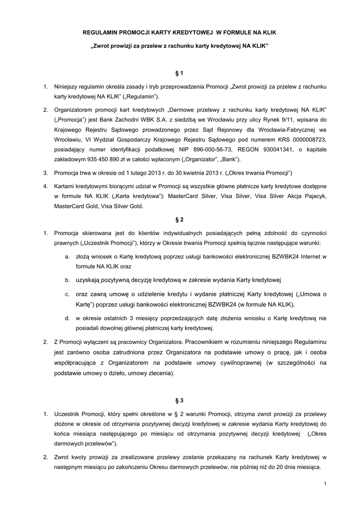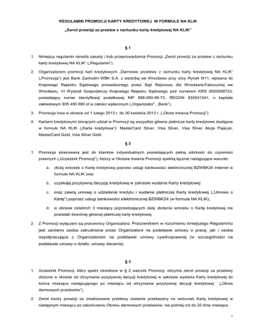 REGULAMIN PROMOCJI KARTY KREDYTOWEJ W FORMULE NA KLIK „Zwrot prowizji za przelew z rachunku karty kredytowej NA KLIK” §1 1. Niniejszy regulamin określa zasady i tryb przeprowadzenia Promocji „Zwrot prowizji za przelew z rachunku karty kredytowej NA KLIK” („Regulamin”). 2. Organizatorem promocji kart kredytowych „Darmowe przelewy z rachunku karty kredytowej NA KLIK” („Promocja”) jest Bank Zachodni WBK S.A. z siedzibą we Wrocławiu przy ulicy Rynek 9/11, wpisana do Krajowego Rejestru Sądowego prowadzonego przez Sąd Rejonowy dla Wrocławia-Fabrycznej we Wrocławiu, VI Wydział Gospodarczy Krajowego Rejestru Sądowego pod numerem KRS 0000008723, posiadający numer identyfikacji podatkowej NIP 896-000-56-73, REGON 930041341, o kapitale zakładowym 935 450 890 zł w całości wpłaconym („Organizator”, „Bank”). 3. Promocja trwa w okresie od 1 lutego 2013 r. do 30 kwietnia 2013 r. („Okres trwania Promocji”) 4. Kartami kredytowymi biorącymi udział w Promocji są wszystkie główne płatnicze karty kredytowe dostępne w formule NA KLIK („Karta kredytowa”): MasterCard Silver, Visa Silver, Visa Silver Akcja Pajacyk, MasterCard Gold, Visa Silver Gold. §2 1. Promocja skierowana jest do klientów indywidualnych posiadających pełną zdolność do czynności prawnych („Uczestnik Promocji”), którzy w Okresie trwania Promocji spełnią łącznie następujące warunki: a. złoŜą wniosek o Kartę kredytową poprzez usługi bankowości elektronicznej BZWBK24 Internet w formule NA KLIK oraz b. uzyskają pozytywną decyzję kredytową w zakresie wydania Karty kredytowej c. oraz zawrą umowę o udzielenie kredytu i wydanie płatniczej Karty kredytowej („Umowa o Kartę”) poprzez usługi bankowości elektronicznej BZWBK24 (w formule NA KLIK), d. w okresie ostatnich 3 miesięcy poprzedzających datę złoŜenia wniosku o Kartę kredytową nie posiadali dowolnej głównej płatniczej karty kredytowej. 2. Z Promocji wyłączeni są pracownicy Organizatora. Pracownikiem w rozumieniu niniejszego Regulaminu jest zarówno osoba zatrudniona przez Organizatora na podstawie umowy o pracę, jak i osoba współpracująca z Organizatorem na podstawie umowy cywilnoprawnej (w szczególności na podstawie umowy o dzieło, umowy zlecenia). §3 1. Uczestnik Promocji, który spełni określone w § 2 warunki Promocji, otrzyma zwrot prowizji za przelewy złoŜone w okresie od otrzymania pozytywnej decyzji kredytowej w zakresie wydania Karty kredytowej do końca miesiąca następującego po miesiącu od otrzymania pozytywnej decyzji kredytowej („Okres darmowych przelewów”). 2. Zwrot kwoty prowizji za zrealizowane przelewy zostanie przekazany na rachunek Karty kredytowej w następnym miesiącu po zakończeniu Okresu darmowych przelewów, nie później niŜ do 20 dnia miesiąca. 1 3. Promocją objęte są główne Karty kredytowe, o które wnioskowano poprzez Usługi Bankowości Elektronicznej (formuła NA KLIK). §4 1. Reklamacje dotyczące Promocji mogą być składane w dowolnym oddziale Banku lub placówce BZ WBK Partner lub telefonicznie dzwoniąc pod numer infolinii Banku 1 9999 (opłata wg stawek danego operatora) oraz za pośrednictwem strony www.bzwbk.pl 2. Reklamacja powinna zawierać: imię i nazwisko osoby zgłaszającej reklamację, numer płatniczej karty kredytowej, której dotyczy reklamacja, dokładny adres do korespondencji oraz opis i wskazanie przyczyny reklamacji. 3. Organizator rozpatrzy reklamację w ciągu 30 dni od dnia jej otrzymania oraz powiadomi o jej rozstrzygnięciu w formie pisemnej na adres podany przez osobę składającą reklamację. §5 1. Niniejszy Regulamin dostępny będzie w okresie od 1 lutego 2013 r. do 30 kwietnia 2013 r. na stronie internetowej www.bzwbk.pl/naklik oraz w kaŜdym oddziale Banku i kaŜdej placówce BZ WBK Partner. 2. Organizator jest odpowiedzialny za przeprowadzenie Promocji i jej prawidłowy przebieg. 3. Bank Zachodni WBK S.A., 50-950 Wrocław, Rynek 9/11, jako Organizator i administrator danych osobowych Uczestników Promocji zbiera dane Uczestników na zasadzie dobrowolności i będzie je przetwarzał w celu przeprowadzenia Promocji „Zwrot prowizji za przelew z rachunku karty kredytowej NA KLIK”. Uczestnikom Promocji przysługuje prawo dostępu do danych oraz prawo ich poprawiania. 4. Bank zastrzega sobie prawo do przedłuŜenia Promocji. 5. Oferta dotycząca usług i cen obowiązuje we wszystkich placówkach i obsługujących klientów jednostkach centralnych Banku Zachodniego WBK S.A., z wyłączeniem placówek i obsługujących klientów jednostek centralnych będących, przed dniem połączenia Banku Zachodniego WBK S.A. i Kredyt Banku S.A., placówkami i obsługujących klientów jednostkami centralnymi Kredyt Banku S.A. Lista tych placówek i obsługujących klientów jednostek centralnych dostępna jest pod adresem: www.bzwbk.pl. Aktualizacja tej listy odbywać się będzie poprzez publikację na stronach www.bzwbk.pl. 6. W sprawach nieuregulowanych w niniejszym Regulaminie zastosowanie mają powszechnie obowiązujące przepisy prawa. 7. Właściwym dla Organizatora organem nadzoru jest Komisja Nadzoru Finansowego. 8. Uczestnik Promocji moŜe zwrócić się o bezpłatną pomoc prawną do Miejskich lub Powiatowych Rzeczników Konsumenta. 9. Spory pomiędzy Uczestnikiem a Organizatorem mogą być rozstrzygane polubownie przed Arbitrem Bankowym przy Związku Banków Polskich, o ile wartość przedmiotu sporu nie jest wyŜsza niŜ 8000 zł. 2