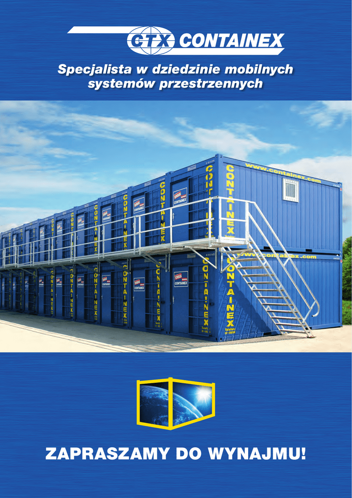 Specjalista w dziedzinie mobilnych systemów przestrzennych ZAPRASZAMY DO WYNAJMU! Specjalista w dziedzinie wynajmu mobilnych systemów przestrzennych Biura tymczasowe Obsługa techniczna Sklep z upominkami Kasa Szkoła nauki jazdy Hotel pracowniczy Typ BM 10’ •Sprawdzona jakość •Atrakcyjna cena wynajmu •Różnorodne warianty wyposażenia Typ BM 20’ Stoisko targowe Szkoła Zestawy sanitarne Kiosk Dla każdego zastosowania odpowiednie rozwiązanie przestrzenne Państwa korzyści: •Indywidualne dopasowywane w zależności od potrzeb •Doradztwo i planowanie na miejscu •Dostępne od ręki i gotowe do użytku Biuro budowlane i powierzchnie magazynowe Typ SA 10’ Kontenery na wynajem na każdą potrzebę •Możliwe moduły pojedyncze, systemy i połączenia kontenerów biurowych, sanitarnych i magazynowych •Dostosowanie modułów w zależności od potrzeb Typ SA 20’ •Dostępne od ręki dzięki flocie na wynajem, składającej się z ponad 25.000 jednostek •W doskonałym stanie używane kontenery na wynajem na pobliskim Państwu depozycie Typ LC 10’ Typ LC 20’ Przykładowe szkice Możliwe jest wiele innych wariantów i kombinacji Kontenery biurowe i zestawy Kontener sanitarny 20’ Kontener biurowy 10’ FR UT FR Kontener WC damski/męski 20’ E E E E E Kontener biurowy 20’ FR E Kontener prysznicowy 20’ Kontener biurowy - zestaw podwójny Kontenery magazynowe i morskie Zestawy kontenerowe - dowolna rozbudowa Kontener magazynowy 10’ Kontener morski 20’ Kontener magazynowy 20’ Kontener morski 40’ Kontenery sanitarne FR Kontener sanitarny 10’ Rzuty poziome dostępne w zależności od kraju Wybierzcie Państwo swoje wyposażenie dodatkowe "Przestrzeń do zaraz" w całej Europie 13 DEPOZYTÓW W POLSCE Ponad 120 depozytów w 25 krajach Biurko Kontener na rolkach - przystawka do biurka Fotel obrotowy CTX Wynajem bezpośredni Wynajem poprzez partnerów handlowych Szafka na dokumenty z drzwiami przesuwnymi Zestaw "biesiadny/piwny" doradztwo na miejscu Dostawa z depozytu w Państwa pobliżu Kompletny serwis Państwa korzyści: Krzesło Podwójna szafka BHP Klimatyzator •Różnorodne warianty wyposażenia •Szybka dostępność dzięki rozległej sieci magazynów w całej Europie •Dostawa samochodem ciężarowym z dźwigiem •Liczne usługi serwisowe, w tym montaż wykonywane są przez naszych certyfikowanych partnerów •„Made in EUROPE“ według standardów ekologicznych „GREEN technology“ firmy CONTAINEX Schody zewnętrzne Lodówka Aneks kuchenny Inne wersje wyposażenia dostępne są na zamówienie i mogą się różnić w zależności od kraju Szybki montaż CONTAINEX Container-Handelsgesellschaft m.b.H. AT-2355 Wiener Neudorf, IZ NÖ-Süd, Straße 14 Telefon: +48227164790, E-Mail: [email protected] www.containex.com
